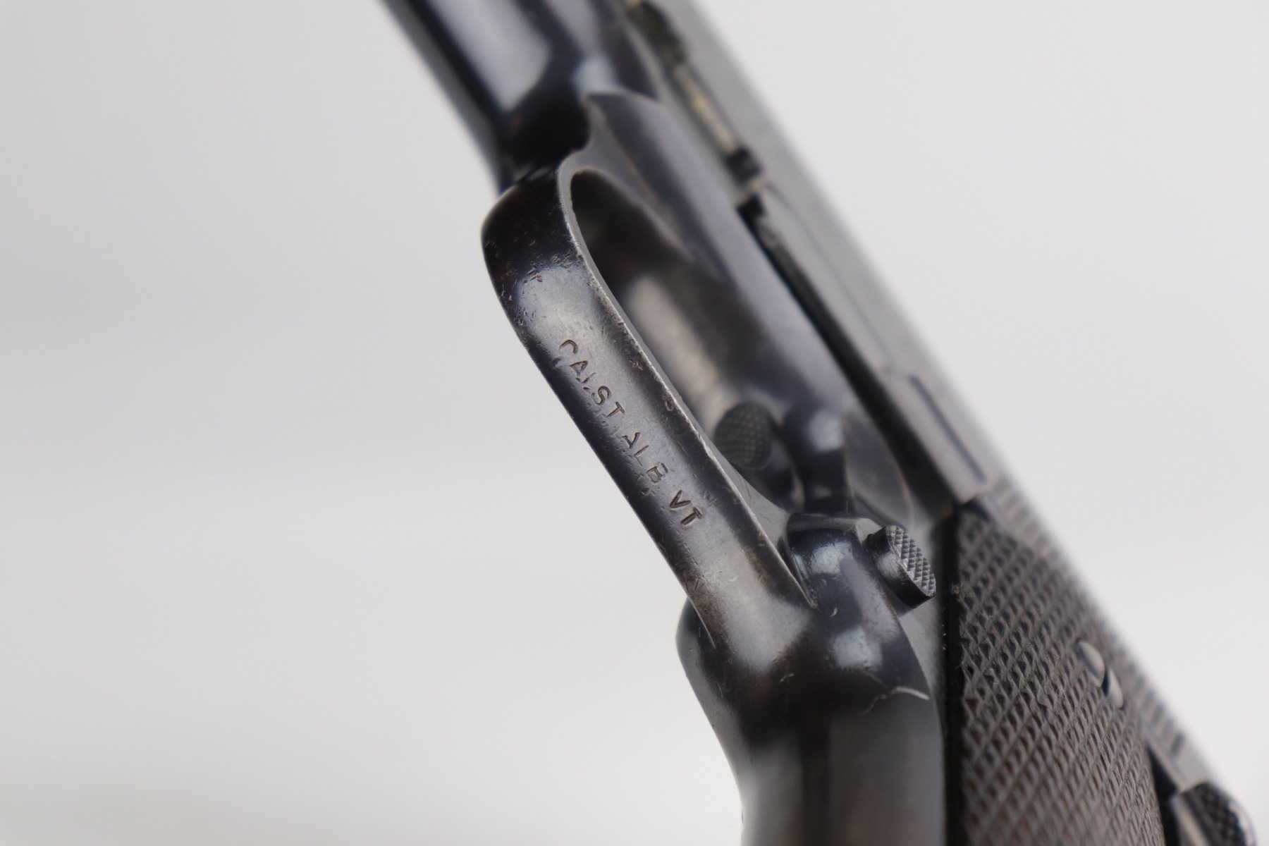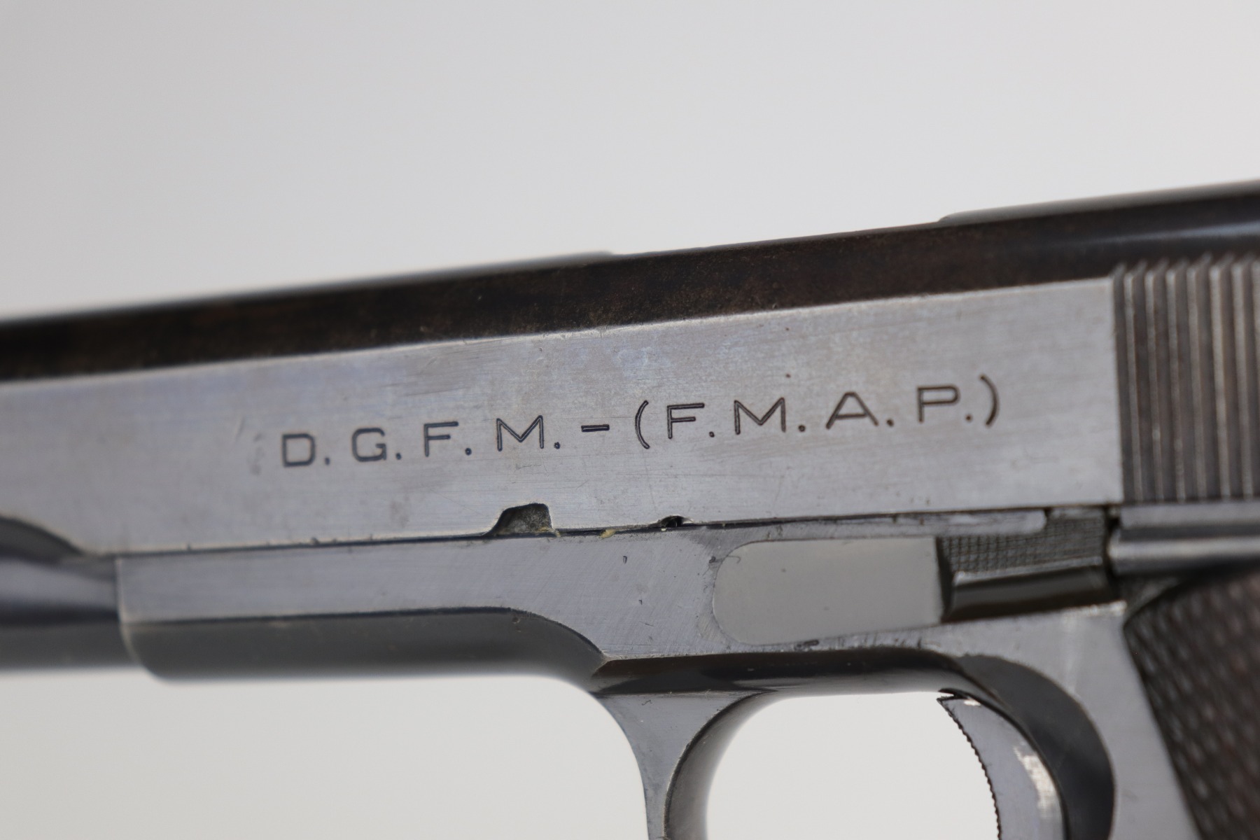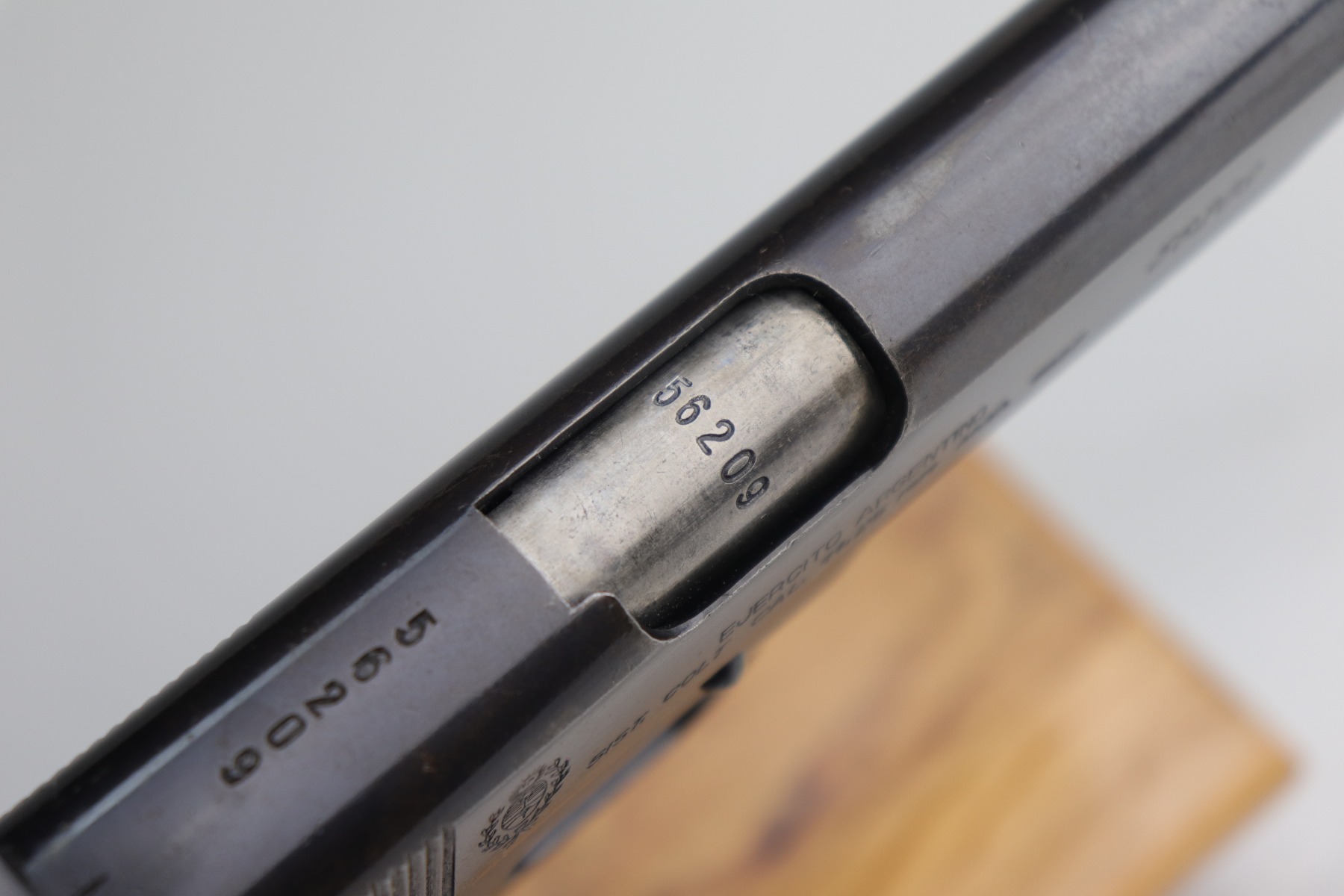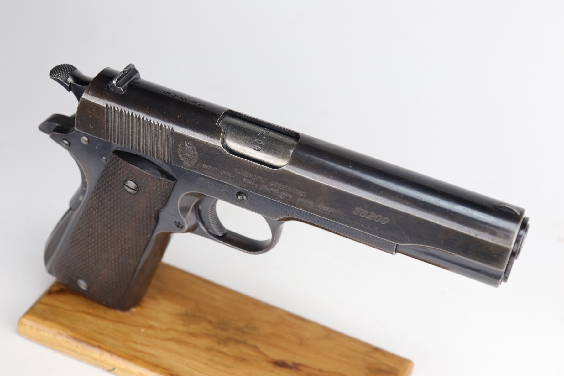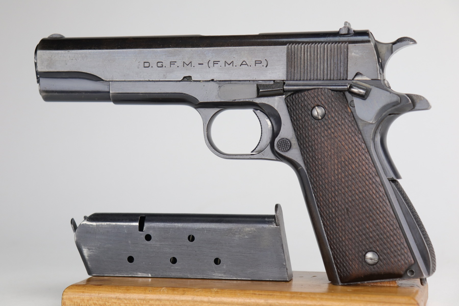 9/2/21 – This is a nice example of a DGRM Model 1927. This pistol was made in 1950 in Argentine and was a clone of the Colt 1911A1. It was issued to the Argentine military and was made by DGFM or “Direccion General de Faricanciones Militares”. This one is all matching and has an import mark on the underside of the trigger guard. It has retained roughly 85% of its finish. There is wear around the muzzle, high edges of the slide, and on the front strap. There are areas of thinning along the slide. There is a layer of visible brown patina throughout. It comes with excellent wood grips and a proper magazine. The bore is excellent – shiny with good rifling.