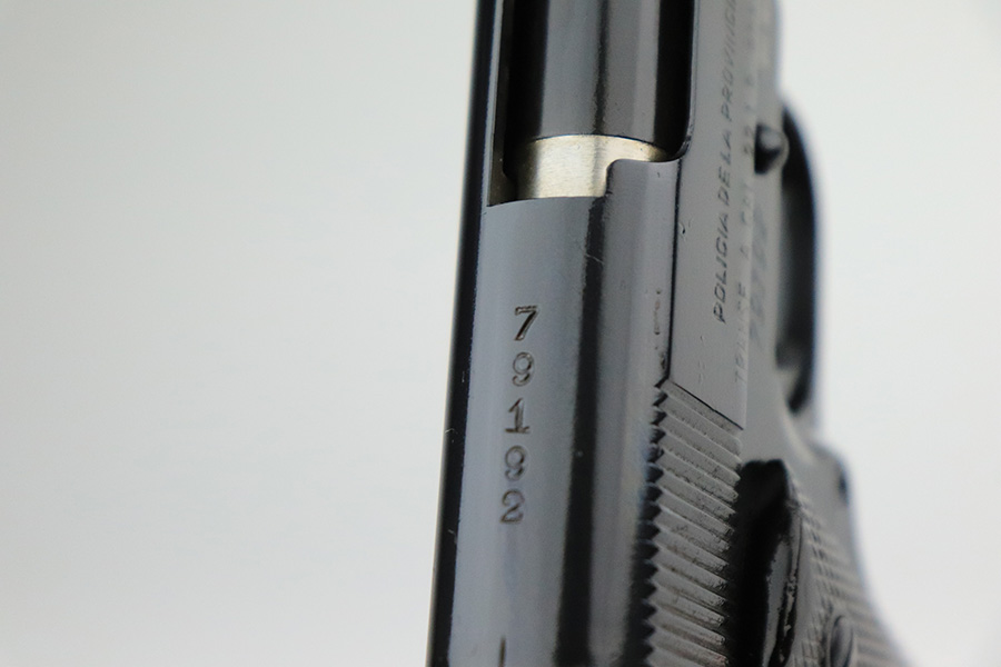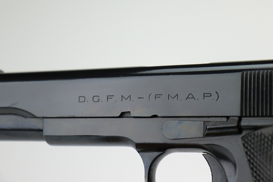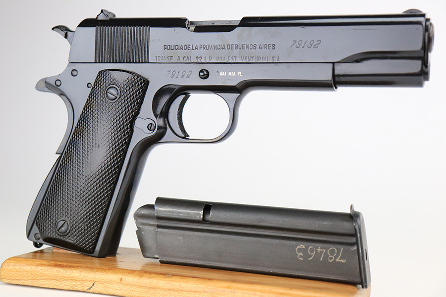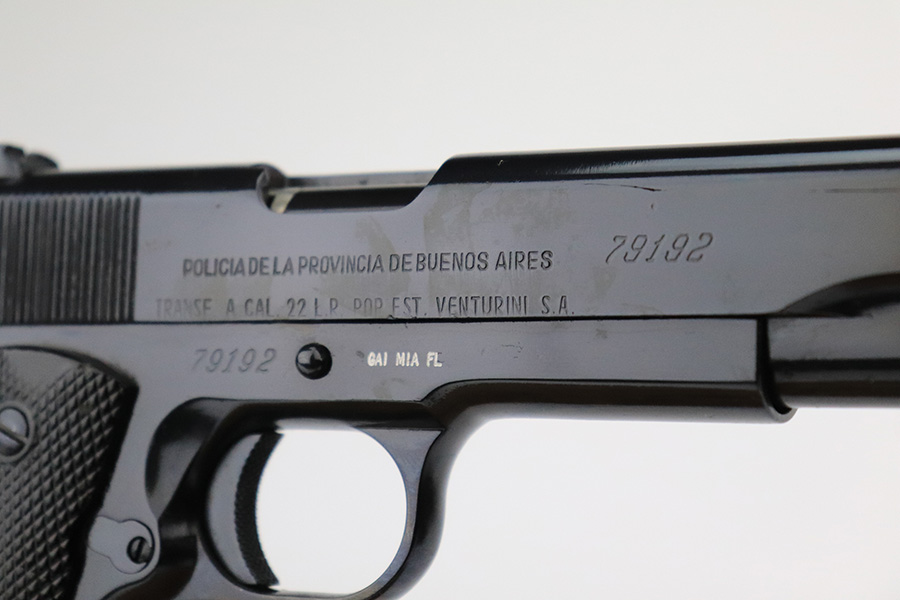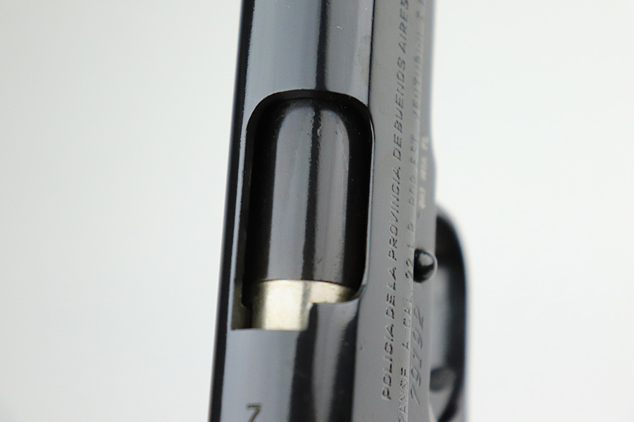 7/14/22 – This is a nice example of an Argentine copy of the Colt ACE, made by D.G.F.M. It was originally made for the Buenos Aires Provincial Police forces. It was later converted by the Argentines to fire .22 Long Rifle ammunition. Like the original Colt “Service Model Ace”, it uses a floating chamber barrel which amplifies the recoil of the little .22LR. This both increases functional reliability and also better simulates .45 caliber recoil for realistic training. The slide and frame match, and there is virtually no actual finish loss – it has been refinished. Import mark on the right side of the frame. Comes with fairly worn black plastic grips and a .22 caliber magazine. The bore has strong rifling with some light freckling here and there.