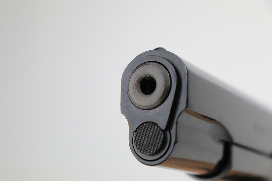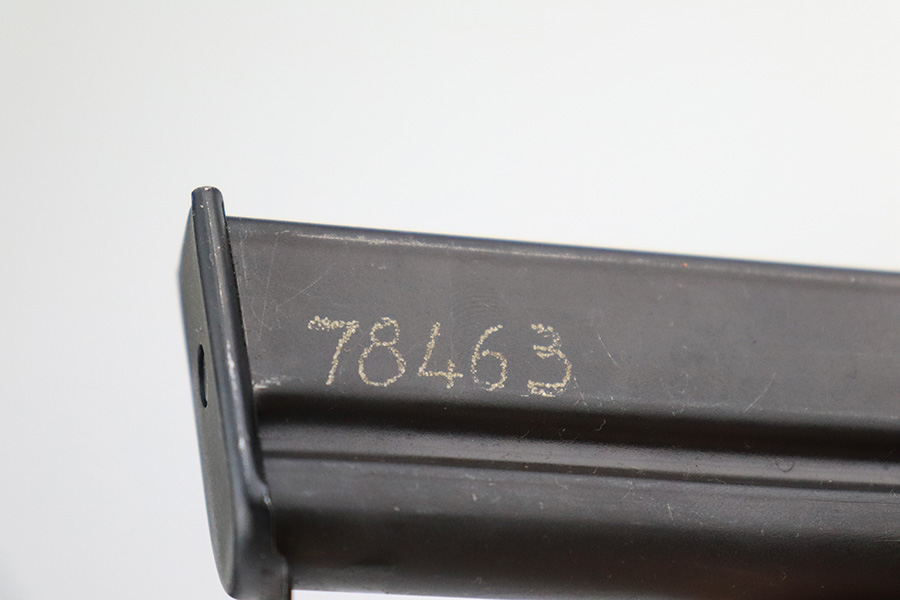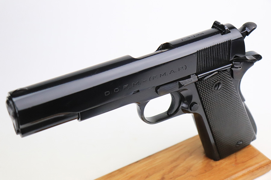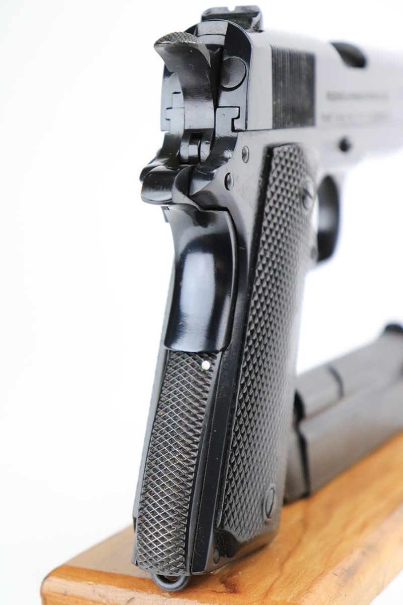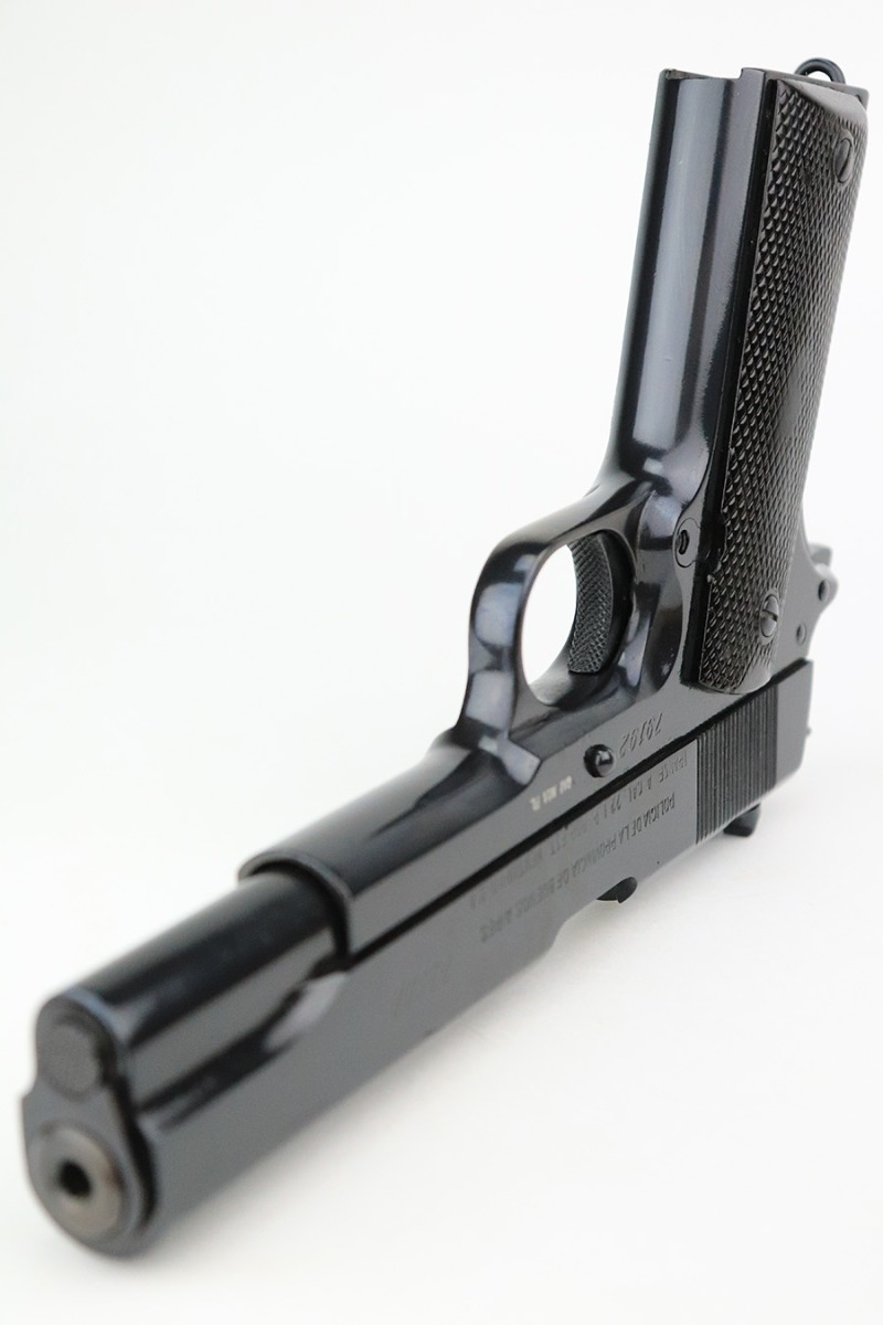 7/14/22 – This is a nice example of an Argentine copy of the Colt ACE, made by D.G.F.M. It was originally made for the Buenos Aires Provincial Police forces. It was later converted by the Argentines to fire .22 Long Rifle ammunition. Like the original Colt “Service Model Ace”, it uses a floating chamber barrel which amplifies the recoil of the little .22LR. This both increases functional reliability and also better simulates .45 caliber recoil for realistic training. The slide and frame match, and there is virtually no actual finish loss – it has been refinished. Import mark on the right side of the frame. Comes with fairly worn black plastic grips and a .22 caliber magazine. The bore has strong rifling with some light freckling here and there.