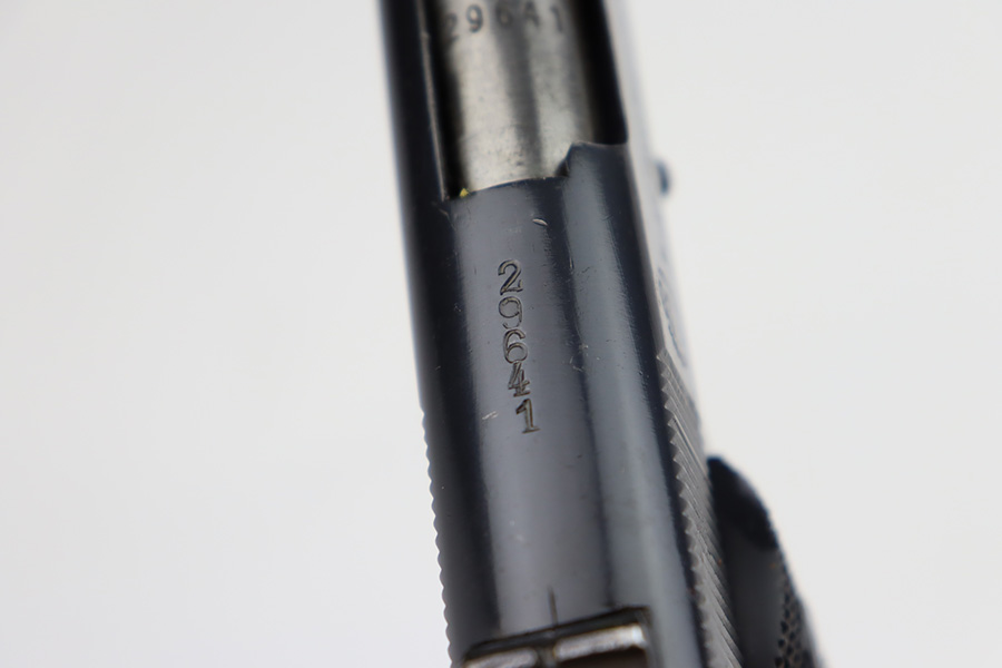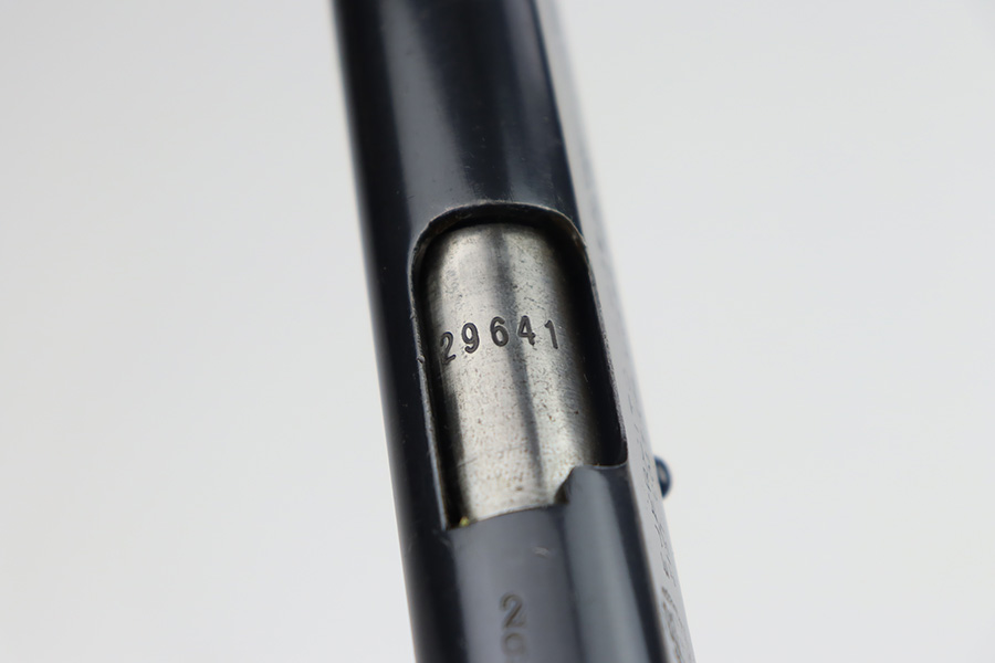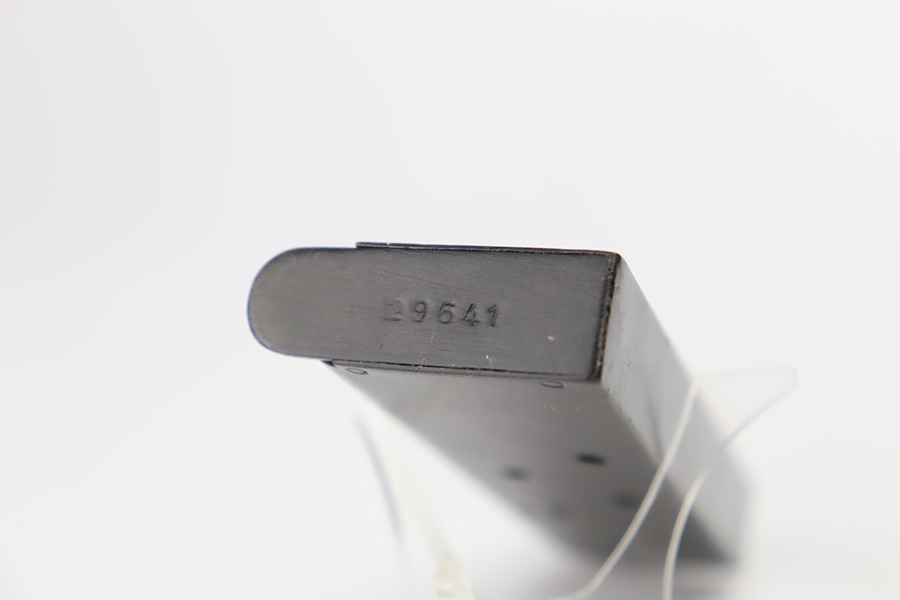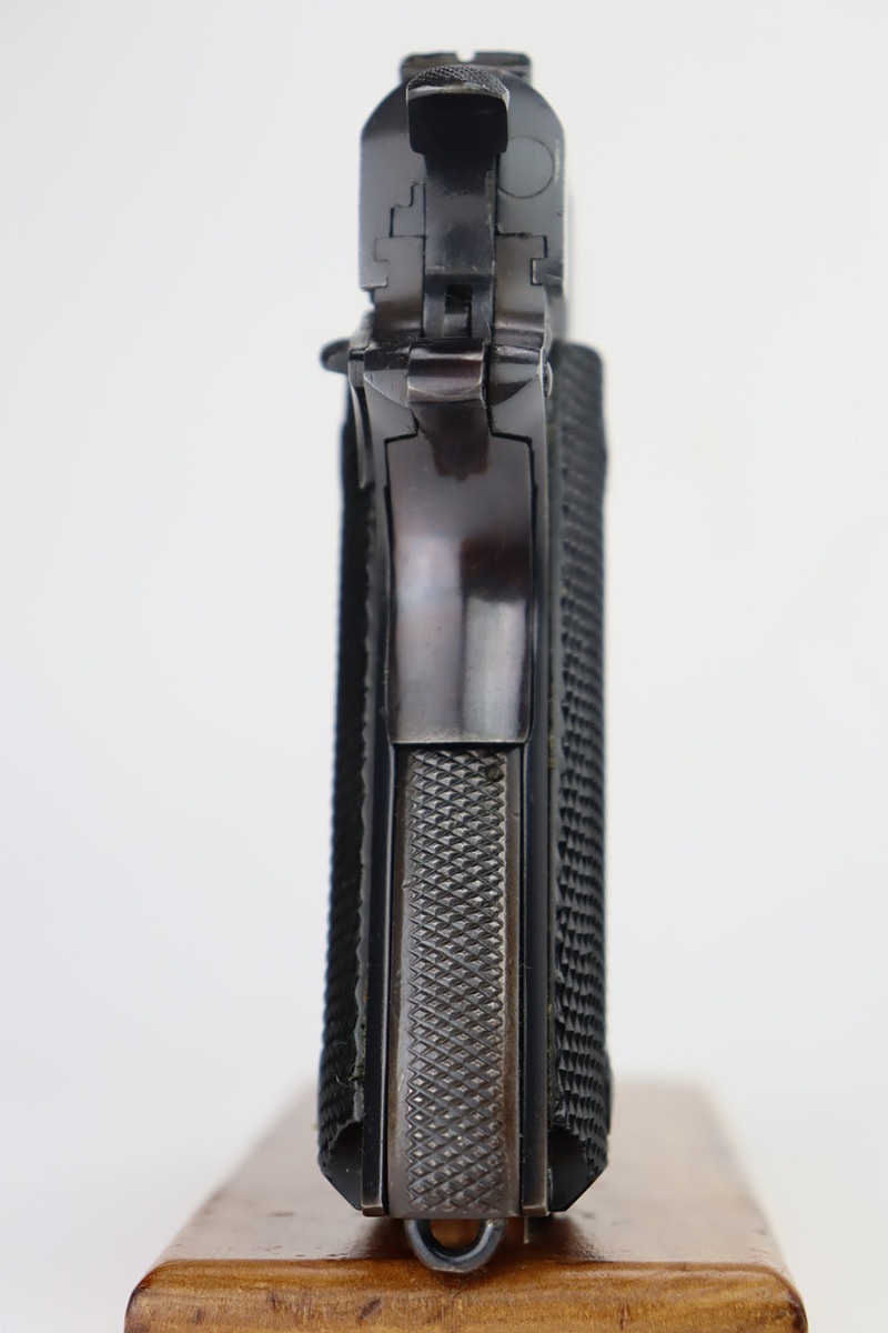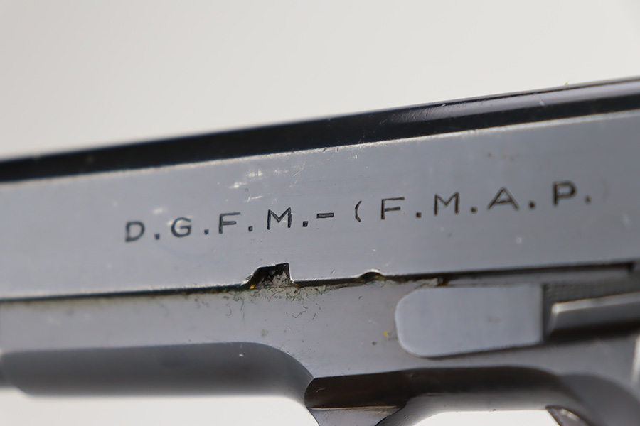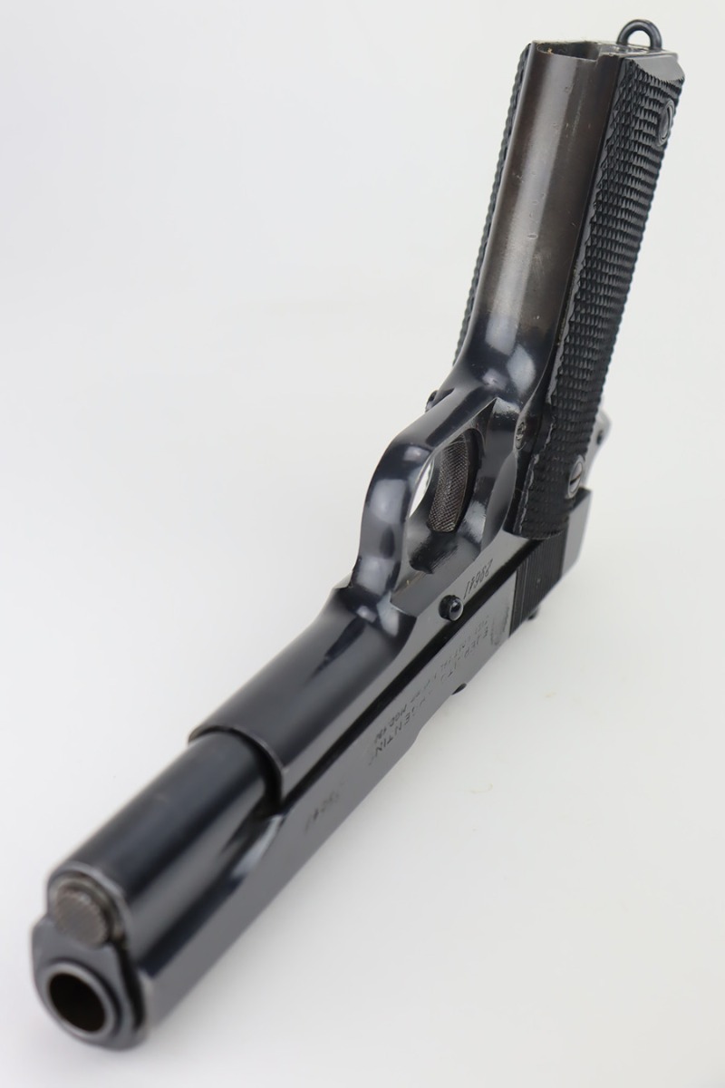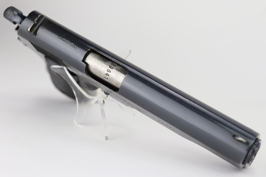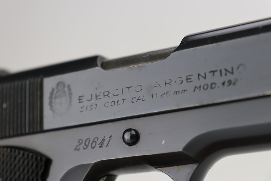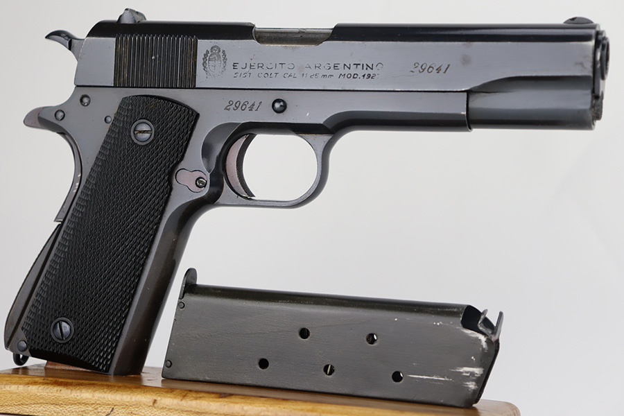 9/21/23 – This is a very nice example of an Argentine 1911A1 DGFM Model 1927 issued to the Argentine military around 1945. It is all matching and has the proper Argentine crest. No import marks. Comes with one matching-numbered magazine. It has retained about 93% of its bluing. There is minor wear around the muzzle and on the high edges of the slide. Some minor dulling on the front strap. Tiny scratches and handling marks here and there. Fitted with black plastic grips. The bore has great rifling with just very minor frosting in the grooves.