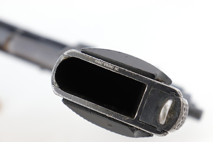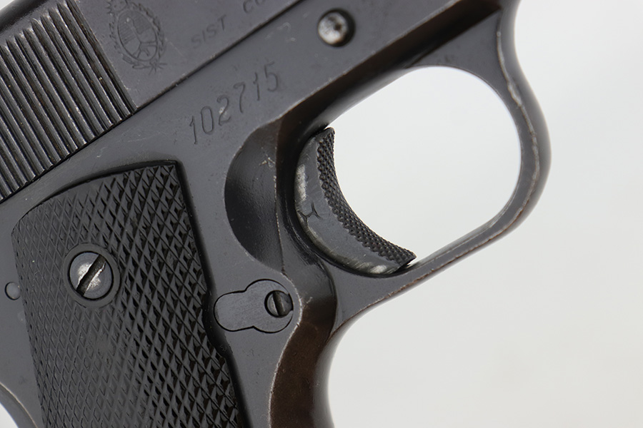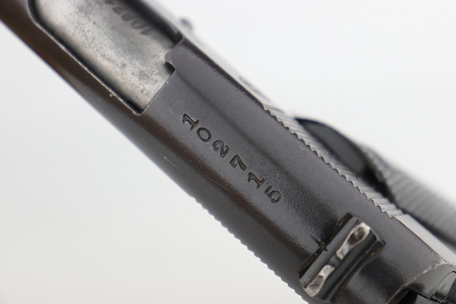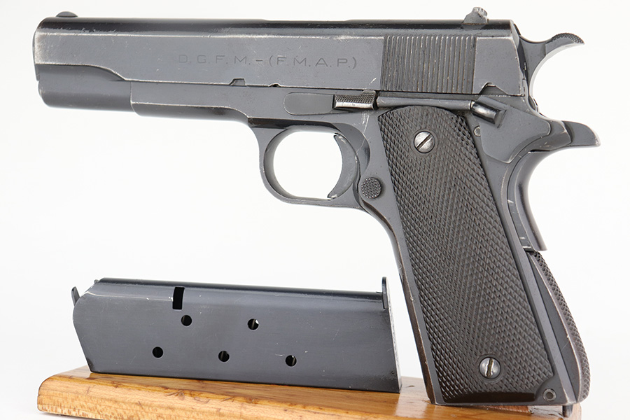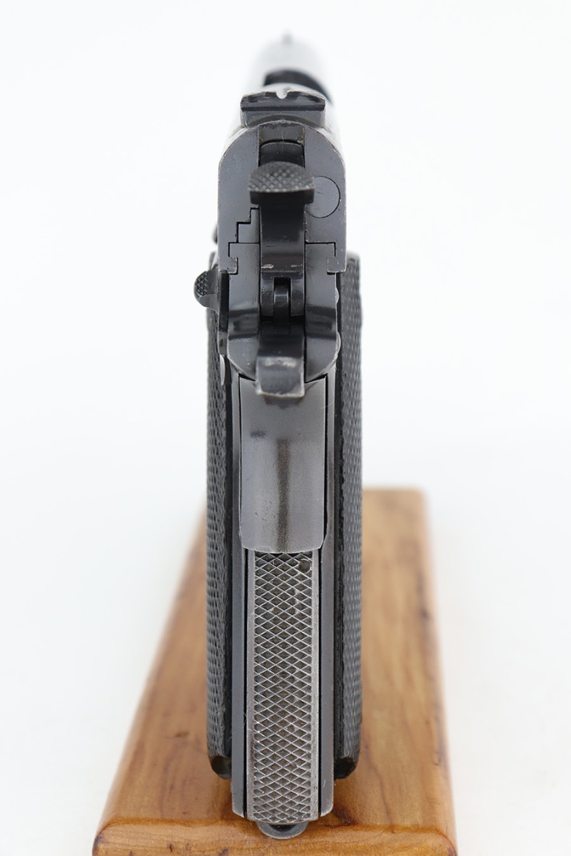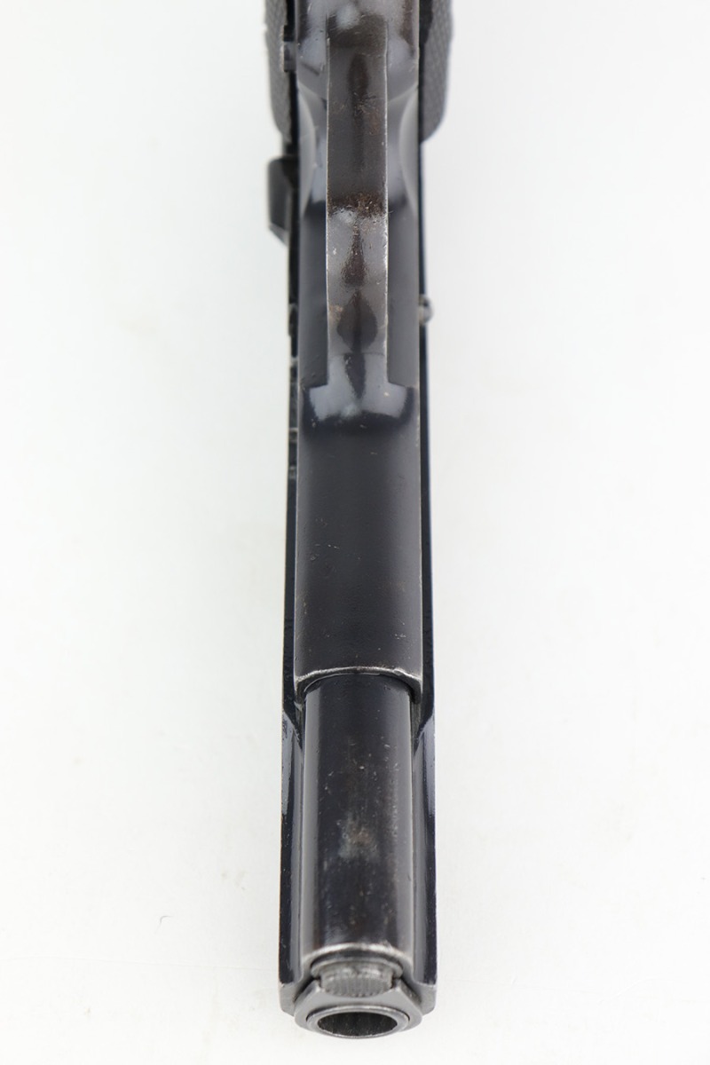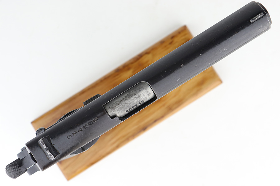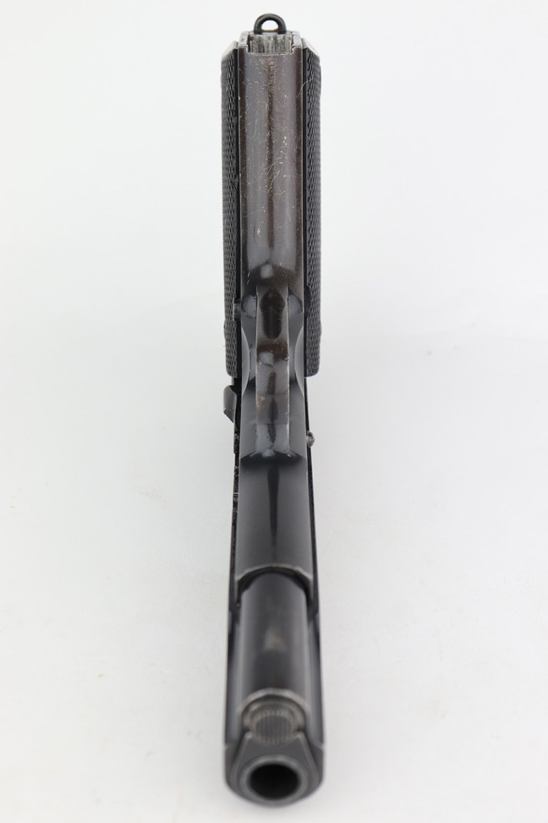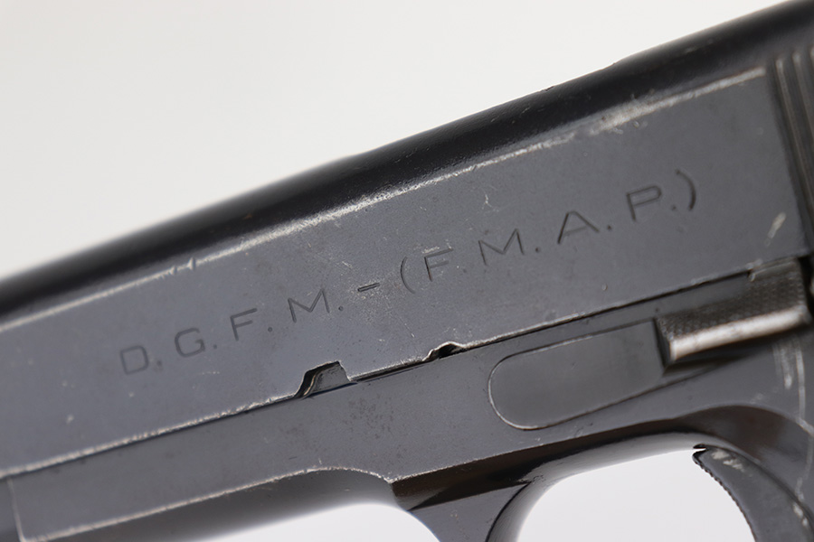 12/19/22 – This DGFM Model 1927 issued to the Argentine Navy after WW2. It has the “Marina De Guerra” navy marking on the right side of the slide. This one is all matching but has a tiny import mark on the very bottom of the frame. It has retained about 95% of its finish. There is minor wear around the muzzle and high edges of the slide and some light scratchy wear on the front strap. Comes with excellent black plastic grips and one reproduction magazine. Near-mint bore.