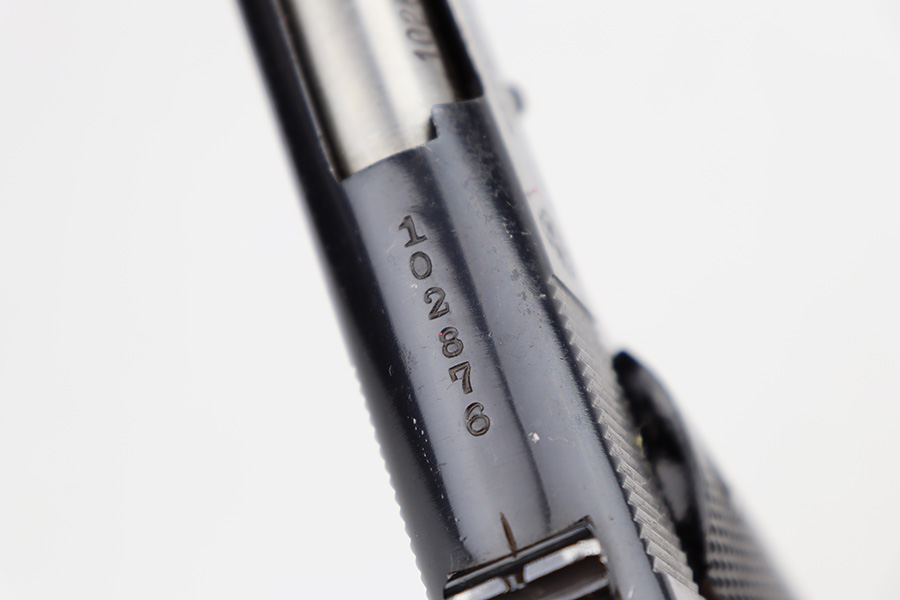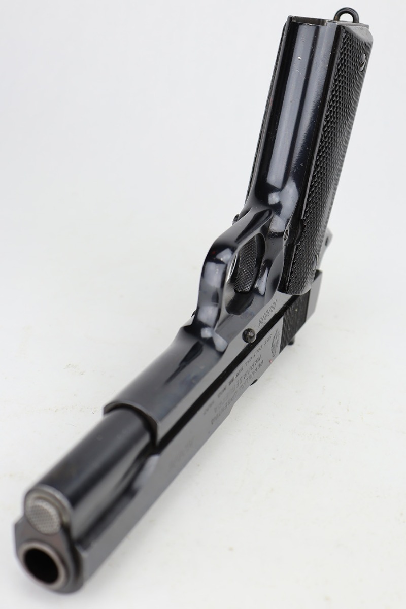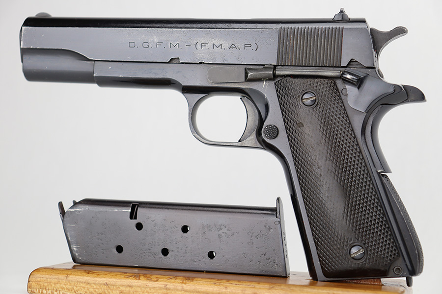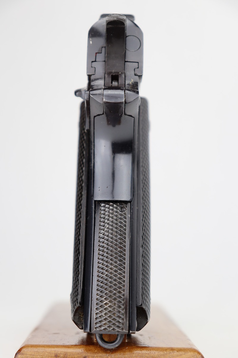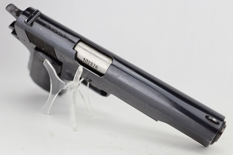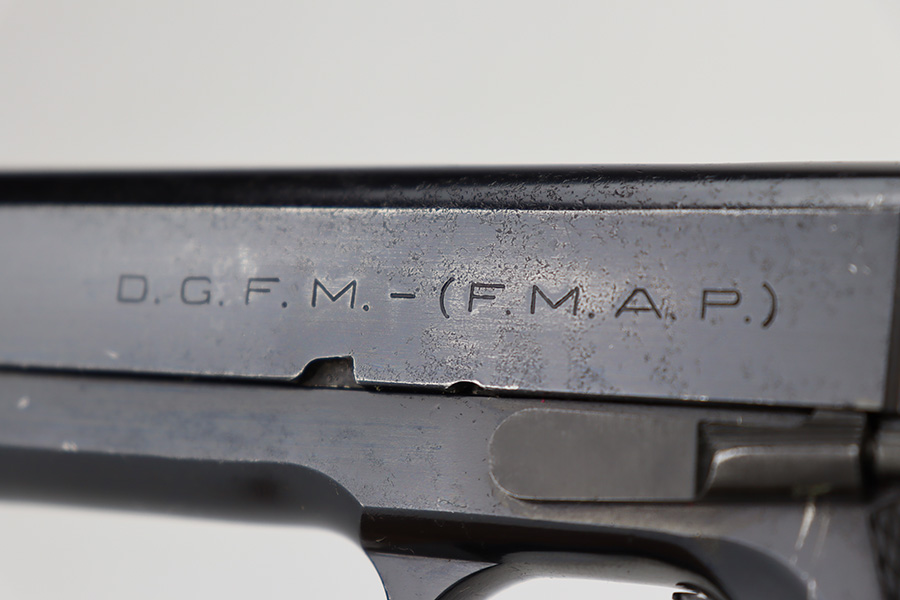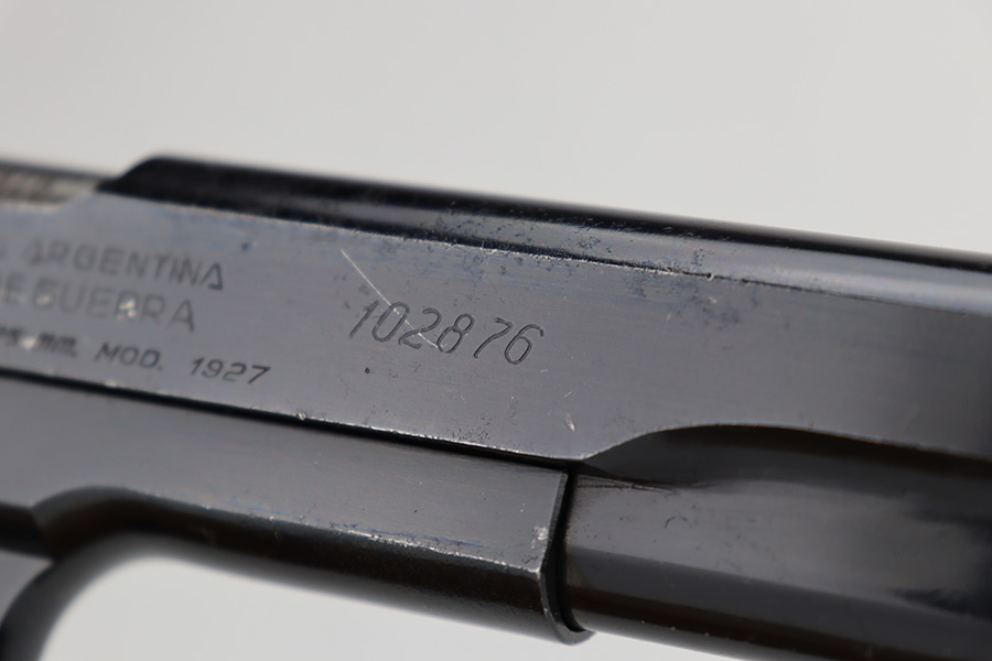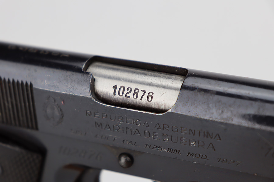 6/12/23 – This is a DGFM Model 1927 issued to the Argentine Navy after WW2. It has the “Marina De Guerra” navy marking on the right side of the slide. This one is all matching but has a tiny import mark on the very bottom of the frame. The entire gun has been refinished. There is very little actual finish loss, but there is pin-pricking on most of the slide and some tiny handling marks here and there. Fitted with fairly worn black plastic grips. Comes with a numbered magazine, but it does not match the gun. Excellent bore with strong rifling.