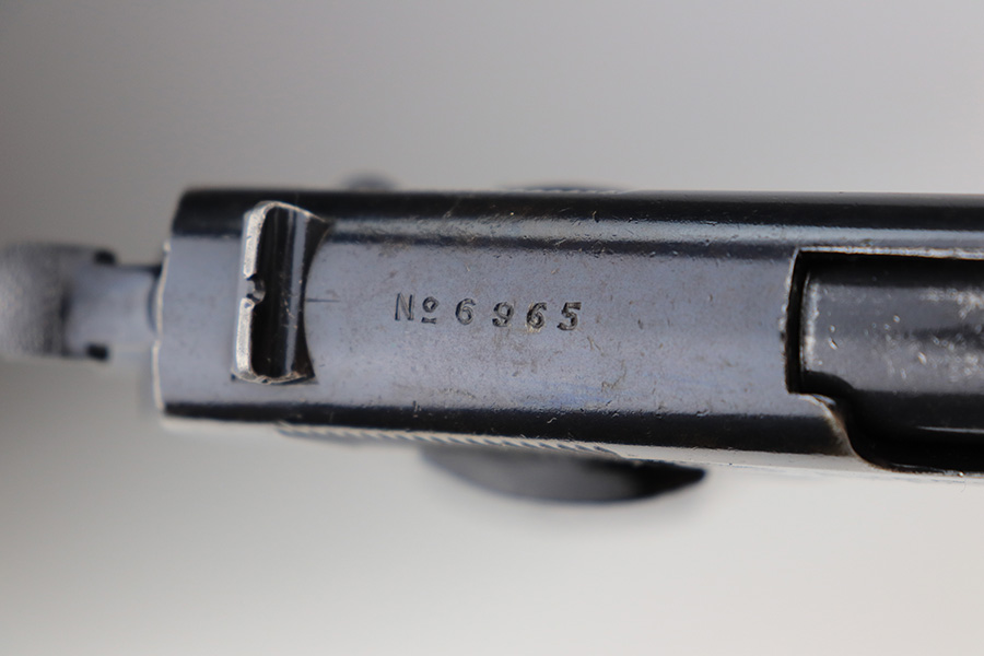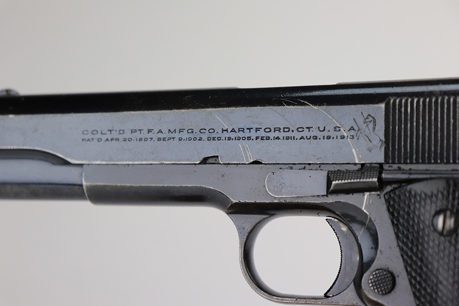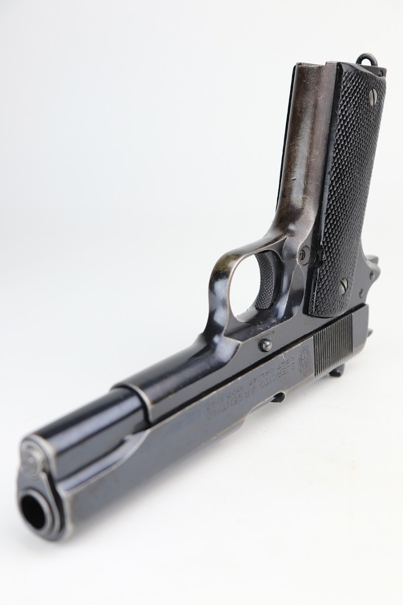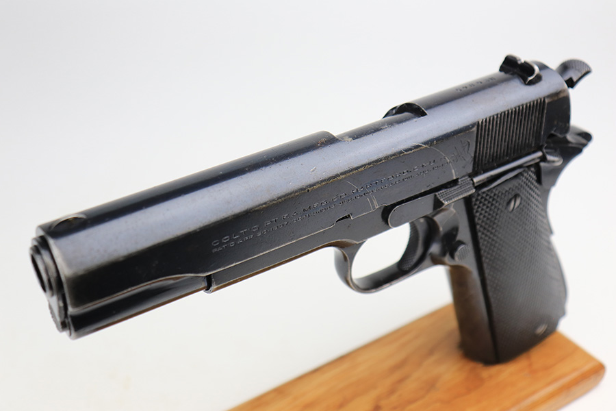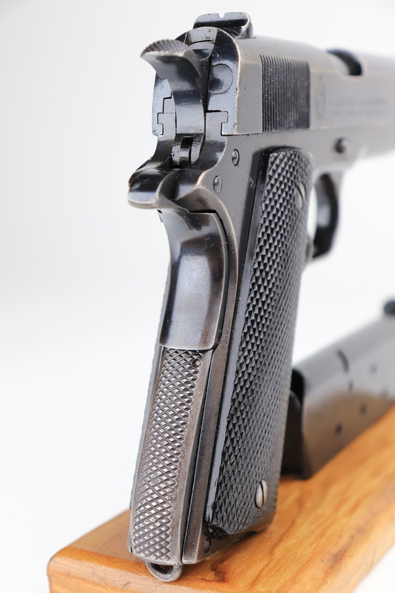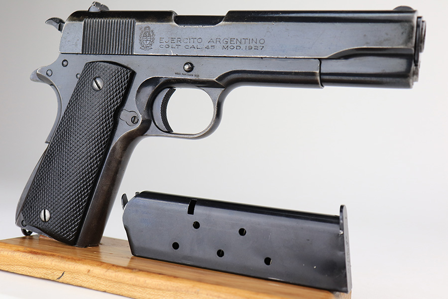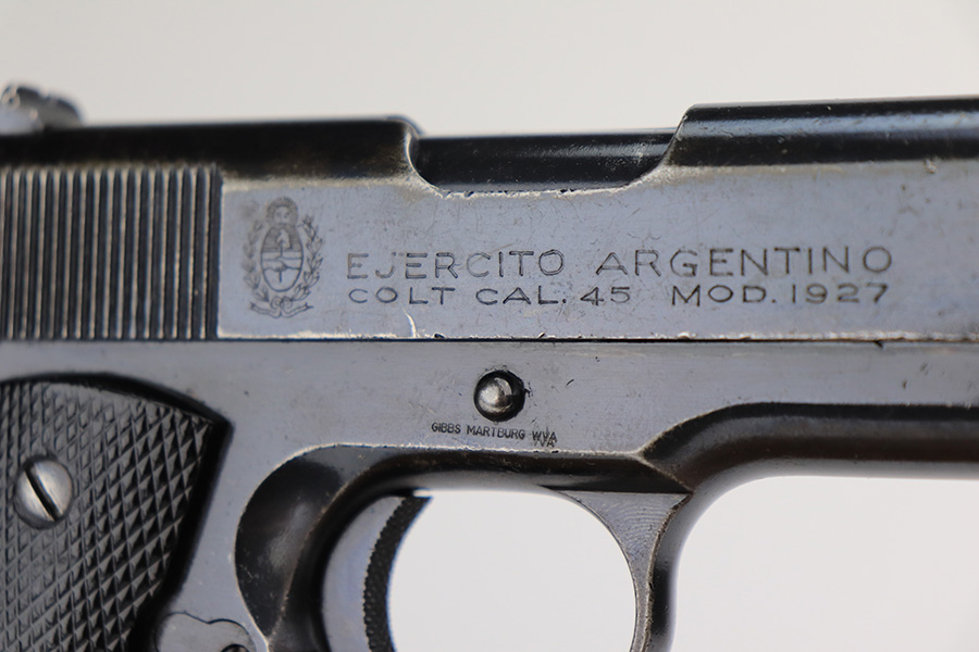 4/19/22 – This is a very nice example of a M1911A1 made by Colt for the Argentine Government in 1927-28. This is an “Ejercito” variation, characterized by the Colt slide legend on the left side of the slide and “Ejercito Argentino Colt Cal. 45 Mod. 1927” on the right side of the slide. It is serialized on the top of the slide and on the frame under the main spring housing. These serial numbers are mismatched. The barrel is un-numbered. Tiny import mark on the right side of the frame. It has retained somewhere between 85-90% of its finish. Most of the wear is on the front strap, but there is also wear around the high edges of the slide, around the muzzle, and on the underside of the trigger. Some light scratches on the left side of the gun from the takedown lever. Some tiny dings on the right side of the frame on the opposite side of the takedown lever. Comes with slightly worn black plastic grips and one reproduction magazine. The bore is very nice with great rifling.