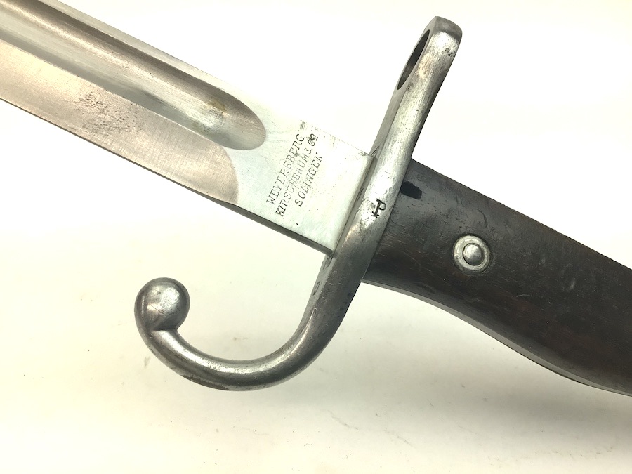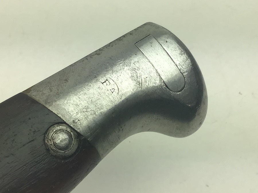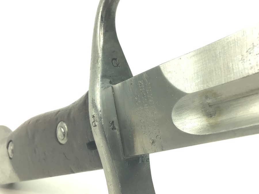 5/27/22 – Original and great condition. 1909 Mauser Argentine bayonet manufactured by Weyersburg , Kirschbaum and Co. Solingen. The 15-3/4″ blade is bright with no damage or corrosion. No evidence of sharpening. SN B8098 with matching scabbard. The ricasso area shows a distinct Argentine crest, which is somewhat un-common, as the Argentine government ordered the crest to be removed or defaced on surplus sale weapons. The wood grips are tight with no cracks. The scabbard has no paint loss or damage. Stamped “SA” on the finial. Overall a beautiful piece.