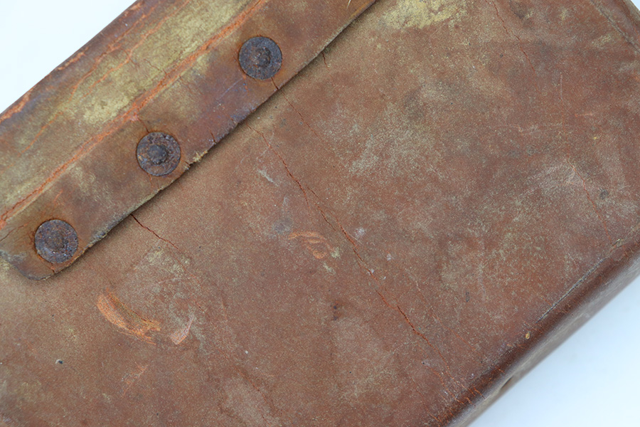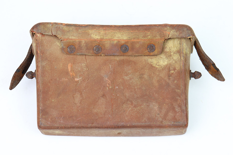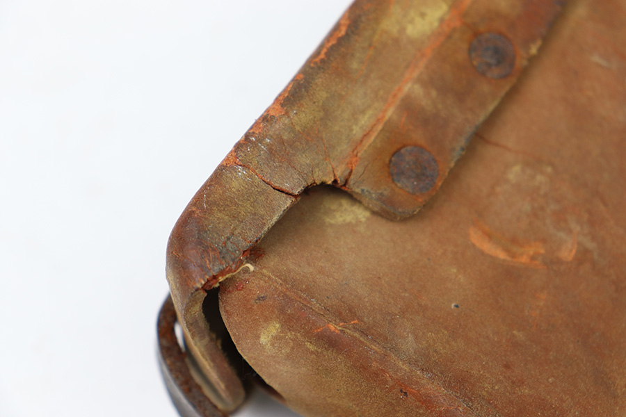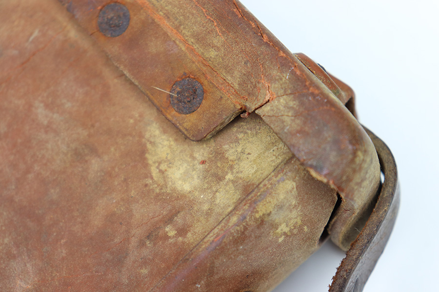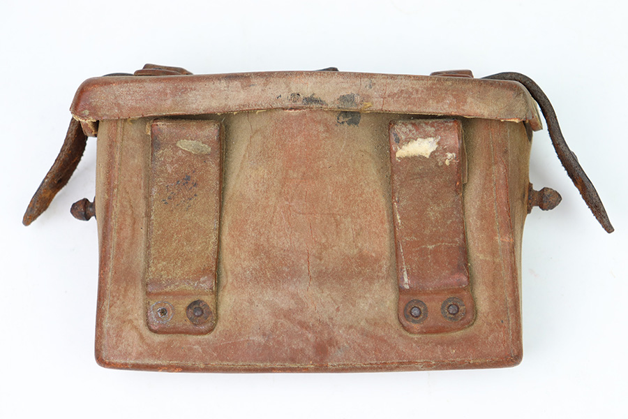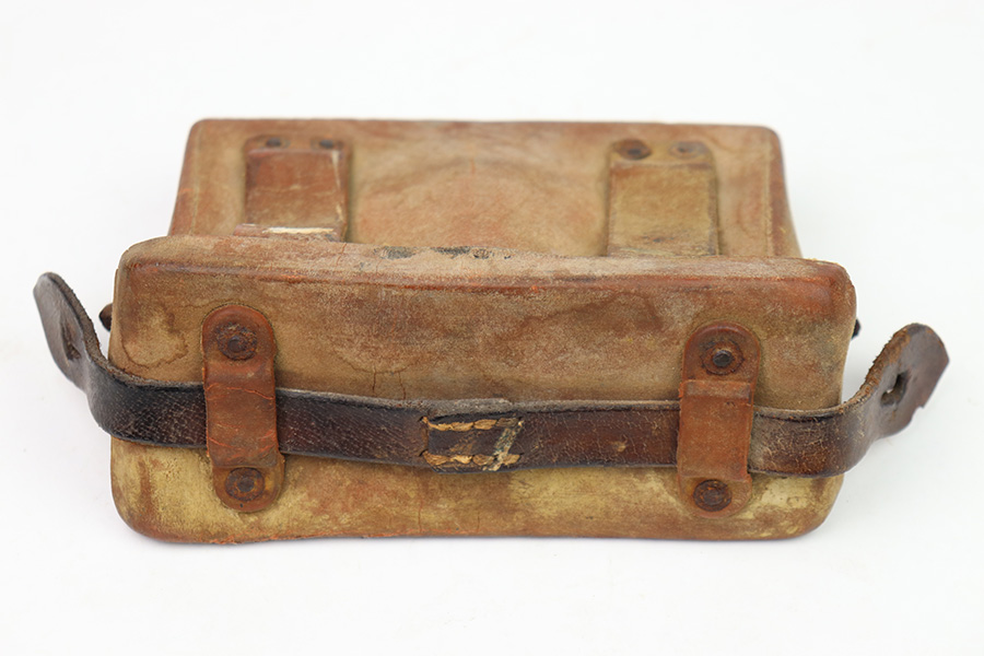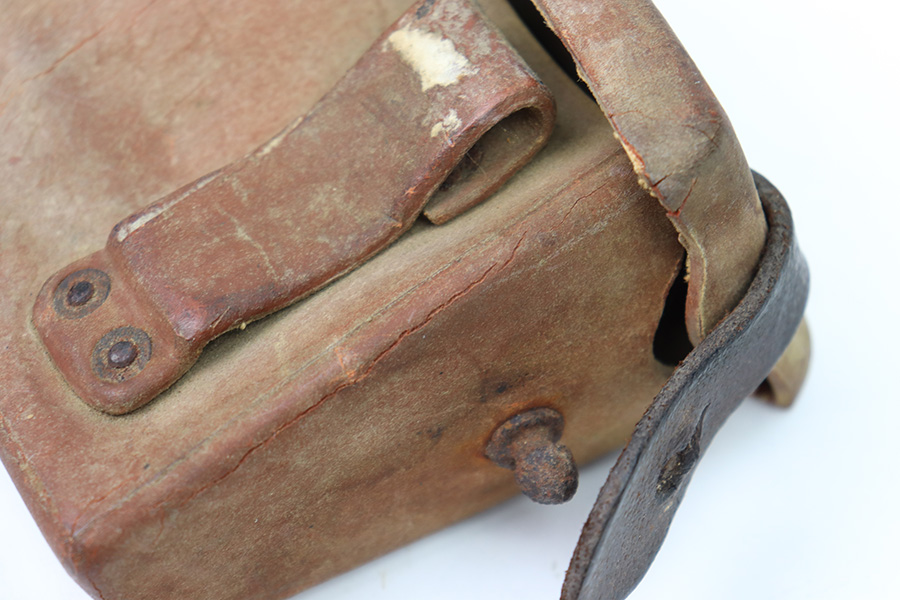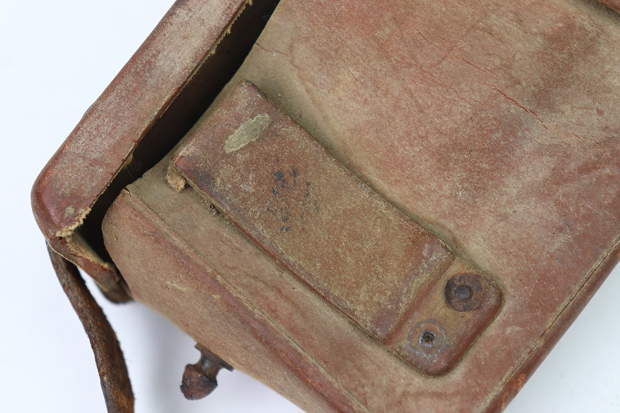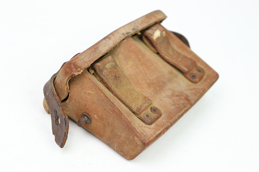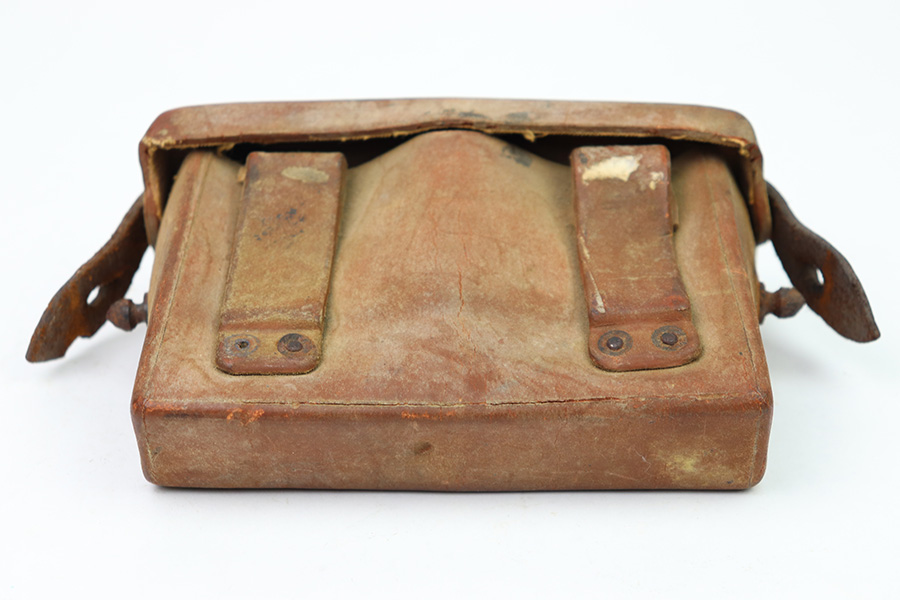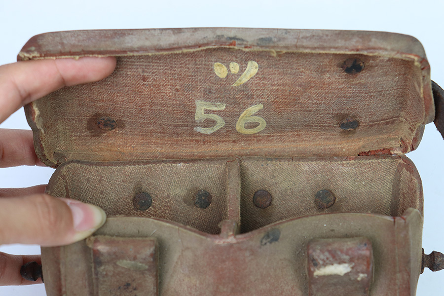 8/30/22 – This is an original WW2 era production Japanese Arisaka Rifle ammo / field pouch. This leather pouch is in good overall condition with hardened leather and rivets. The rivets all have surface rust as shown, but are intact and secure. There’s some surface cracking and mild wear throughout the pouch. The interior lid has a faint, small maker stamp. There’s also a large number “56” written on the interior, as shown.