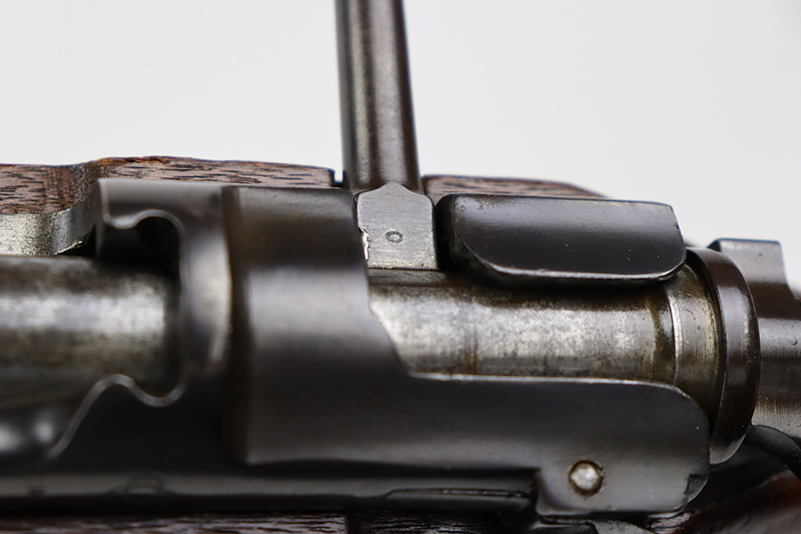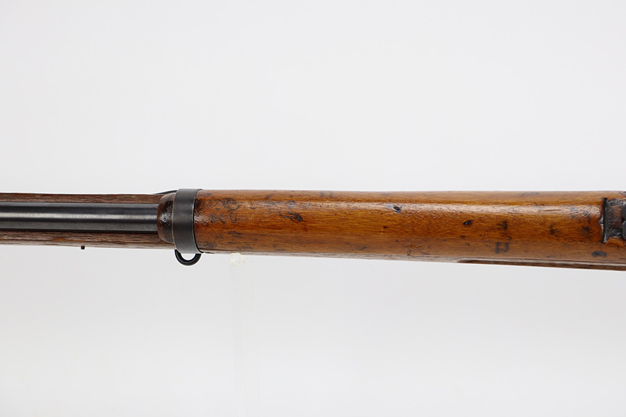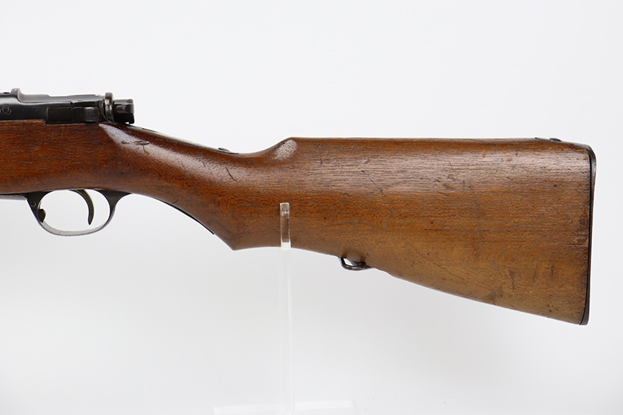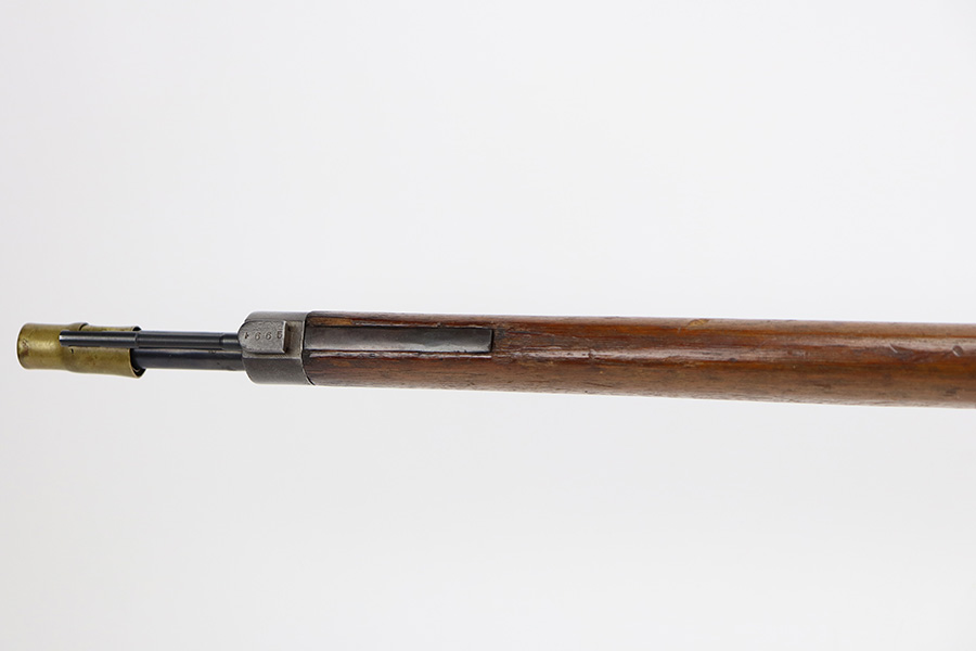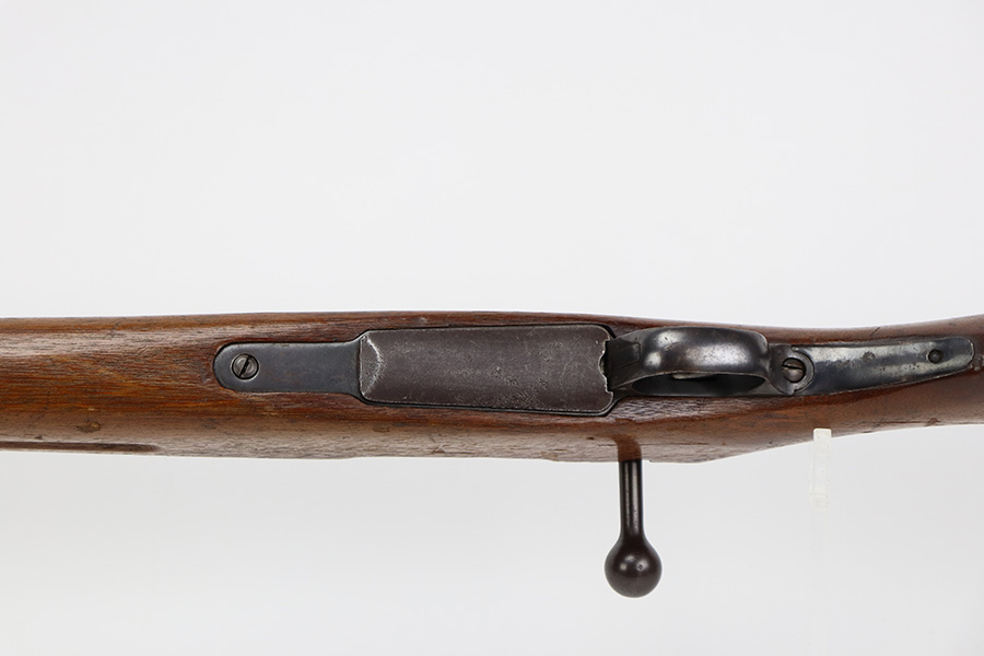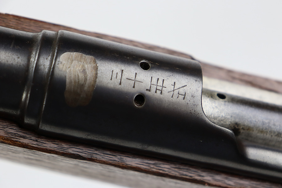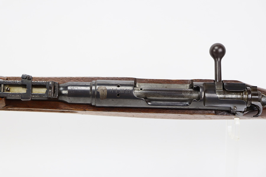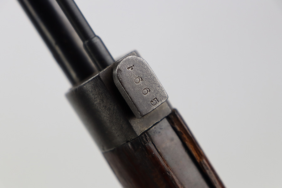 9/12/23 – This is a nice example of an Arisaka Type 30 rifle with a “Hook” Safety. Most people are familiar with the Type 38 Arisaka, which was one of the two very distinctive Japanese rifles of World War II (along with the Type 99). The Type 38 was an outstanding rifle in large part because it was the result of several years of experience and development which began in 1897 with the Type 30 “Hook Safety” Arisaka. This first Japanese smallbore military rifle was designed by a committee (led by Col. Arisaka) from the best elements of other rifles being made at the time. It used a bolt which was significantly more complex than the elegant Type 38 bolt which would follow later. This one is mismatched and has a ground Imperial mum stamp on the receiver. The metal parts have retained about 93% of their finish. There is general high edge wear, some thinning on the front barrel band, very light freckling on the receiver, and some patina and pitting on the floor plate. The wood furniture shows the typical signs of wear. The bore has light surface oxidation and minor pitting throughout. Comes with brass muzzle cap.