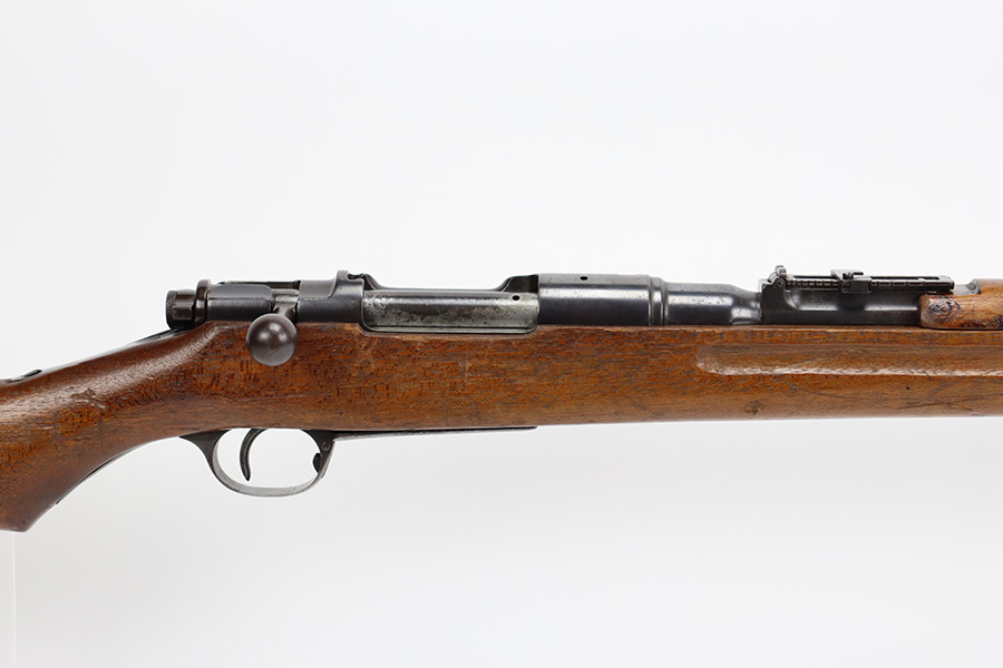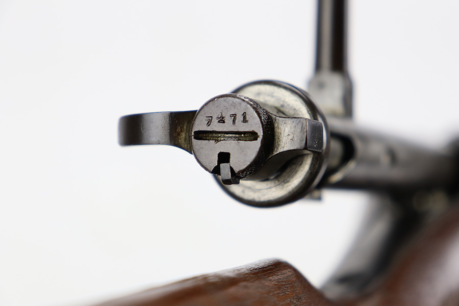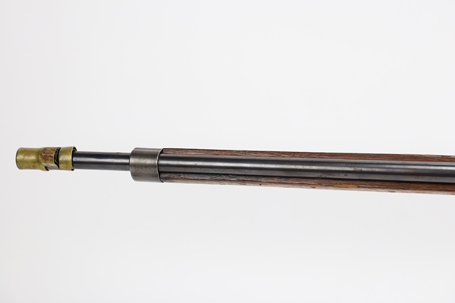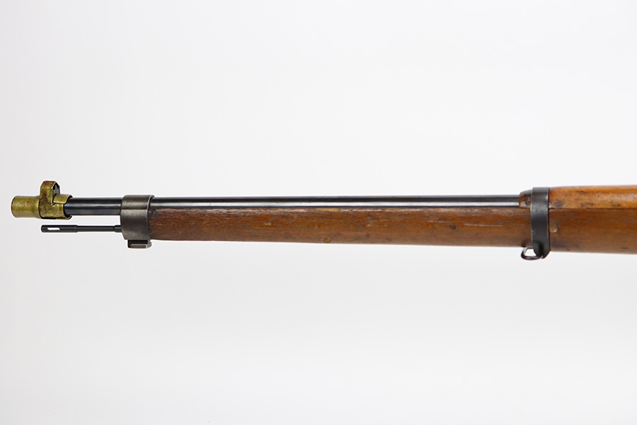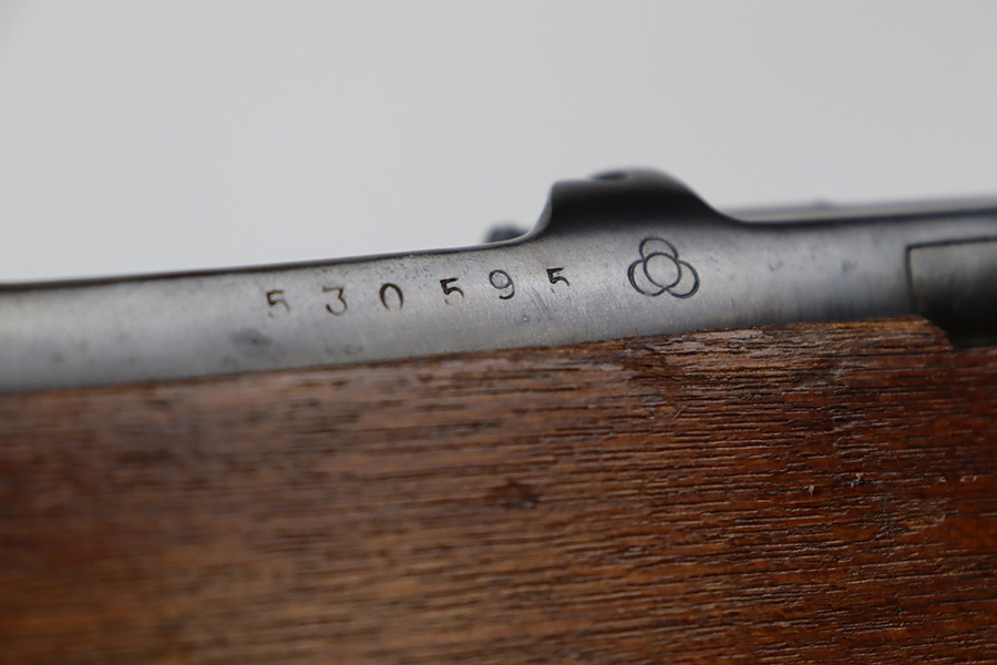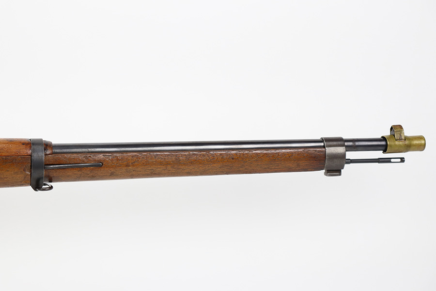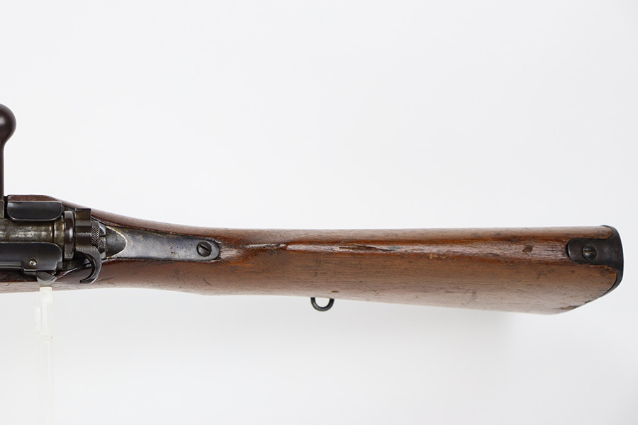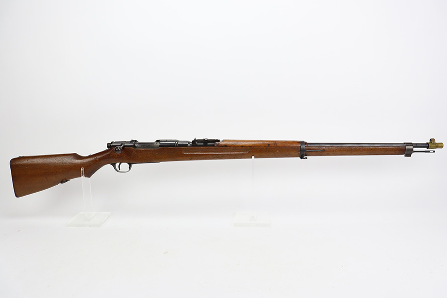 9/12/23 – This is a nice example of an Arisaka Type 30 rifle with a “Hook” Safety. Most people are familiar with the Type 38 Arisaka, which was one of the two very distinctive Japanese rifles of World War II (along with the Type 99). The Type 38 was an outstanding rifle in large part because it was the result of several years of experience and development which began in 1897 with the Type 30 “Hook Safety” Arisaka. This first Japanese smallbore military rifle was designed by a committee (led by Col. Arisaka) from the best elements of other rifles being made at the time. It used a bolt which was significantly more complex than the elegant Type 38 bolt which would follow later. This one is mismatched and has a ground Imperial mum stamp on the receiver. The metal parts have retained about 93% of their finish. There is general high edge wear, some thinning on the front barrel band, very light freckling on the receiver, and some patina and pitting on the floor plate. The wood furniture shows the typical signs of wear. The bore has light surface oxidation and minor pitting throughout. Comes with brass muzzle cap.