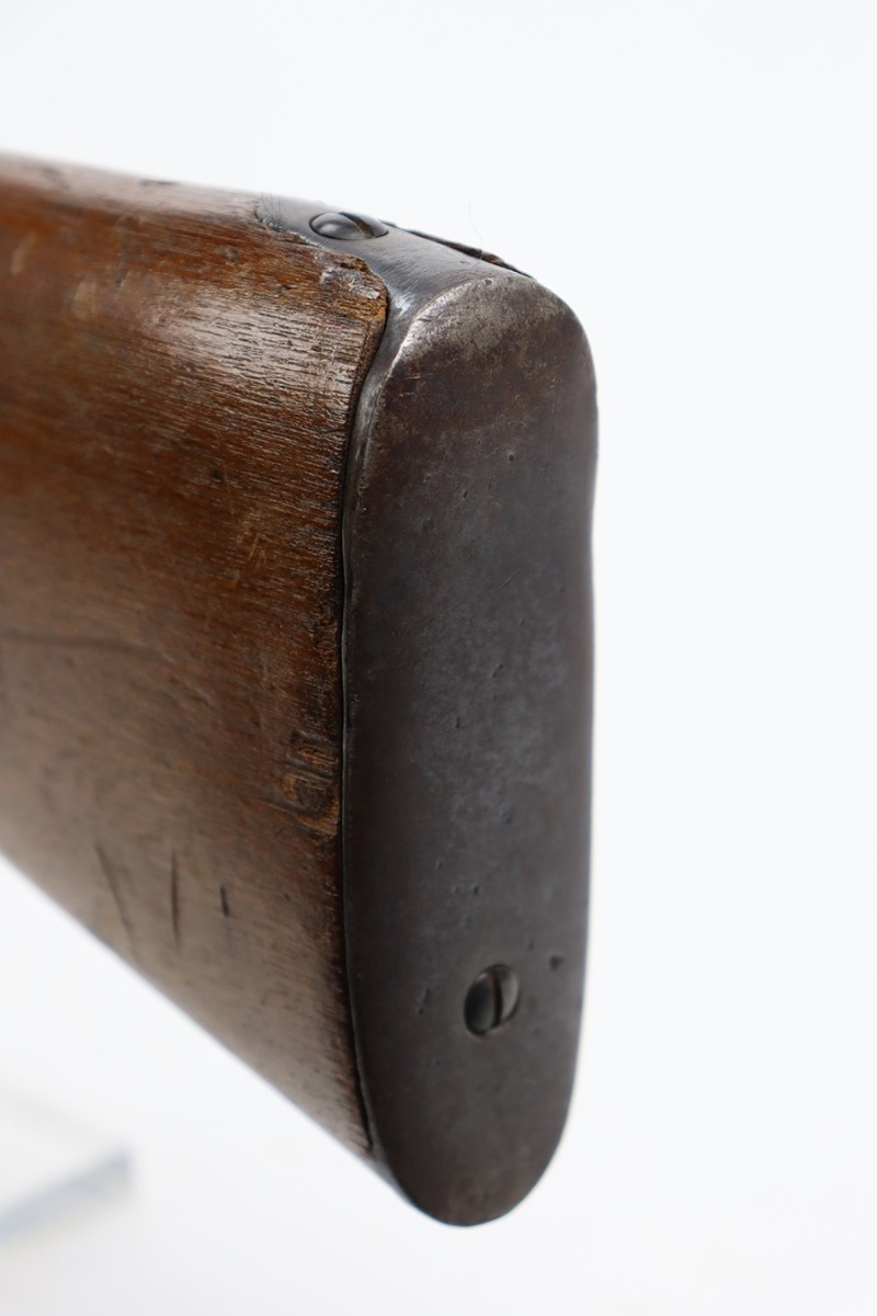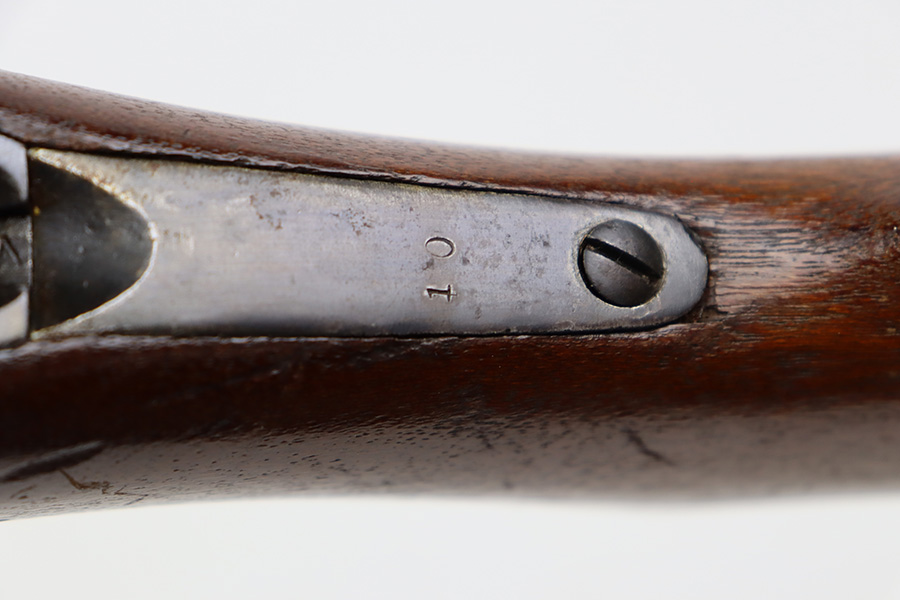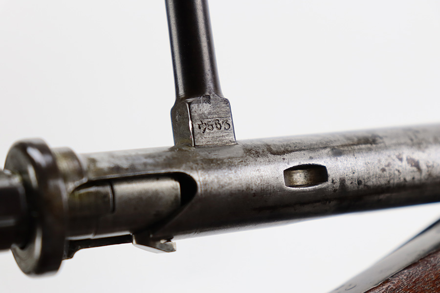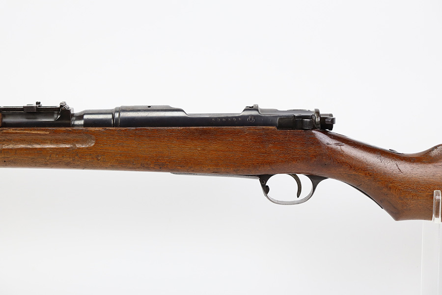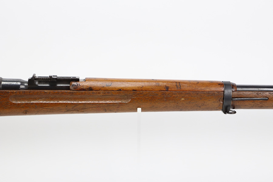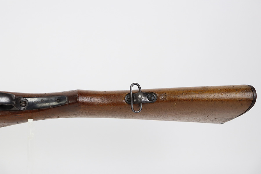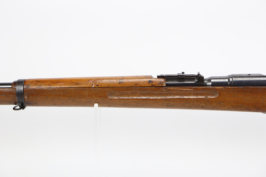 9/12/23 – This is a nice example of an Arisaka Type 30 rifle with a “Hook” Safety. Most people are familiar with the Type 38 Arisaka, which was one of the two very distinctive Japanese rifles of World War II (along with the Type 99). The Type 38 was an outstanding rifle in large part because it was the result of several years of experience and development which began in 1897 with the Type 30 “Hook Safety” Arisaka. This first Japanese smallbore military rifle was designed by a committee (led by Col. Arisaka) from the best elements of other rifles being made at the time. It used a bolt which was significantly more complex than the elegant Type 38 bolt which would follow later. This one is mismatched and has a ground Imperial mum stamp on the receiver. The metal parts have retained about 93% of their finish. There is general high edge wear, some thinning on the front barrel band, very light freckling on the receiver, and some patina and pitting on the floor plate. The wood furniture shows the typical signs of wear. The bore has light surface oxidation and minor pitting throughout. Comes with brass muzzle cap.