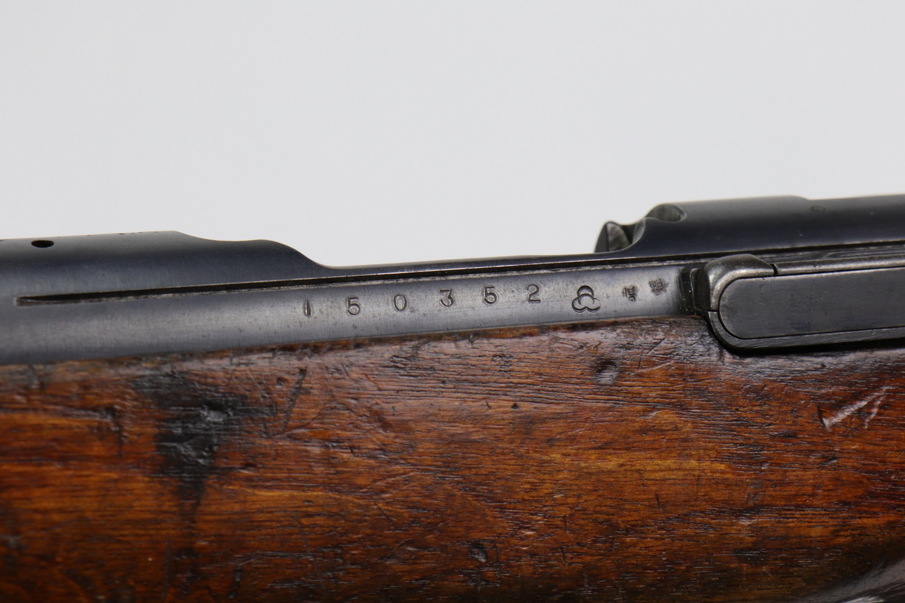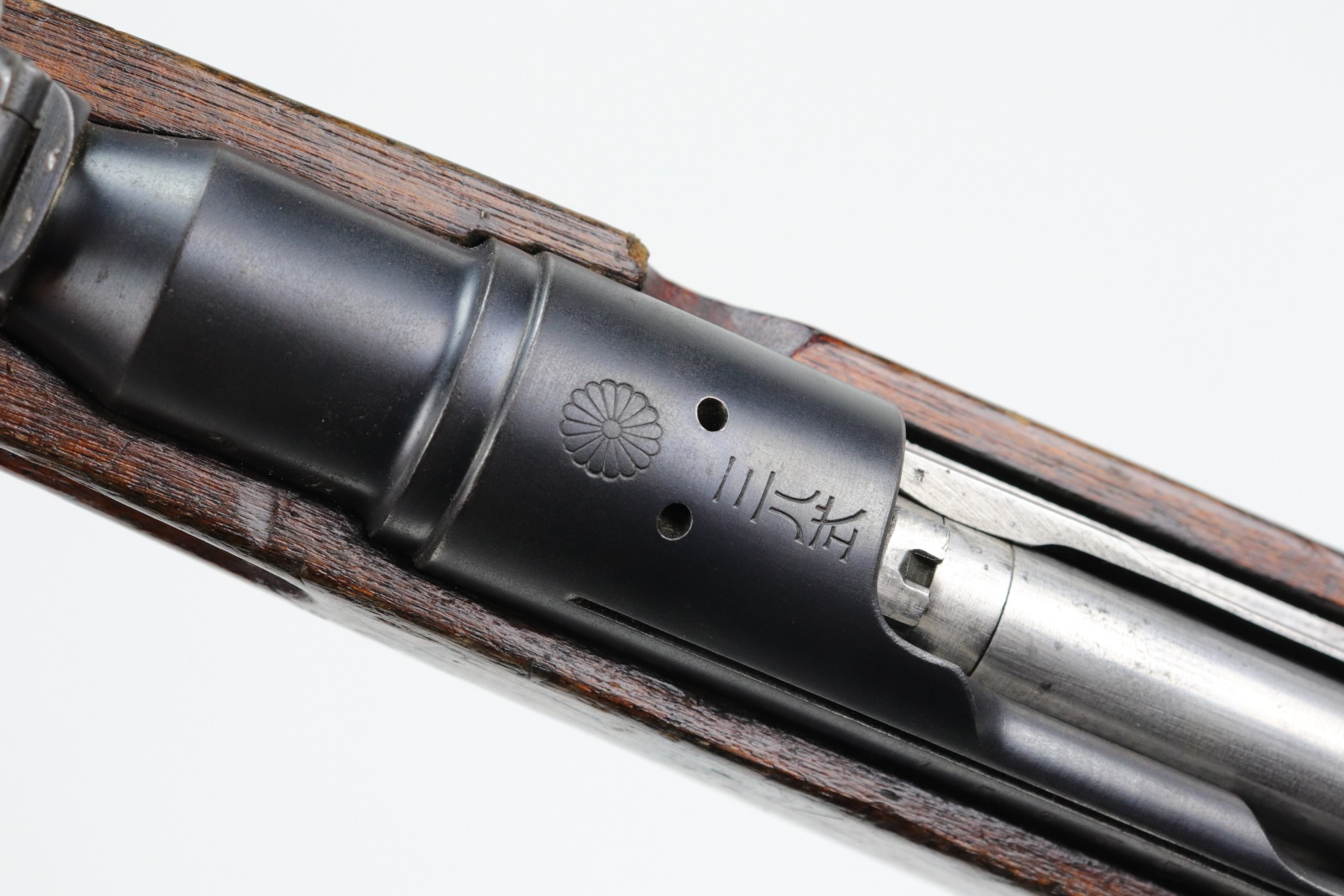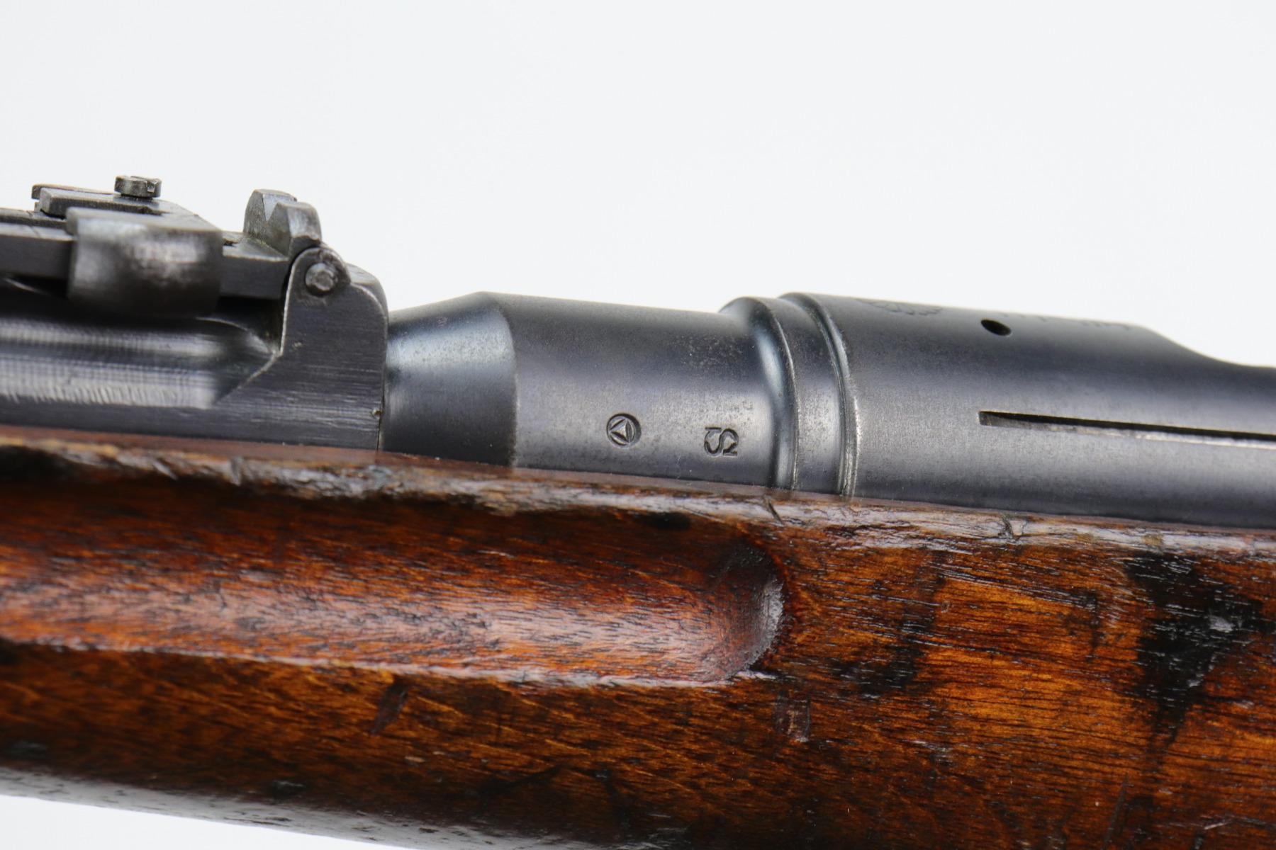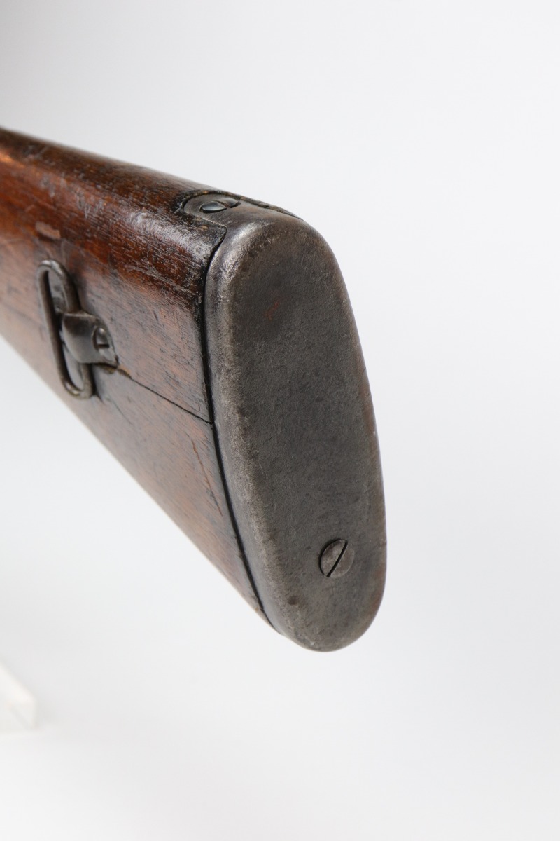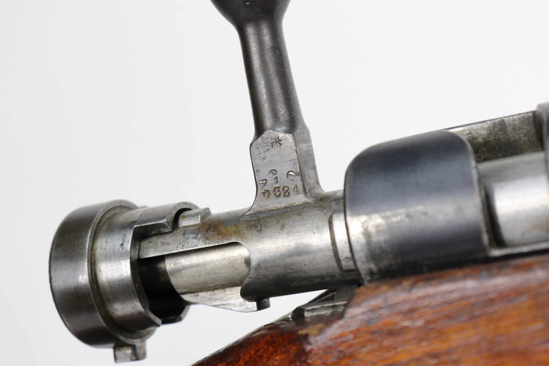 1/6/21 – This is a very nice example of an Arisaka Type 38 Carbine issued to the Japanese military during WW2. This is a shorter version of the full sized Type 38 rifle. This one has a completely in tact mum stamp on the receiver. The rear sight and bolt are mismatched to the gun. The metal parts are excellent, but there are areas of minor pitting and oxidation on the barrel. The stock is generally in nice condition with dings, dents, and scratches. It looks like a light coat of lacquer was applied. The rifling in the bore is a bit worn and there is fouling in the grooves.
