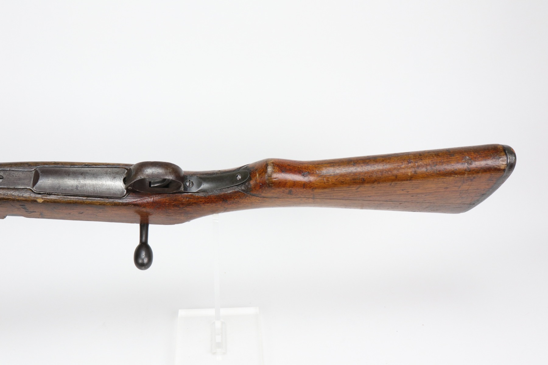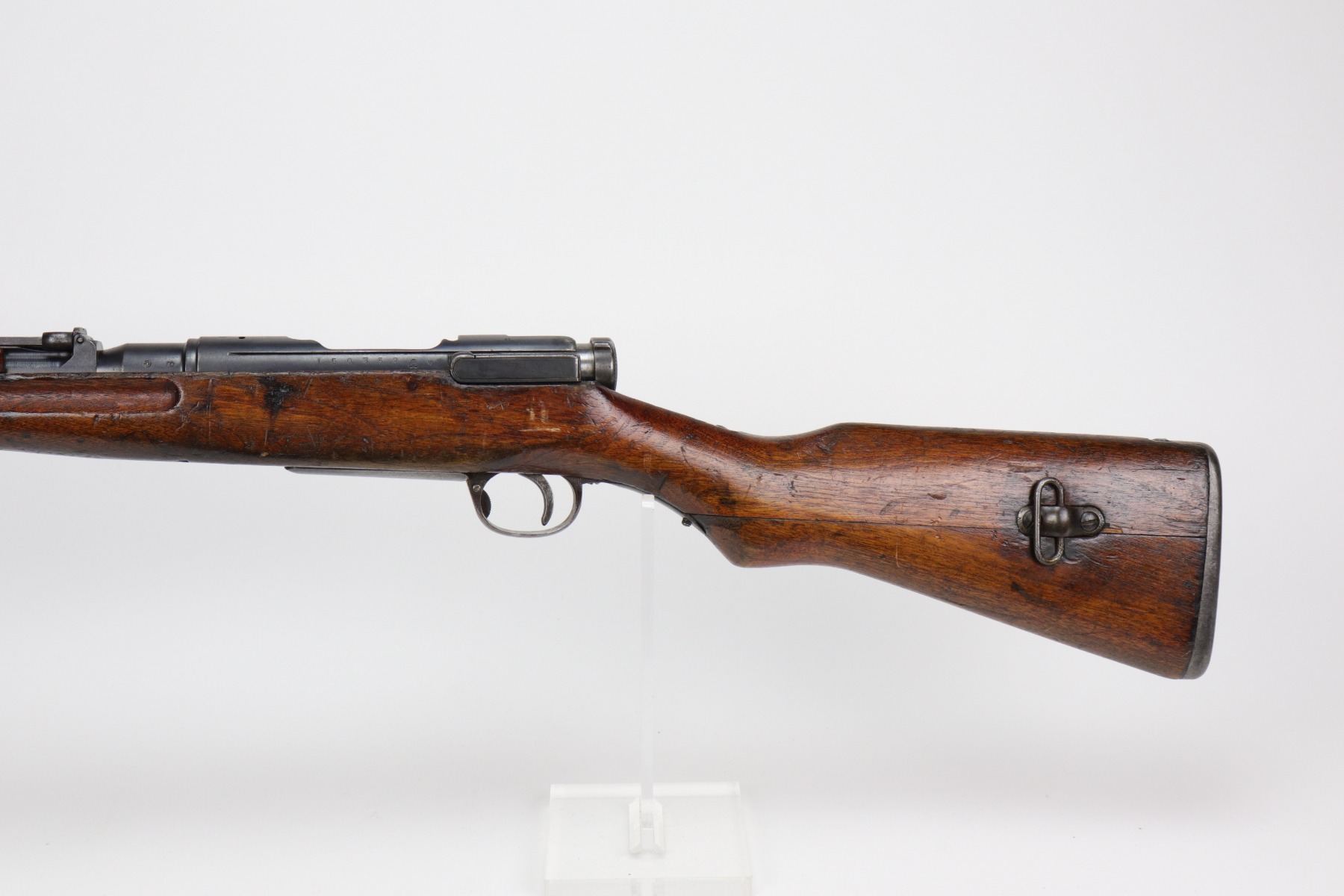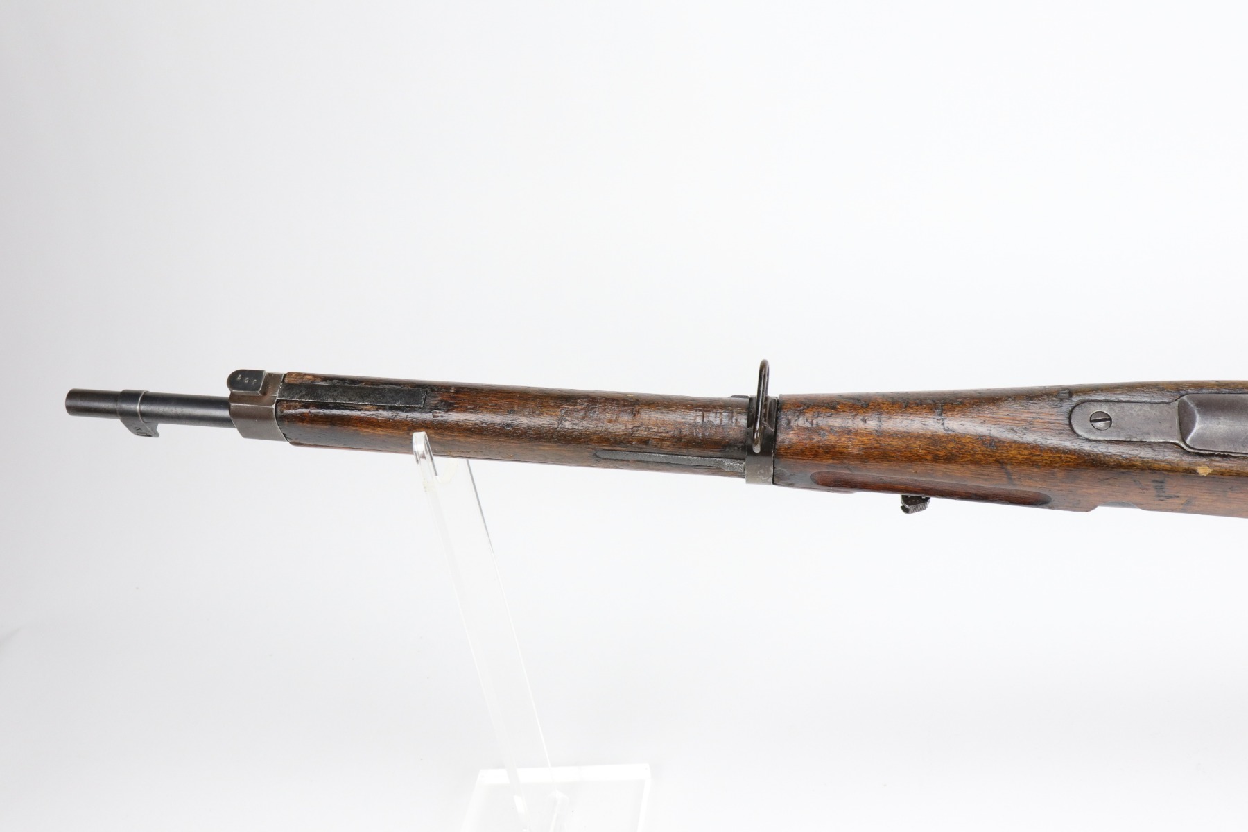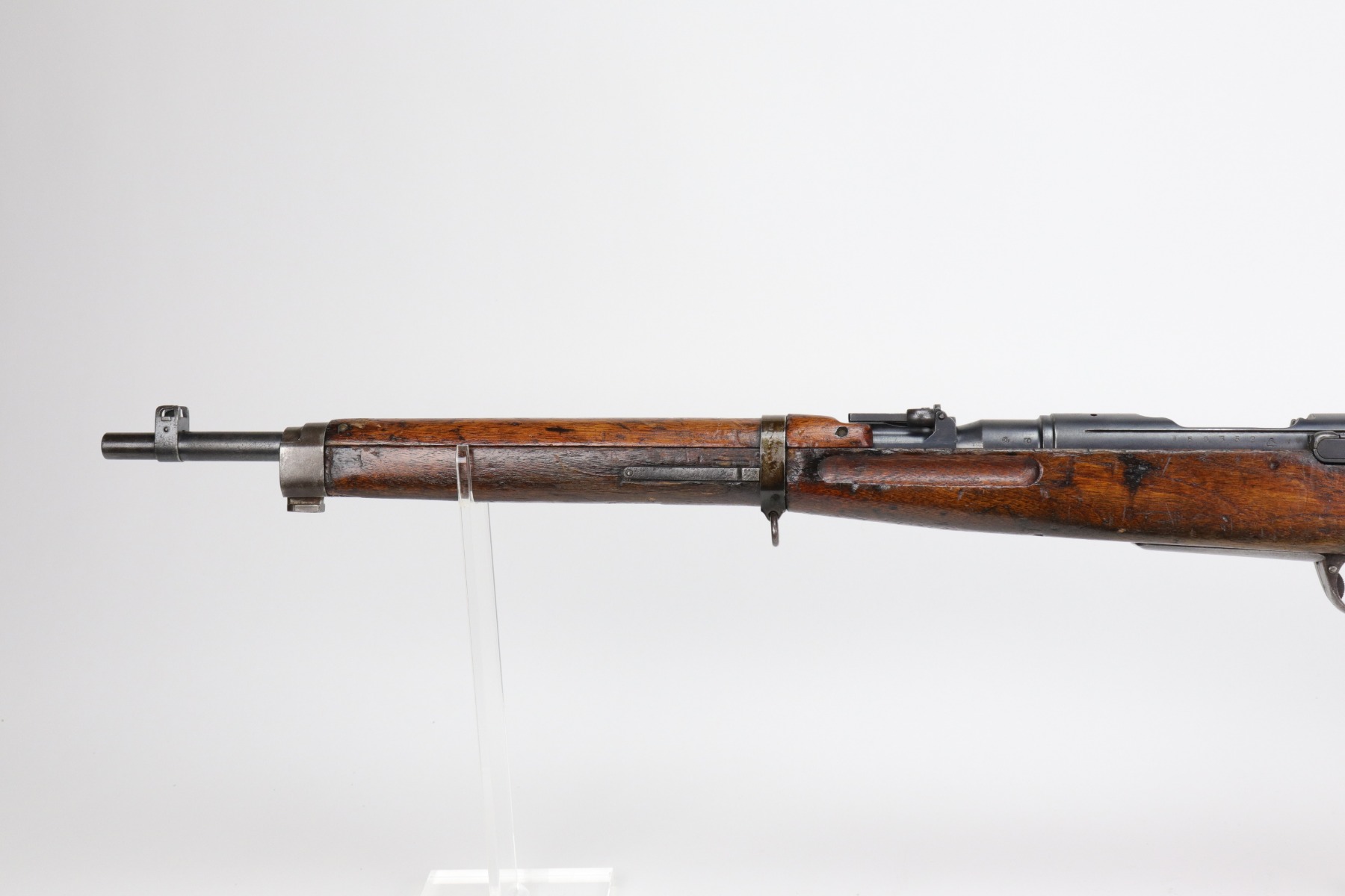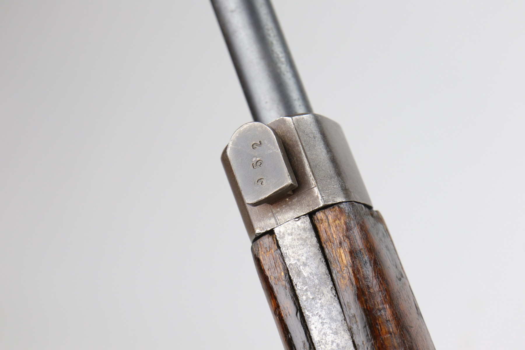 1/6/21 – This is a very nice example of an Arisaka Type 38 Carbine issued to the Japanese military during WW2. This is a shorter version of the full sized Type 38 rifle. This one has a completely in tact mum stamp on the receiver. The rear sight and bolt are mismatched to the gun. The metal parts are excellent, but there are areas of minor pitting and oxidation on the barrel. The stock is generally in nice condition with dings, dents, and scratches. It looks like a light coat of lacquer was applied. The rifling in the bore is a bit worn and there is fouling in the grooves.