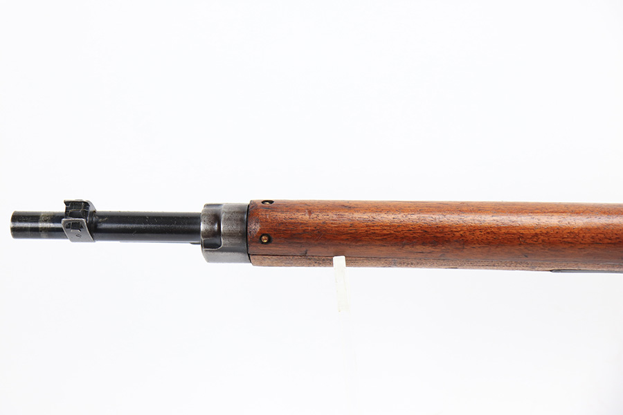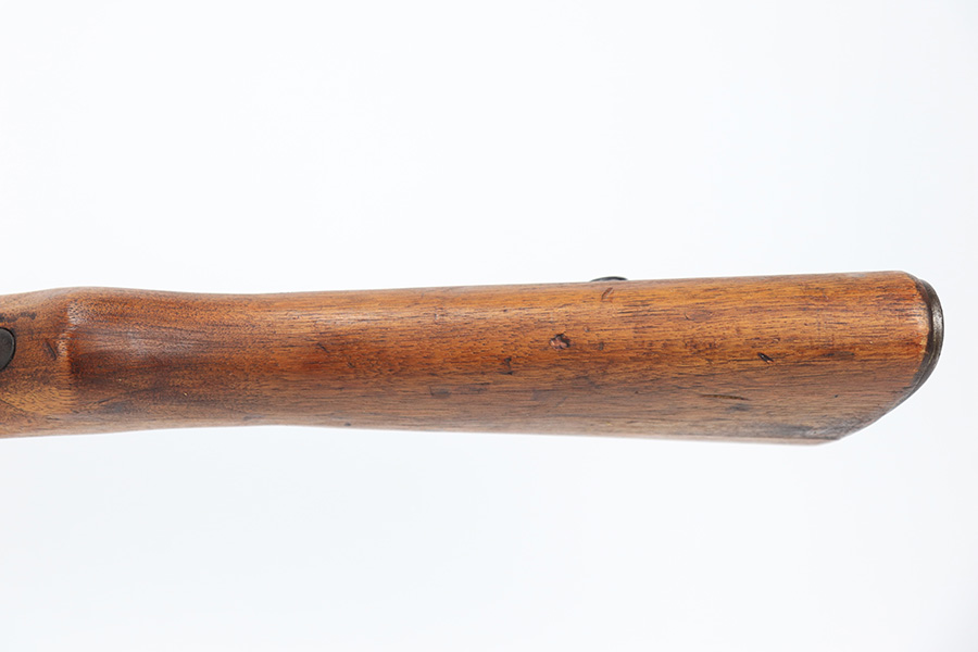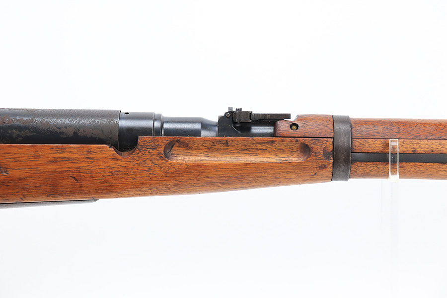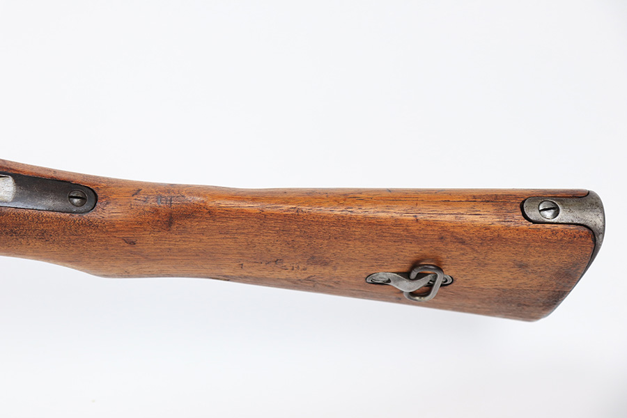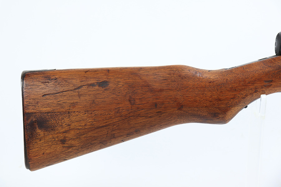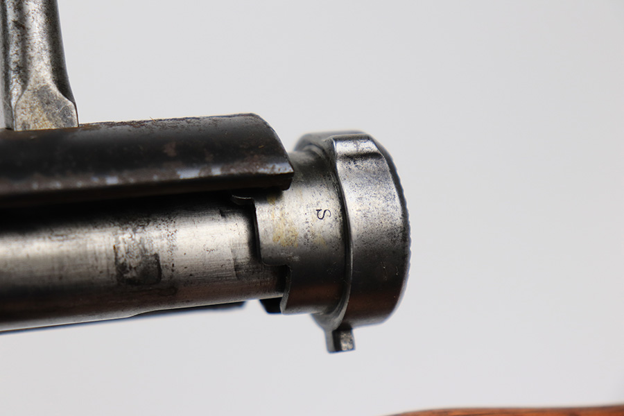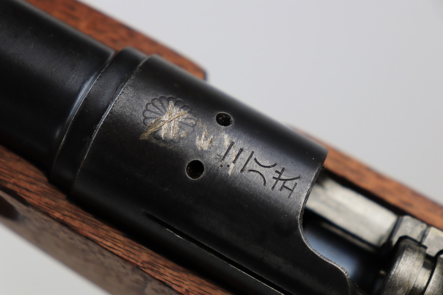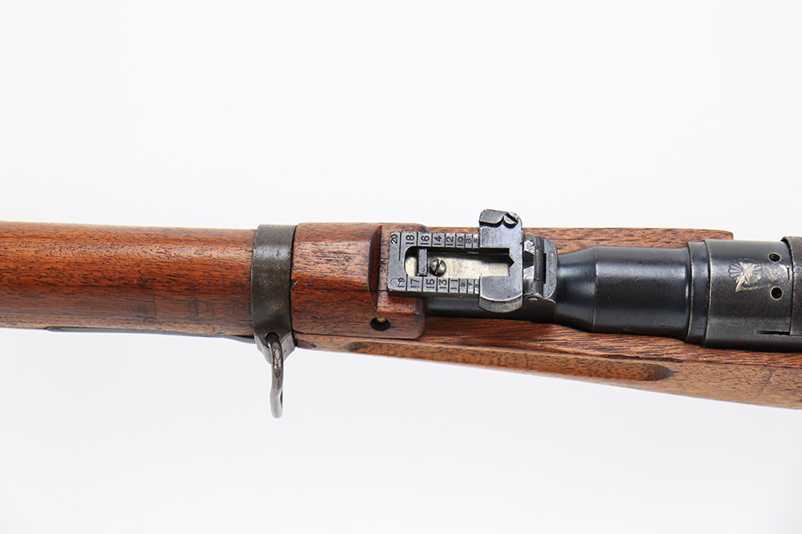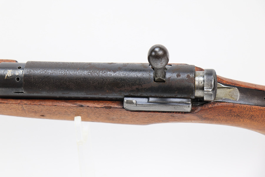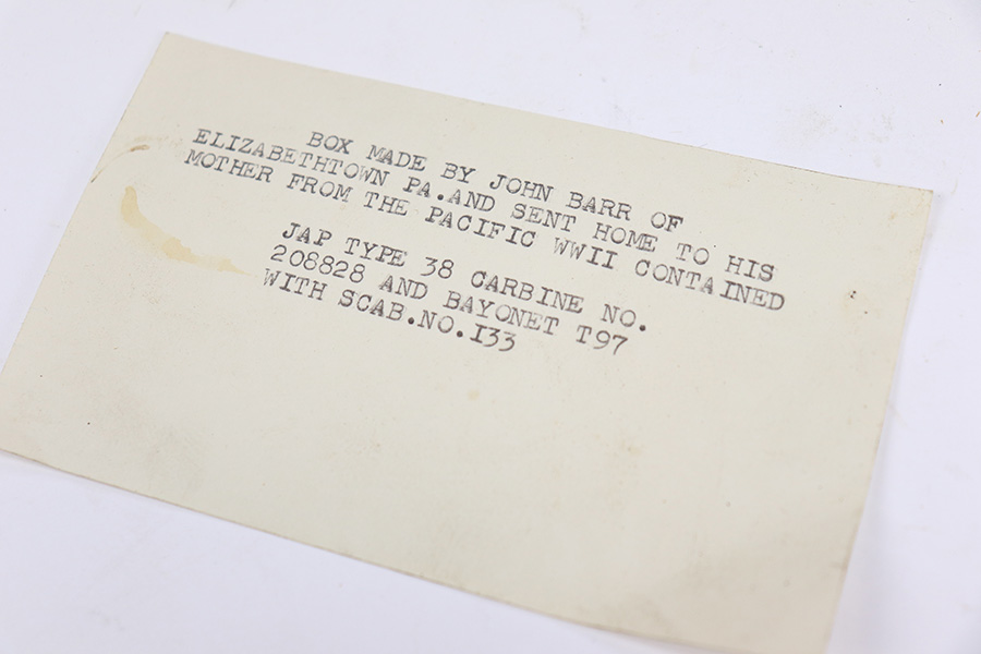 5/10/23 – This is an Arisaka Type 38 Carbine issued to the Japanese military during WW2. It comes with an original bayonet with scabbard (not matching) and an original dust cover (also not matching). These items come in an original wood shipping crate, shipped home from the Pacific Theatre by an American GI, John Barr, to his mother in Elizabethtown, PA. The bolt is mismatched, and the Imperial mum stamp on the receiver has been defacing – still mostly visible. The metal parts on the gun have retained roughly 75% with the majority of the finish loss being on the floor plate / trigger guard and around the front barrel band. Excellent wood stock with minor dings and bruises – may have been lightly sanded. Excellent bore.