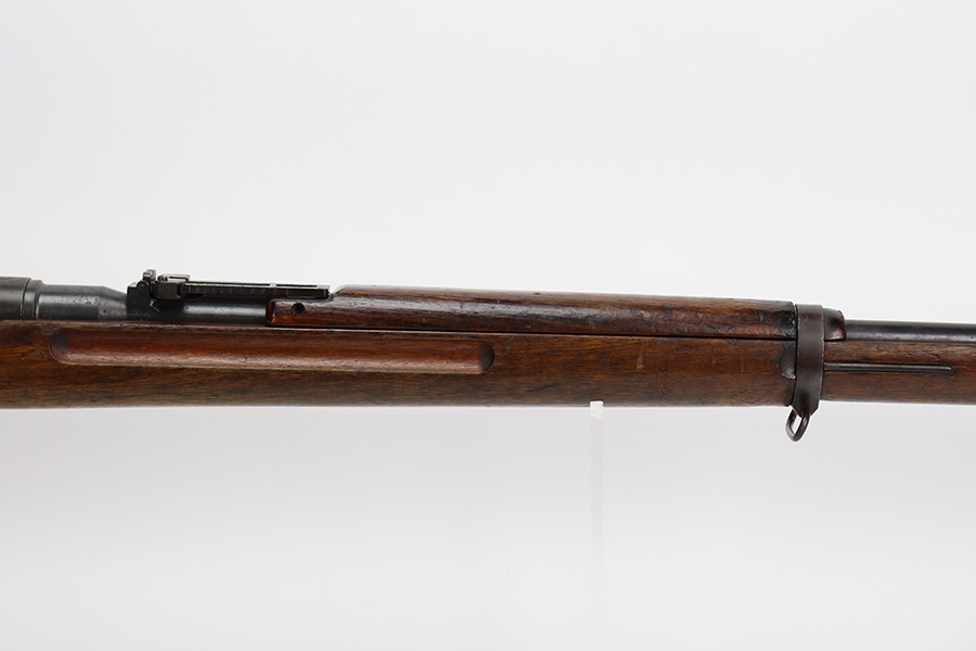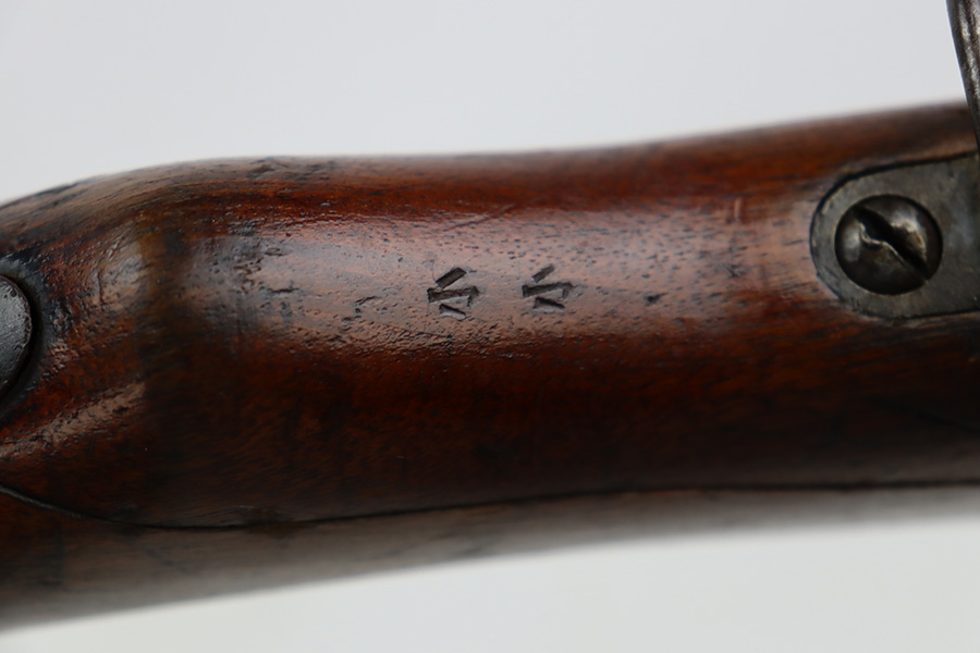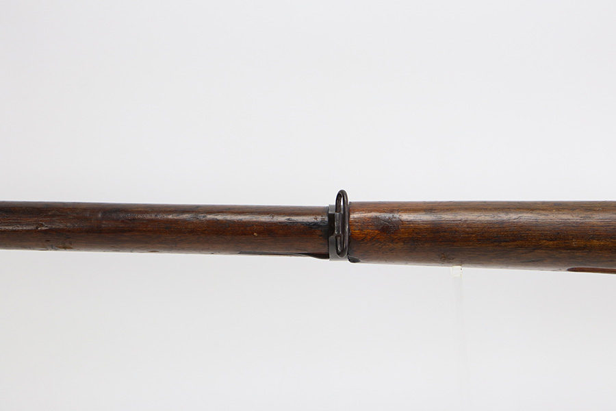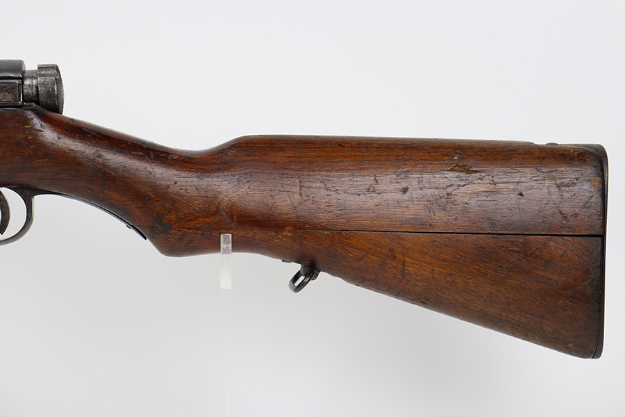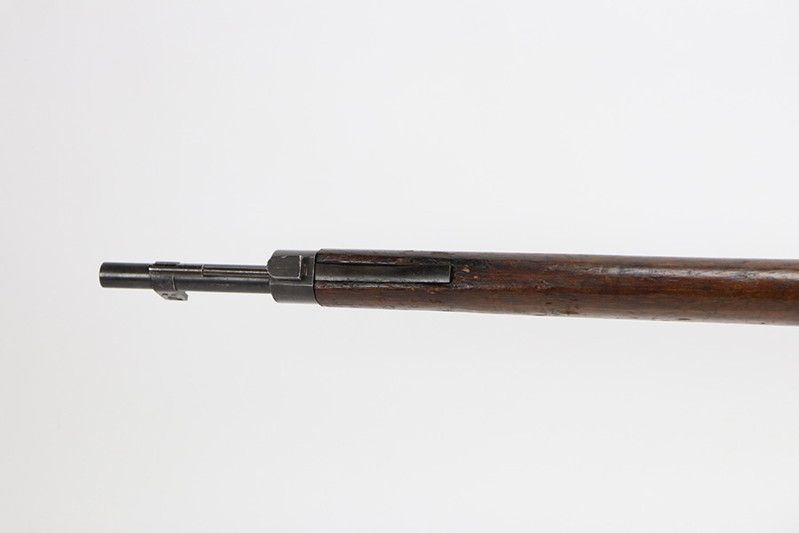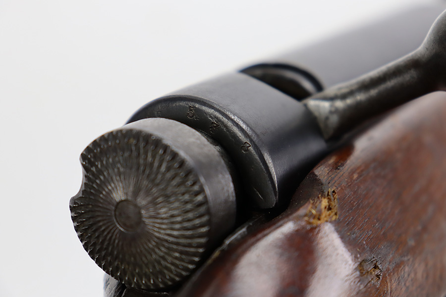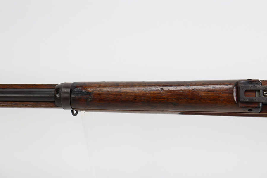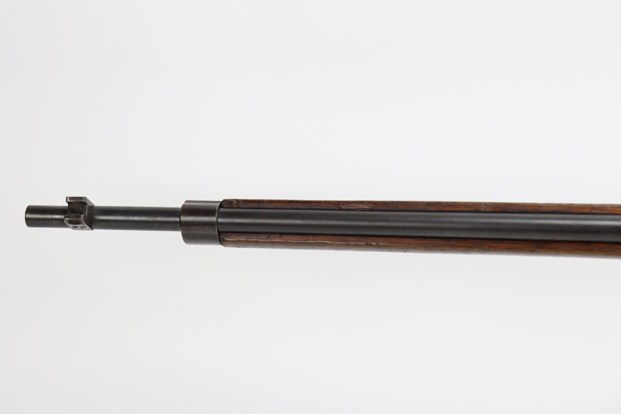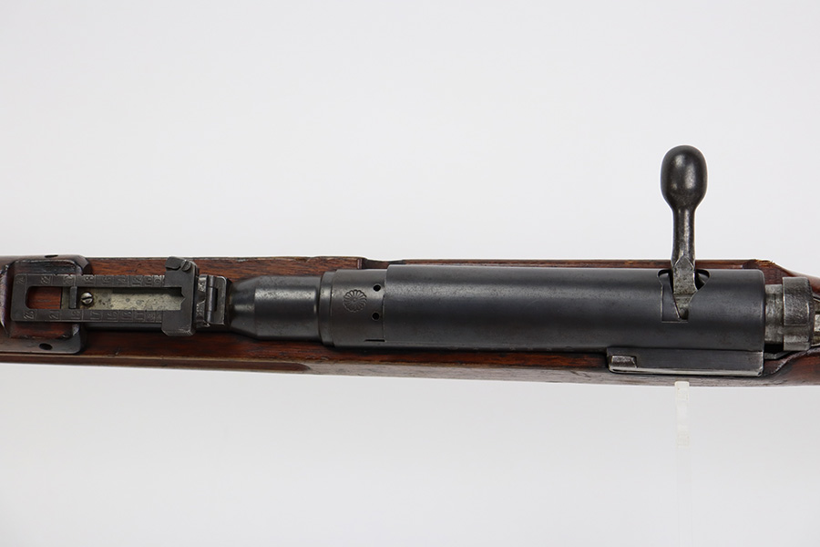 9/22/23 – This is a very nice example of an Arisaka Type 38 issued to the Japanese military during WW2. It has a fully intact Imperial mum stamp on the receiver and comes with its original matching-numbered dust cover. However, the side rail of the bolt and bolt release are mismatched. The metal parts have retained about 90% of their original finish with thinning on the floor plate. While there isn’t much actual finish loss, there are areas of spotty brown patina here and there, most noticeable on the floor plate. There is pitting and a small dent on the butt plate. Nice wood furniture that shows the normal signs of wear and use. Minty bore.