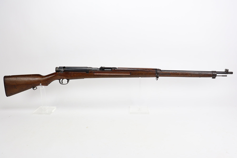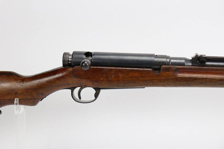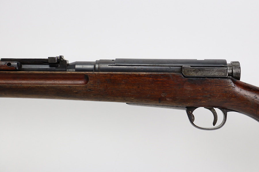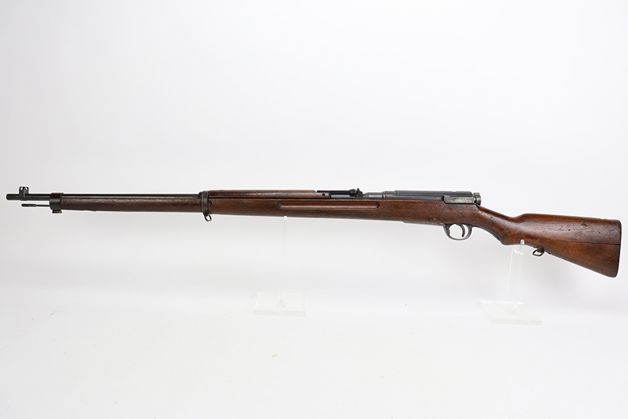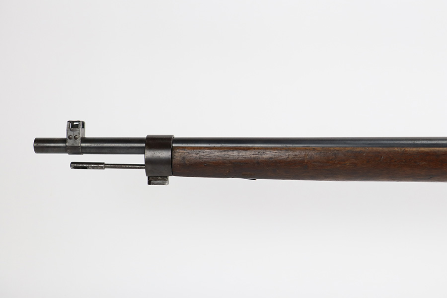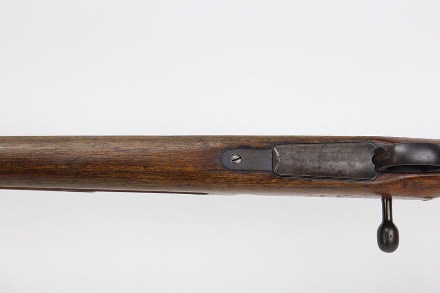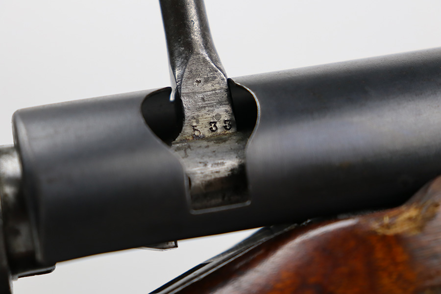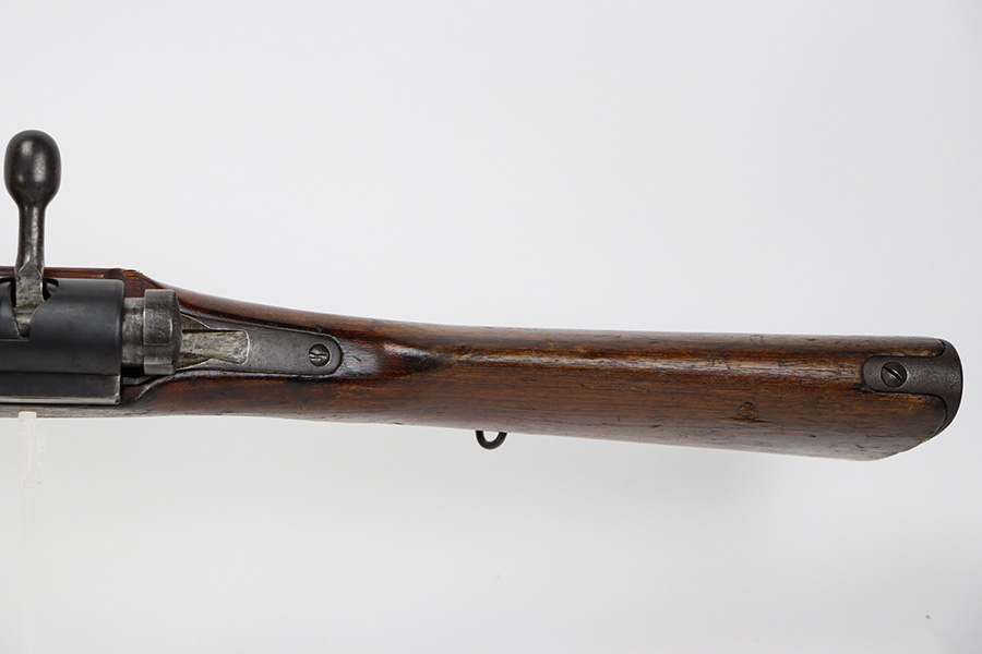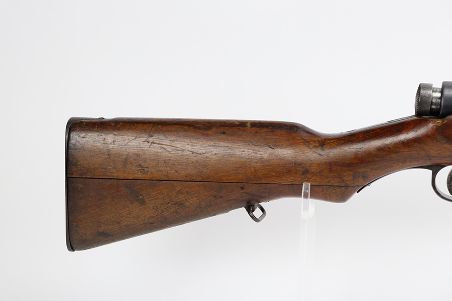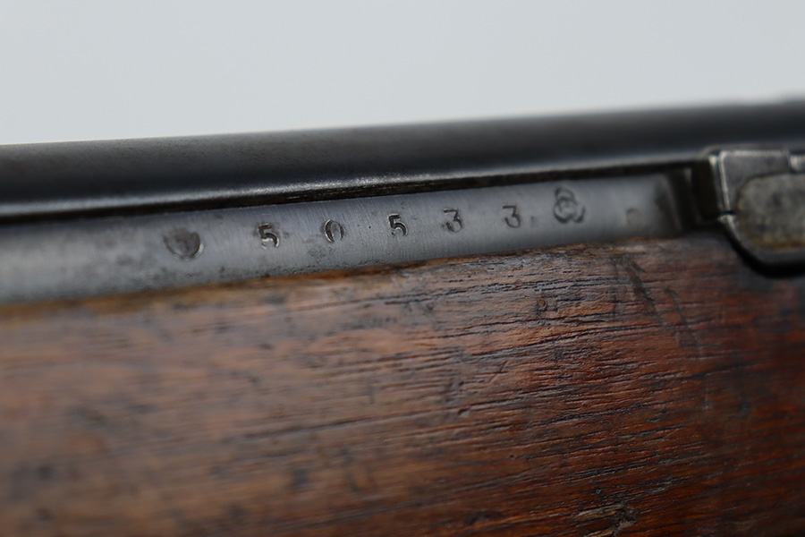 9/22/23 – This is a very nice example of an Arisaka Type 38 issued to the Japanese military during WW2. It has a fully intact Imperial mum stamp on the receiver and comes with its original matching-numbered dust cover. However, the side rail of the bolt and bolt release are mismatched. The metal parts have retained about 90% of their original finish with thinning on the floor plate. While there isn’t much actual finish loss, there are areas of spotty brown patina here and there, most noticeable on the floor plate. There is pitting and a small dent on the butt plate. Nice wood furniture that shows the normal signs of wear and use. Minty bore.