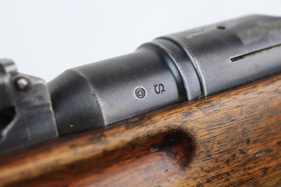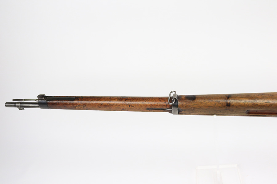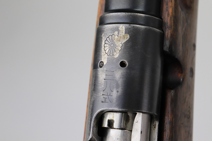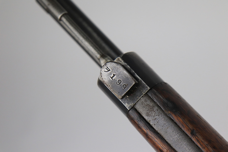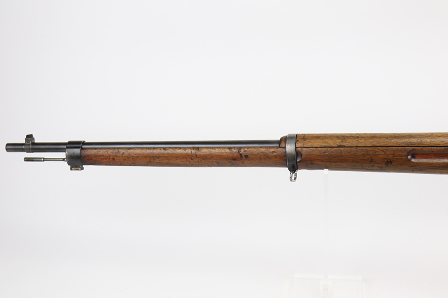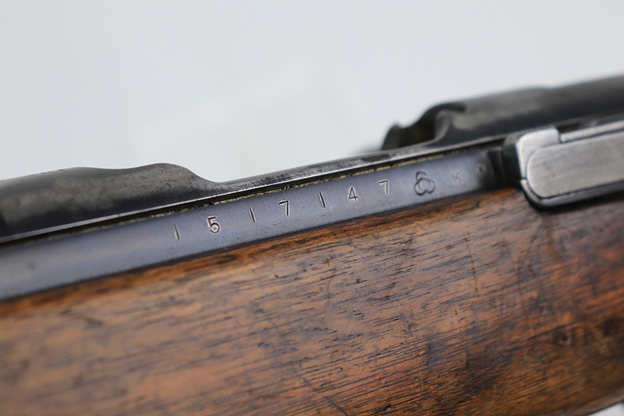 5/11/22 – This is a nice example of an Arisaka Type 38 issued to the Japanese military during WW2. The gun is mismatched and has a partially-ground Imperial mum stamp on the receiver that is mostly visible. The gun has retained the majority of its finish with noticeable wear around the muzzle and front portion on the barrel. Light brown patina along the barrel. Spotty wear on the receiver. The rear barrel band, floor plate, and trigger group have no finish. No major damage to the stock, but there are small bruises and scratches throughout. One more noticeable gouge on the right side of the foregrip. Very nice bore with good rifling.