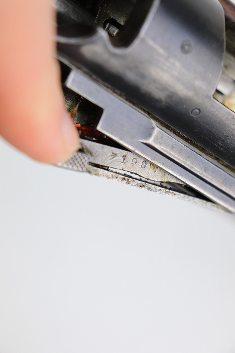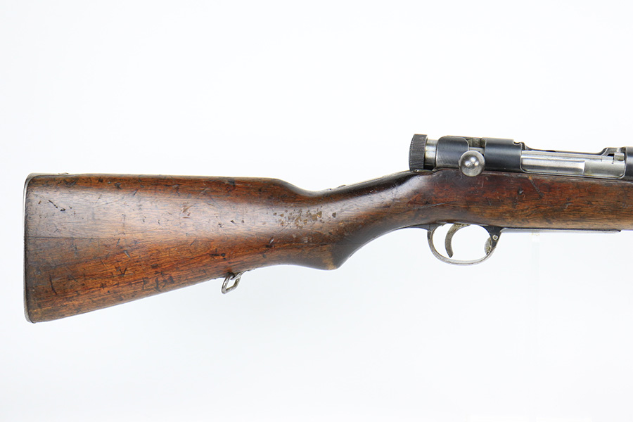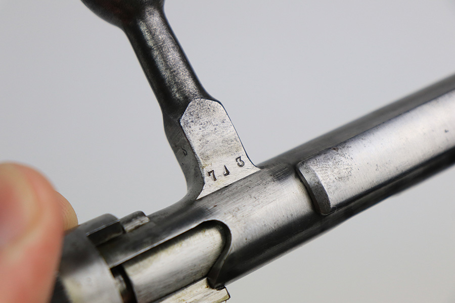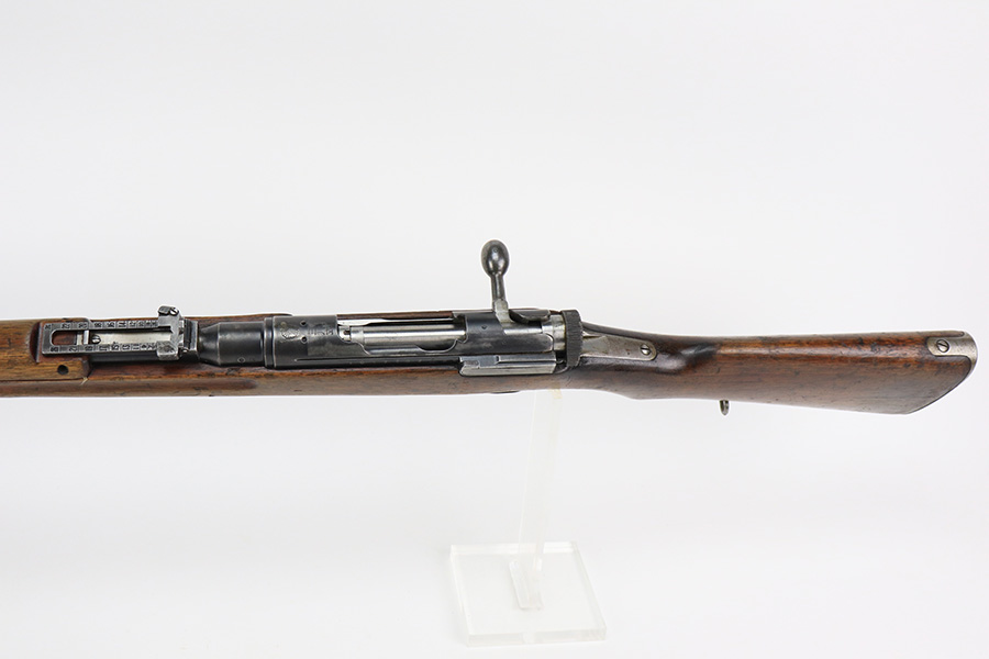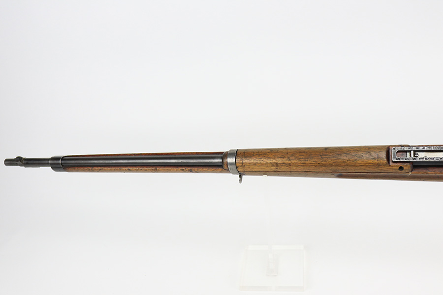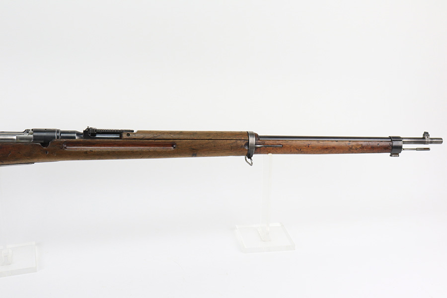 5/11/22 – This is a nice example of an Arisaka Type 38 issued to the Japanese military during WW2. The gun is mismatched and has a partially-ground Imperial mum stamp on the receiver that is mostly visible. The gun has retained the majority of its finish with noticeable wear around the muzzle and front portion on the barrel. Light brown patina along the barrel. Spotty wear on the receiver. The rear barrel band, floor plate, and trigger group have no finish. No major damage to the stock, but there are small bruises and scratches throughout. One more noticeable gouge on the right side of the foregrip. Very nice bore with good rifling.