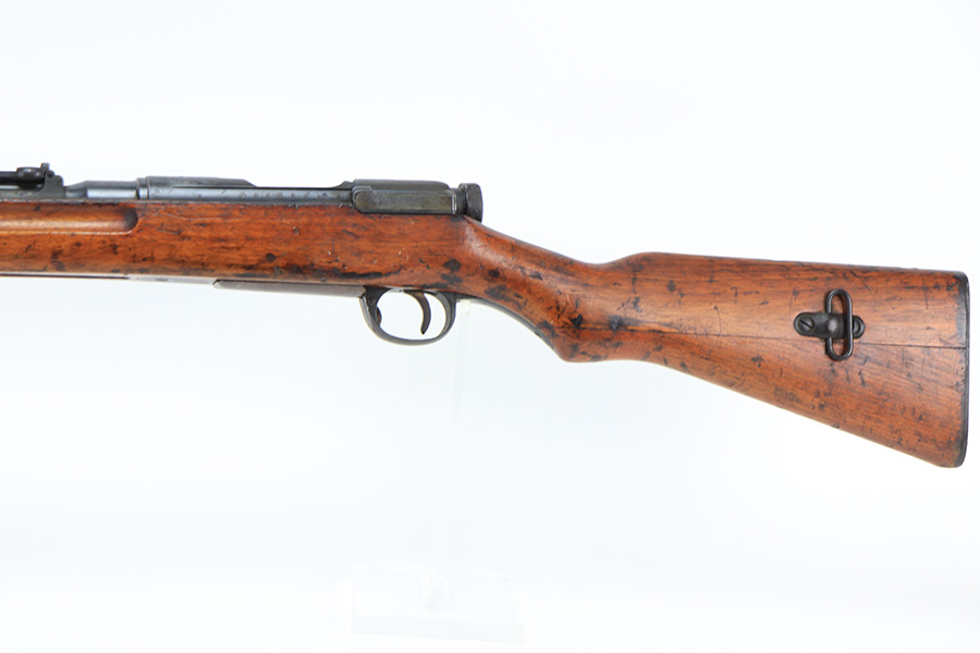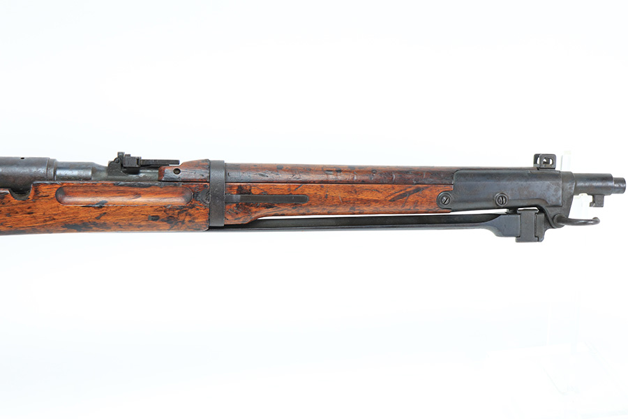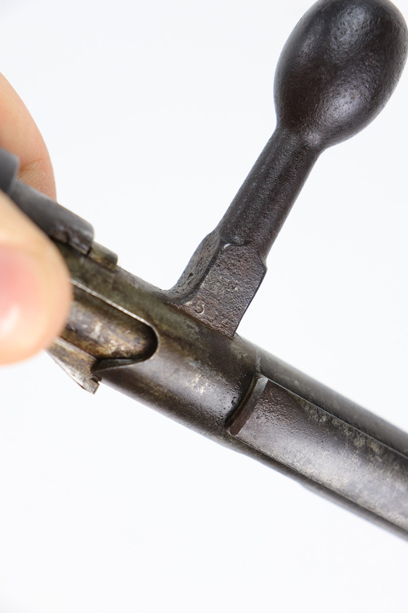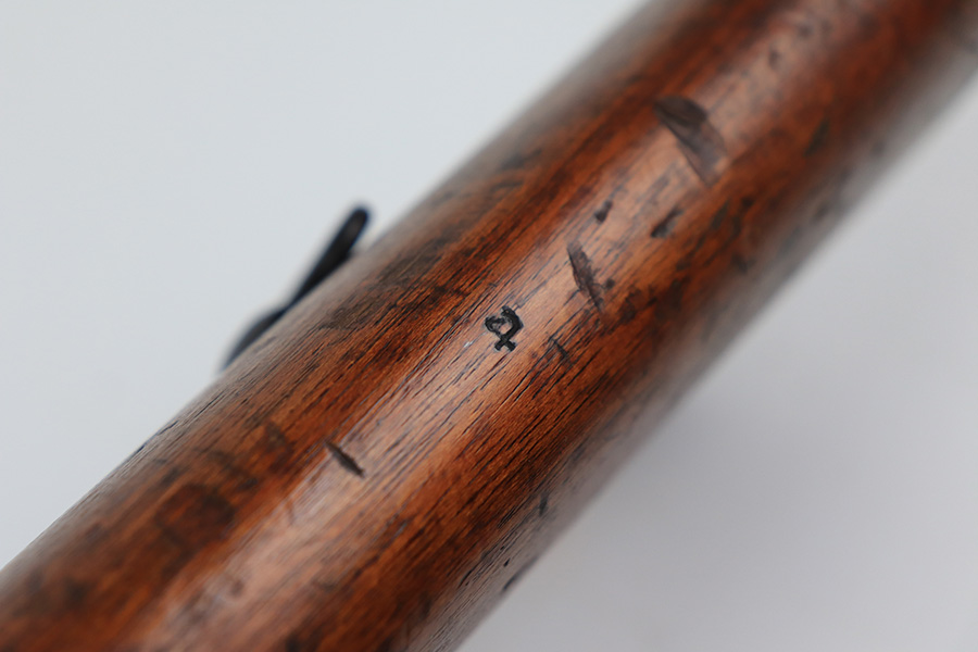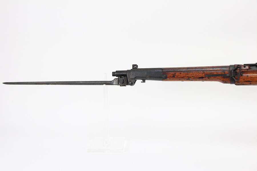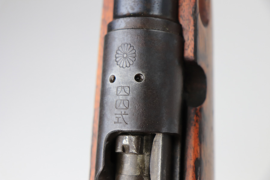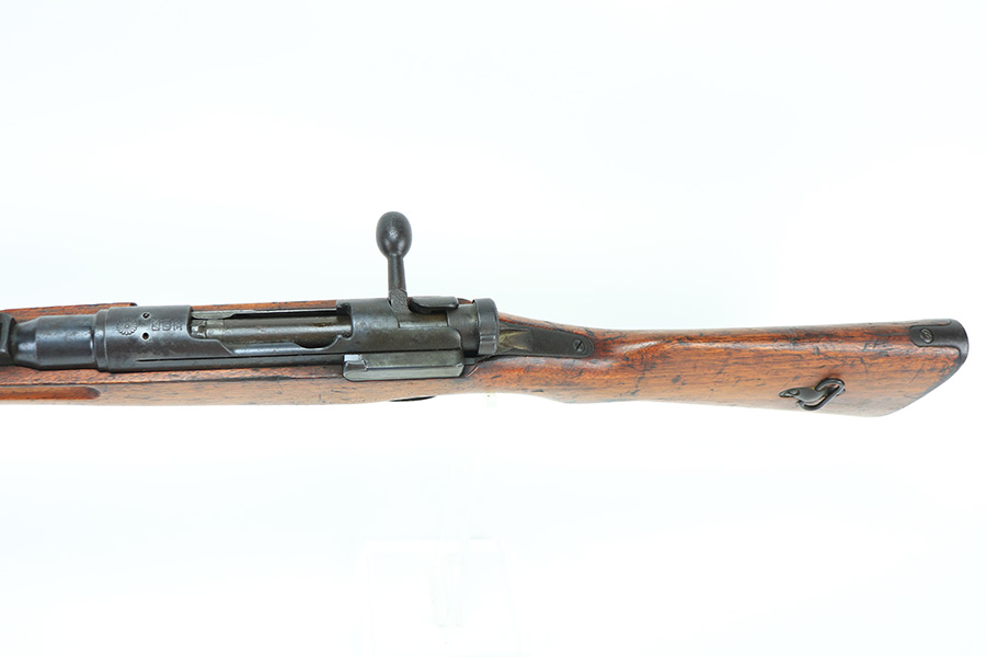 2/24/22 – This is an all matching and original Arisaka Type 44 carbine in excellent condition with full mum intact. The blue shows some thinning on the receiver, but also some corrosion on the bolt, and surface rust on receiver. Strong, shiny bore with minor frost in the grooves. Crisp markings throughout, with fully matching bolt assembly. Various dings and handling wear on the stock but no cracks or major chips.