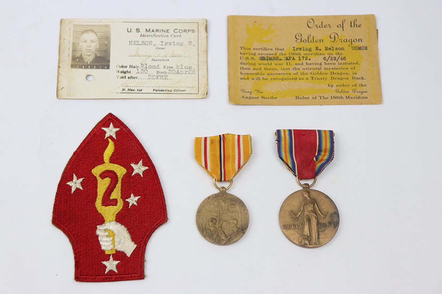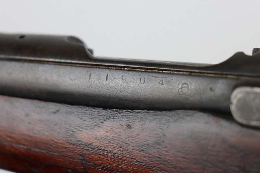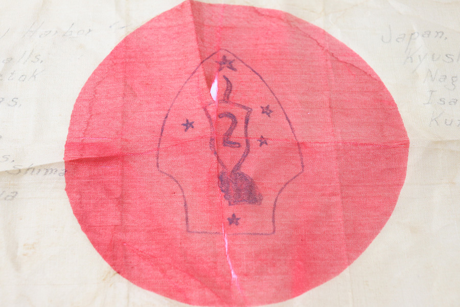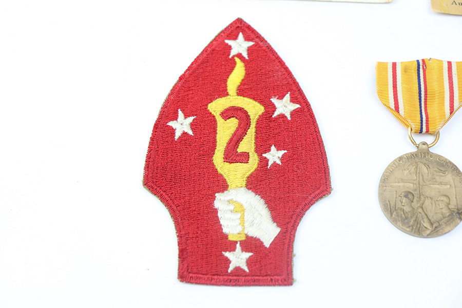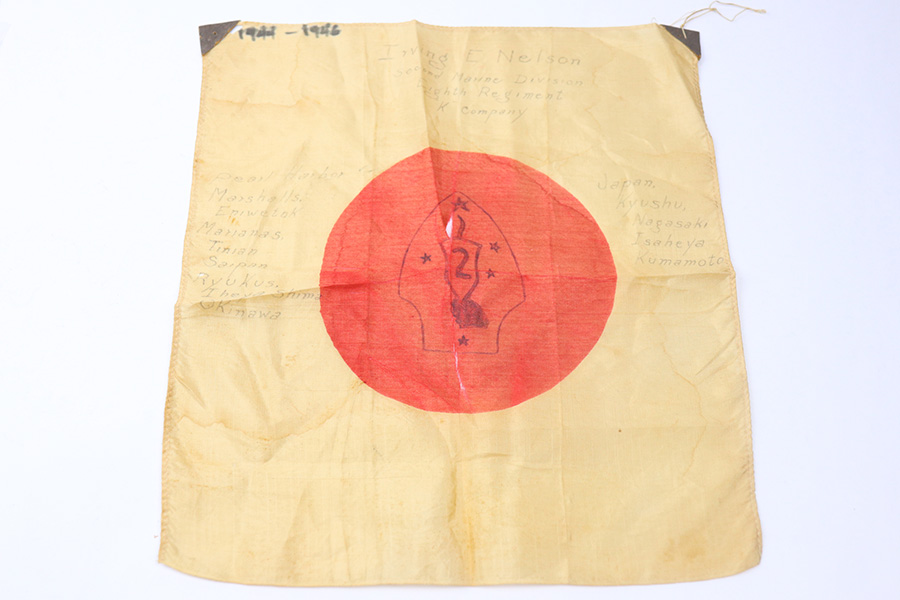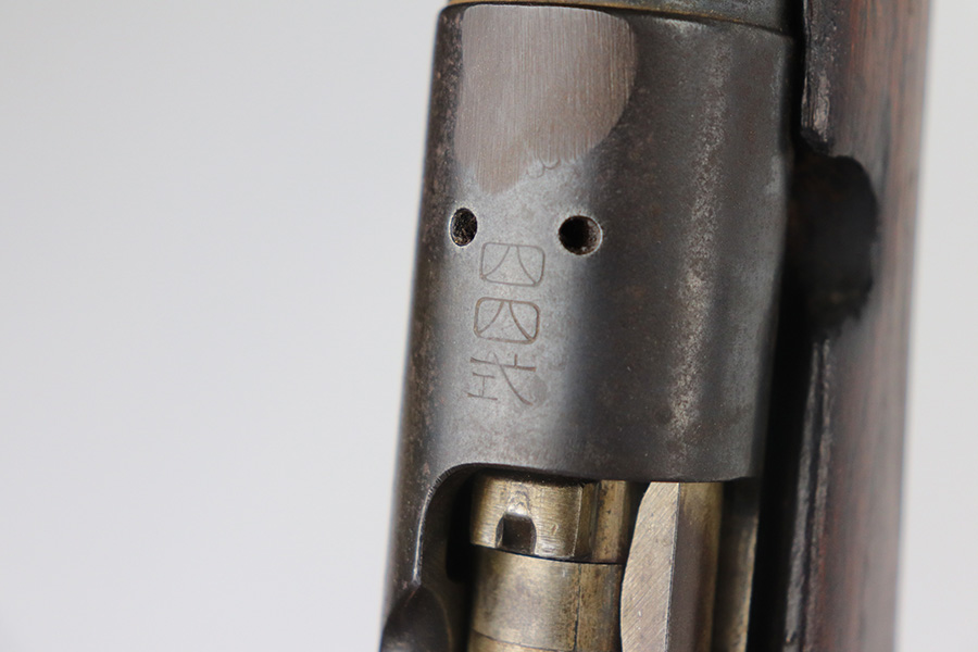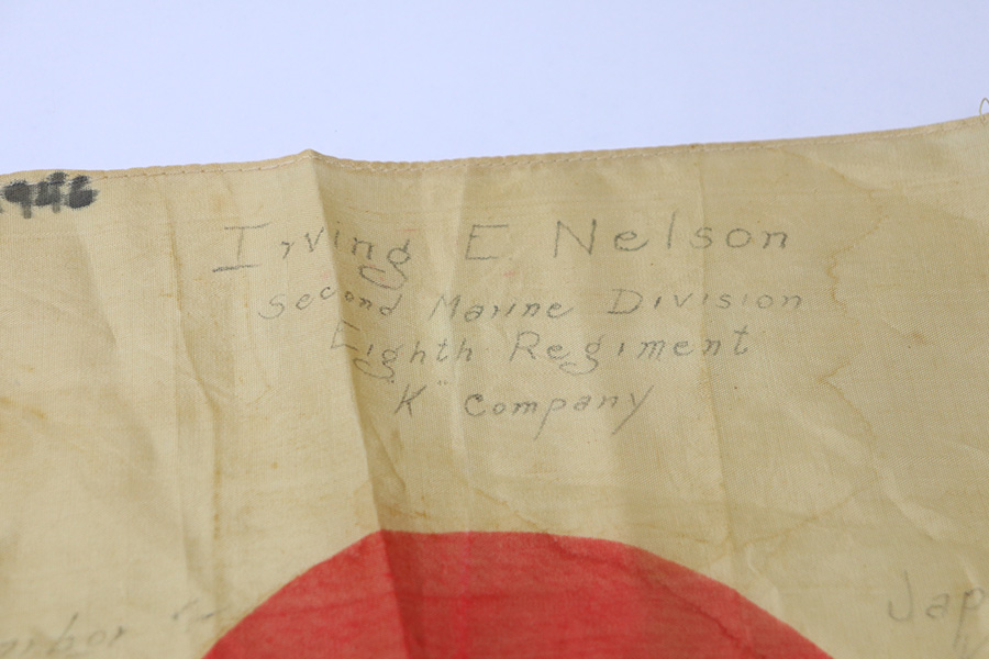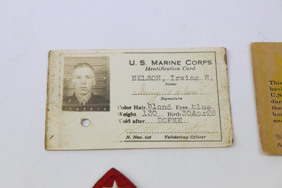 8/3/21 – This is an interesting Arisaka Type 44 Cavalry Carbine grouping with flag, photo ID card, enlistment training photo, 2nd Marine Division patch, two campaign medals and enlistment notification. Our consignor states he got this grouping from a family member of Irving E. Nelson, the soldier named and shown in the grouping, but the paperwork does not specifically tie to the rifle by serial. The rifle has patina throughout and a ground mum, and a mismatched bolt. Folding style bayonet with a nice stock aside from some notable chips out of the handguard. Bore has some rifling but deeply frosted throughout. Irving Nelson was 2nd Marine Division, 8th Regiment, K Company, and the flag lists all the islands on which he served.