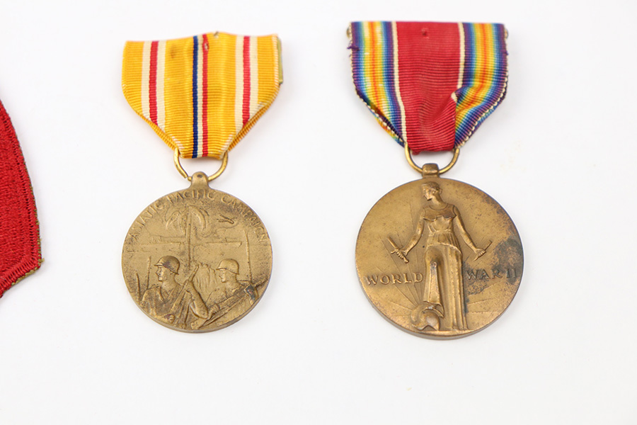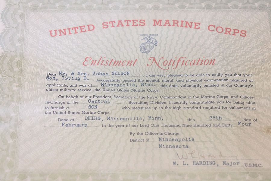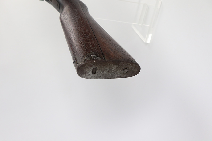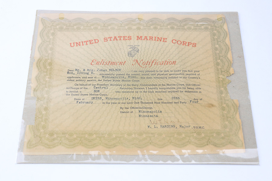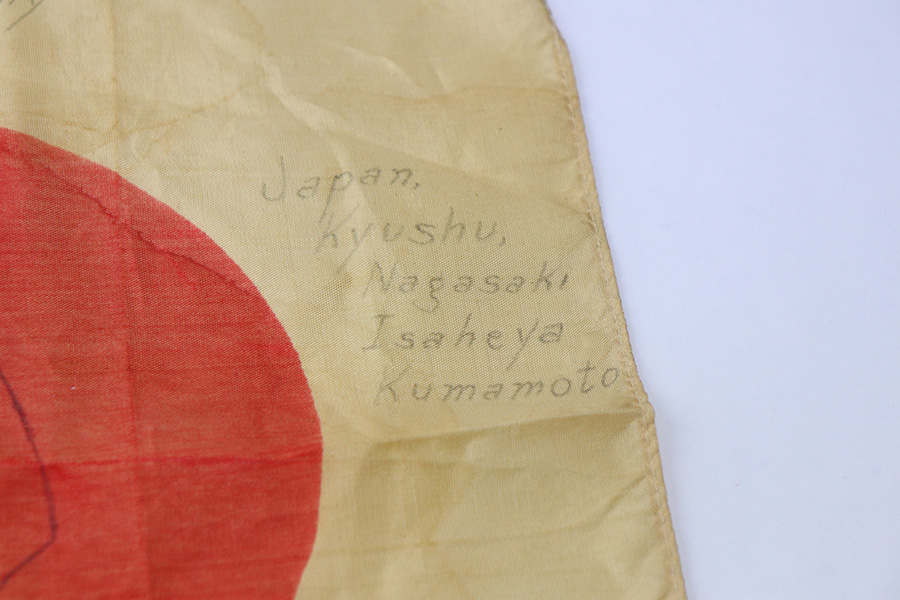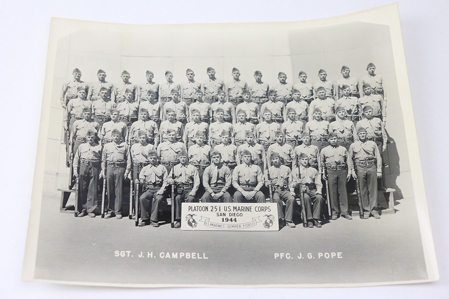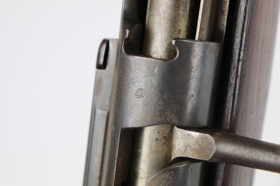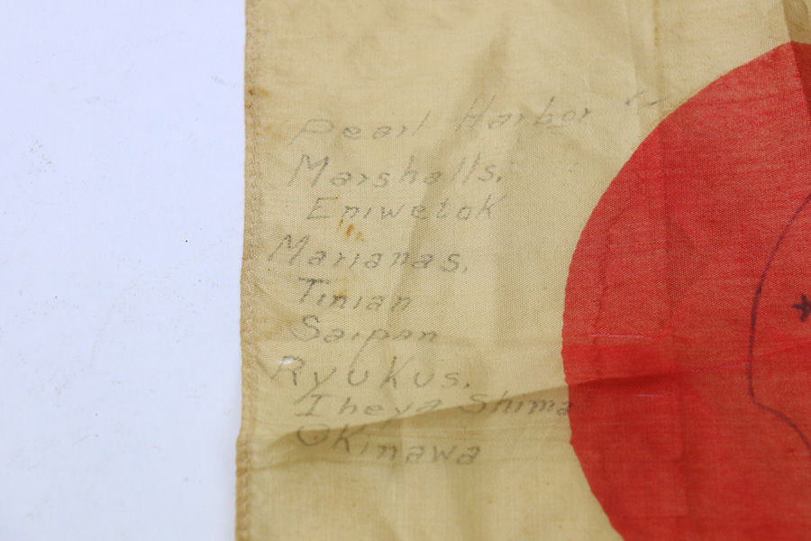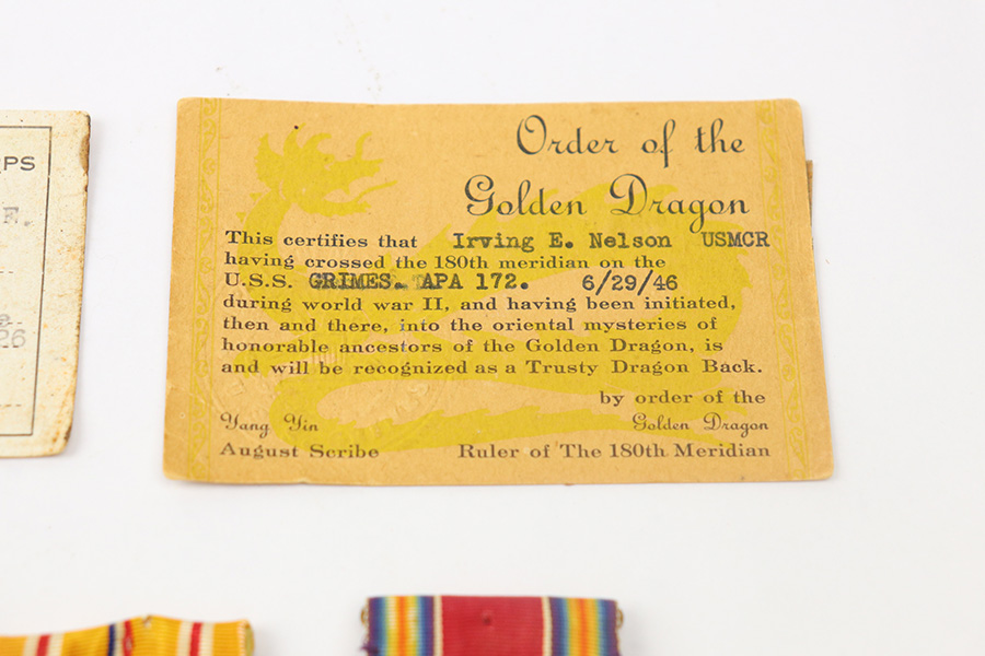 8/3/21 – This is an interesting Arisaka Type 44 Cavalry Carbine grouping with flag, photo ID card, enlistment training photo, 2nd Marine Division patch, two campaign medals and enlistment notification. Our consignor states he got this grouping from a family member of Irving E. Nelson, the soldier named and shown in the grouping, but the paperwork does not specifically tie to the rifle by serial. The rifle has patina throughout and a ground mum, and a mismatched bolt. Folding style bayonet with a nice stock aside from some notable chips out of the handguard. Bore has some rifling but deeply frosted throughout. Irving Nelson was 2nd Marine Division, 8th Regiment, K Company, and the flag lists all the islands on which he served.