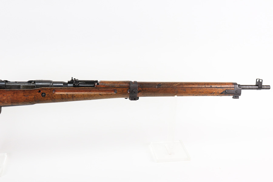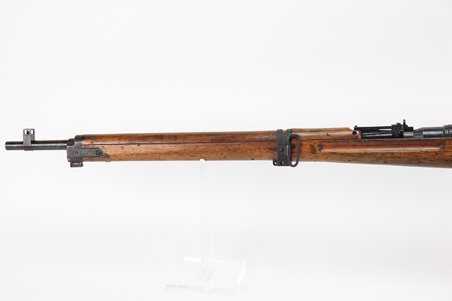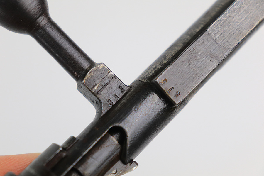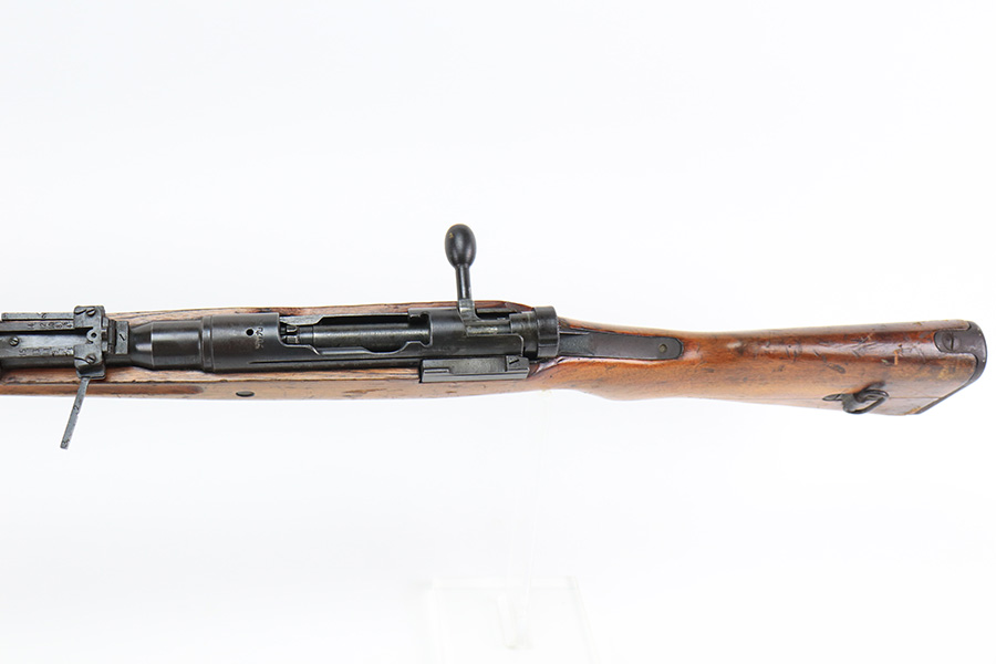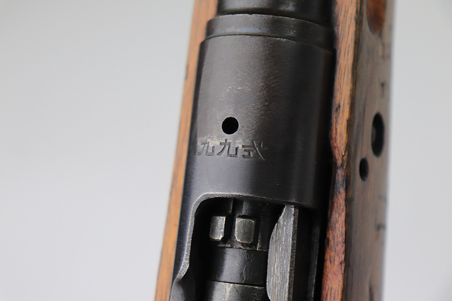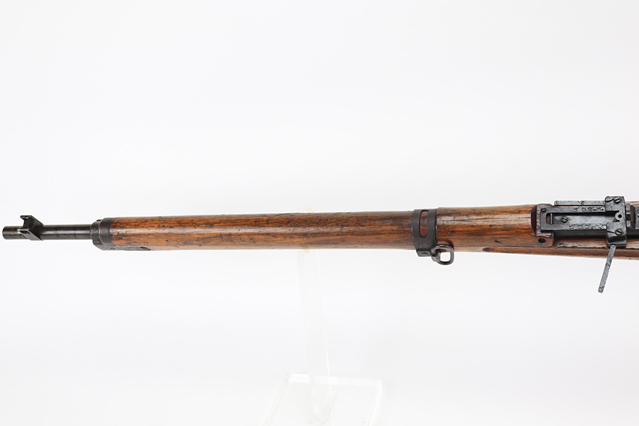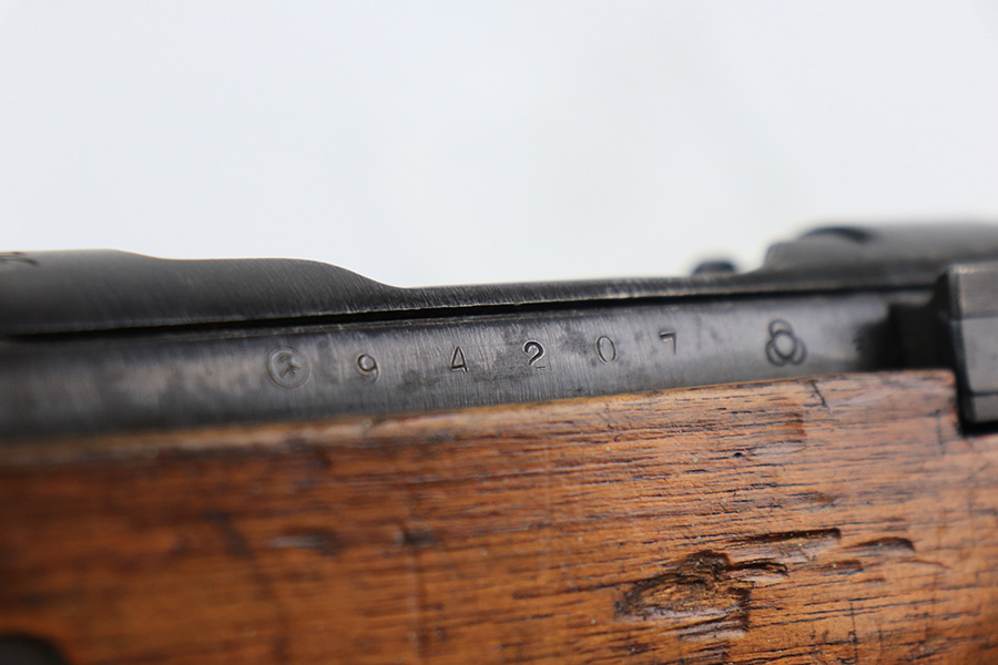 1/7/22 – This is a nice example of an Arisaka Type 99 rifle issued to the Japanese military during WW2. The gun is mismatched and has a ground Imperial mum stamp on the top of the receiver. There isn’t much actual finish loss, but virtually all of the metal parts are covered in brown patina with areas of spotty oxidation here and there. There is some thinning and splotchy discoloration on the barrel, some thinning on the floor plate, minor wear on the high edges in general, and some light scratchy wear at the back of the receiver. There are tiny dots of what look like white mold spores on the floor plate and some of the wood stock. The stock has dings, dents, and scratches throughout but no major damage. The bore is mint.
