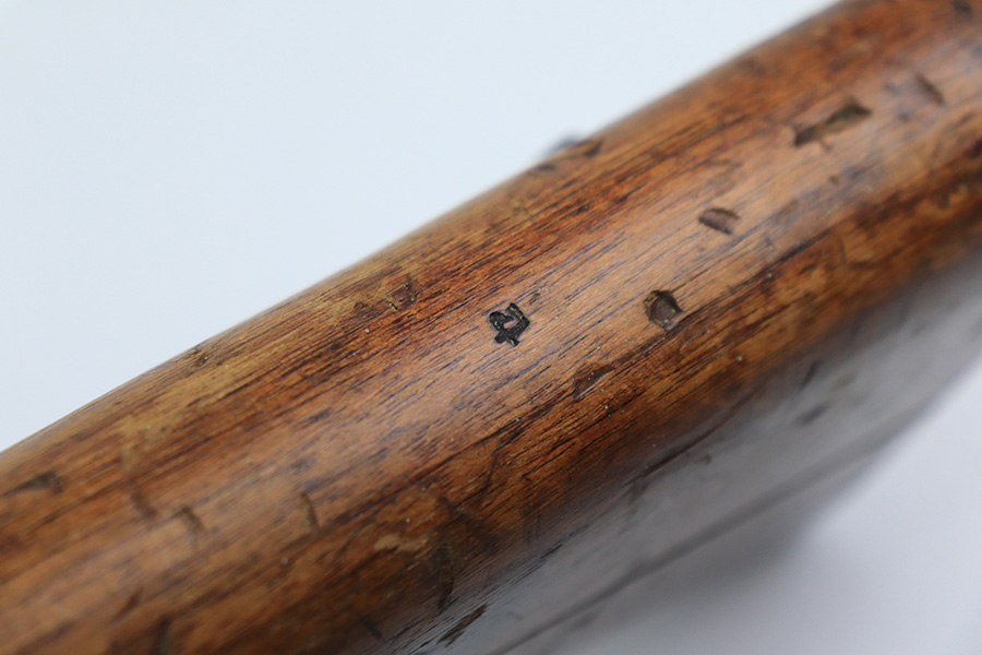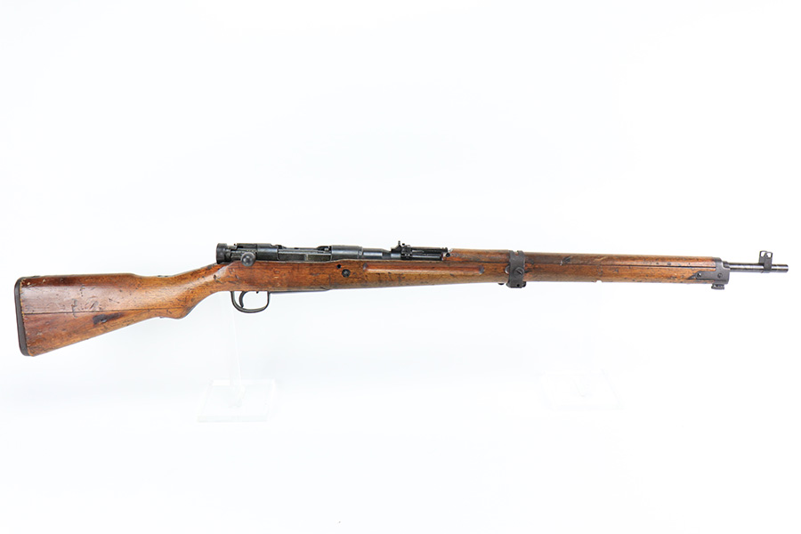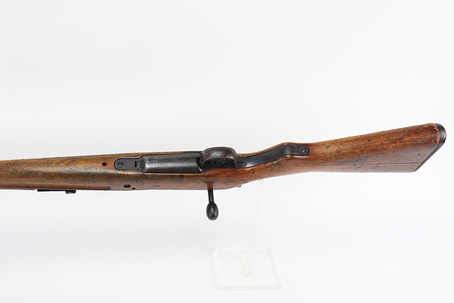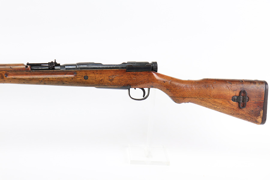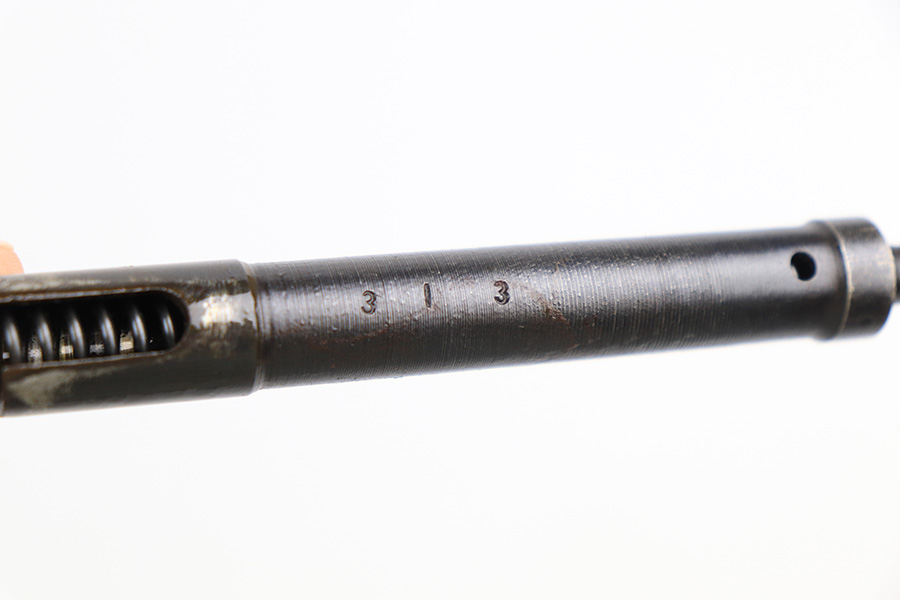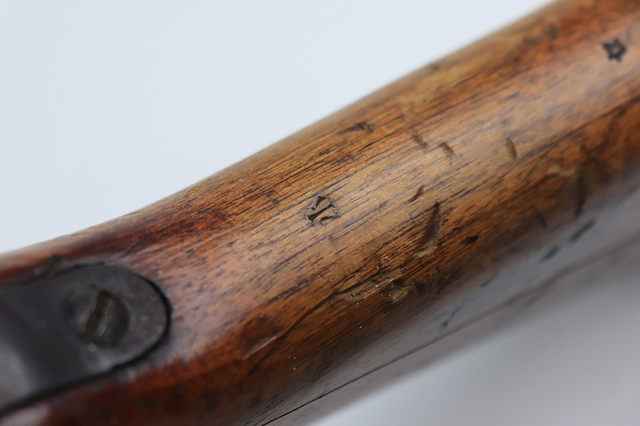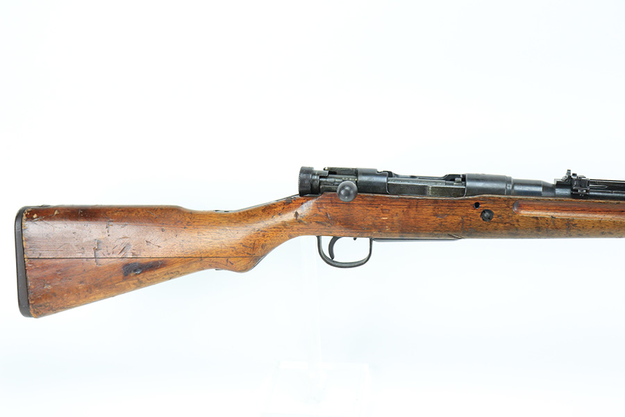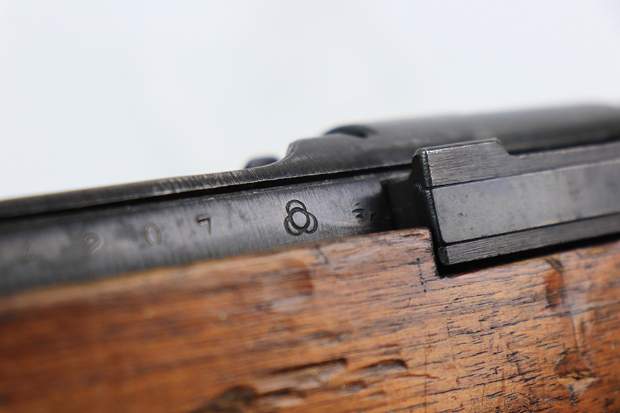1/7/22 – This is a nice example of an Arisaka Type 99 rifle issued to the Japanese military during WW2. The gun is mismatched and has a ground Imperial mum stamp on the top of the receiver. There isn’t much actual finish loss, but virtually all of the metal parts are covered in brown patina with areas of spotty oxidation here and there. There is some thinning and splotchy discoloration on the barrel, some thinning on the floor plate, minor wear on the high edges in general, and some light scratchy wear at the back of the receiver. There are tiny dots of what look like white mold spores on the floor plate and some of the wood stock. The stock has dings, dents, and scratches throughout but no major damage. The bore is mint.