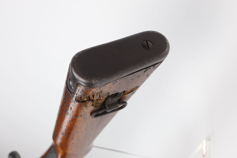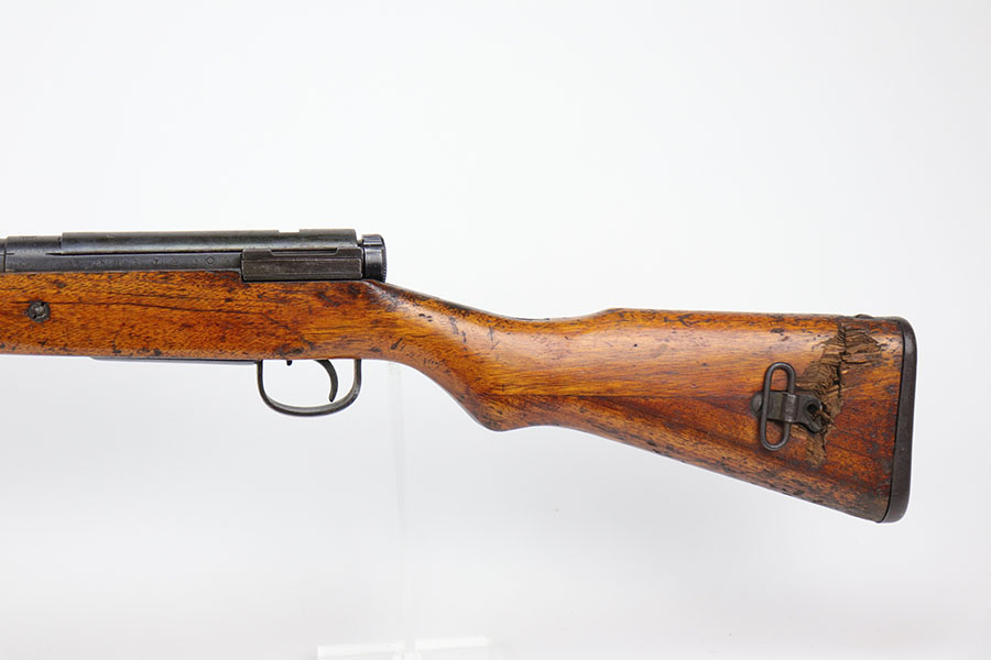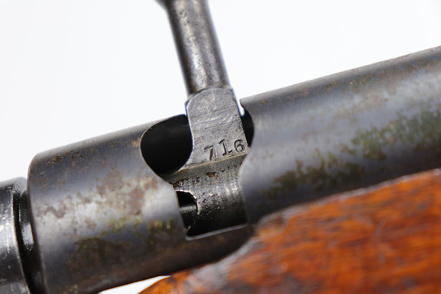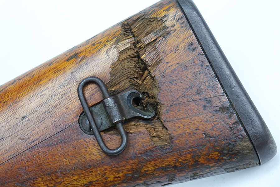 11/12/20 – This is a very cool and all original Arisaka Type 99 that appears to be an authentic battlefield recovery based off the clear bullet damage to the stock. A simple chip or graze in the wood could be caused by many things, but look at the damage to the metal as well. The rifle shows authentic wear but matching numbers throughout, including bolt, bayonet lug and even the dust cover. The rifle also has an original bipod and cleaning rod, as well. There’s obvious thinning and freckling on the metal surfaces but that just lends credence to where this gun has been. Full mum is intact. And somewhat surprisingly, the bore is minty.