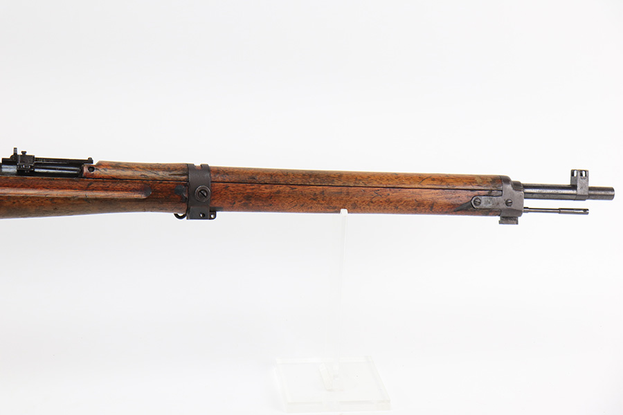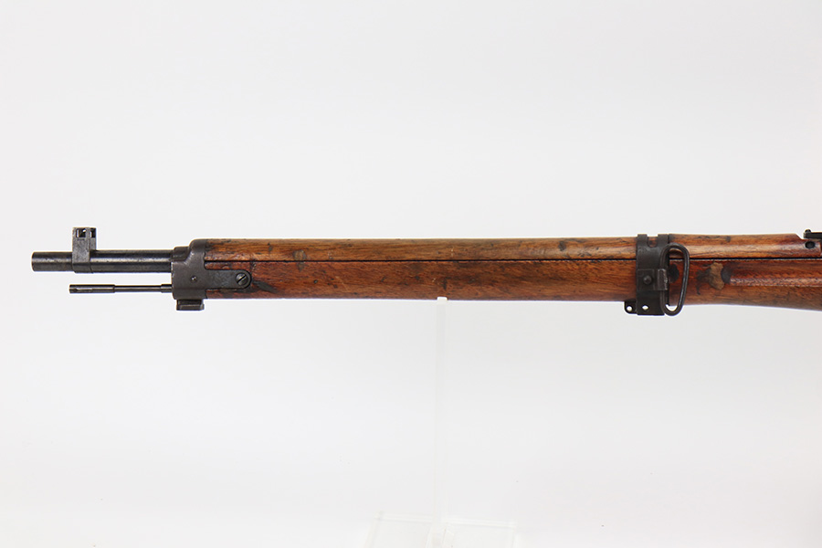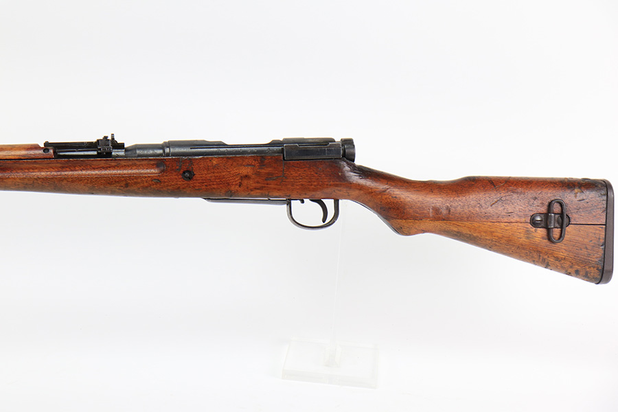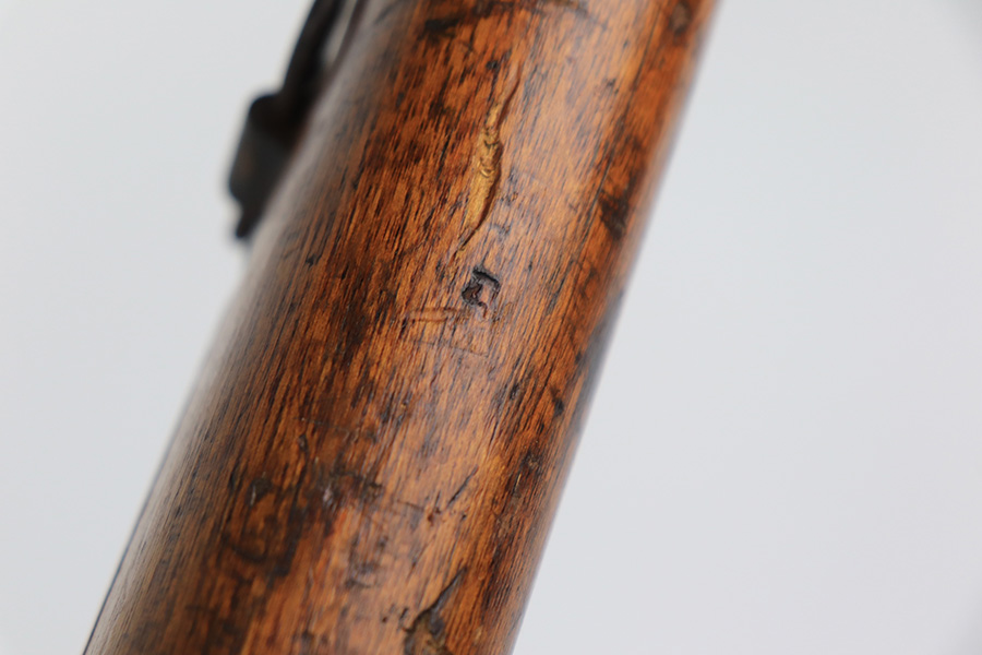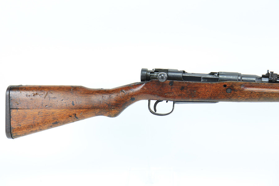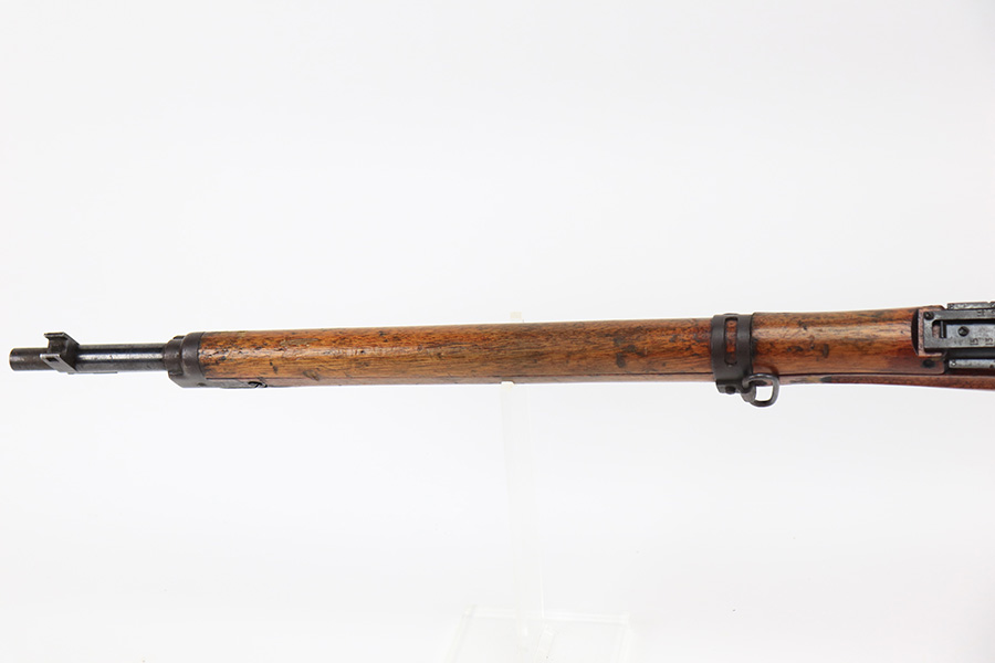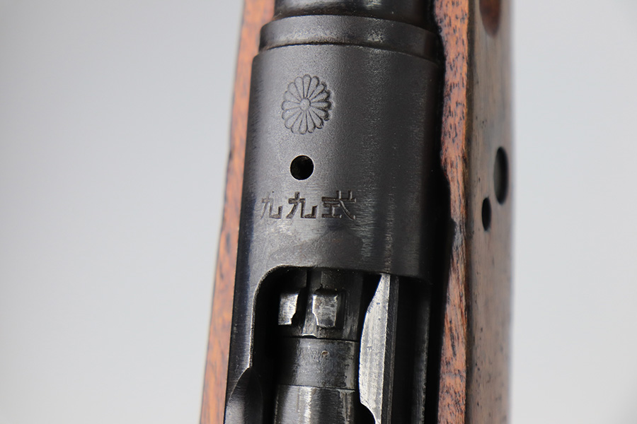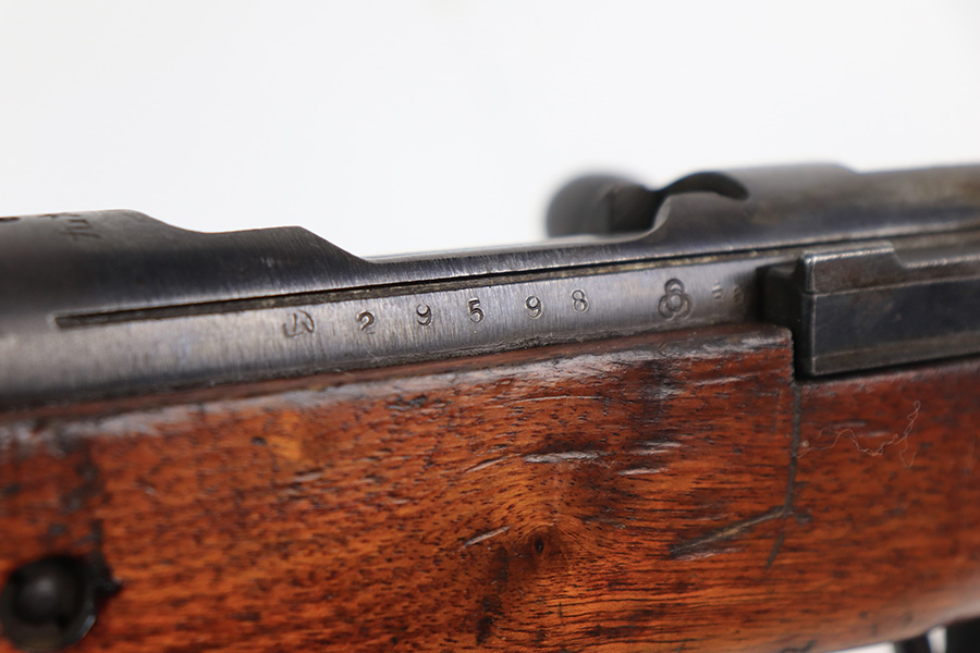 6/9/22 – This is a nice example of an Arisaka Type 99 issued to the Japanese military during WW2. It is all matching and has a fully intact Imperial mum stamp on the receiver. The gun is matching to itself, but the bolt is mismatched. There is pin-pricking on the receiver and on the barrel. Minor muzzle wear. Some thinning and brown patina on the floor plate / trigger group. There is a series of numbers light scratched into the floor plate and wood stock. Heavy brown patinas on the butt plate. The stock has dings, dents, and scratches throughout. Minty bore.