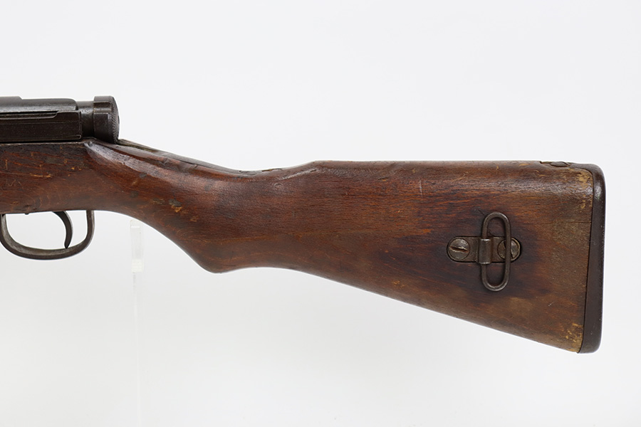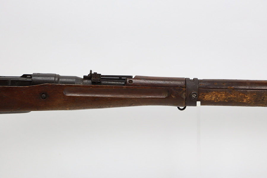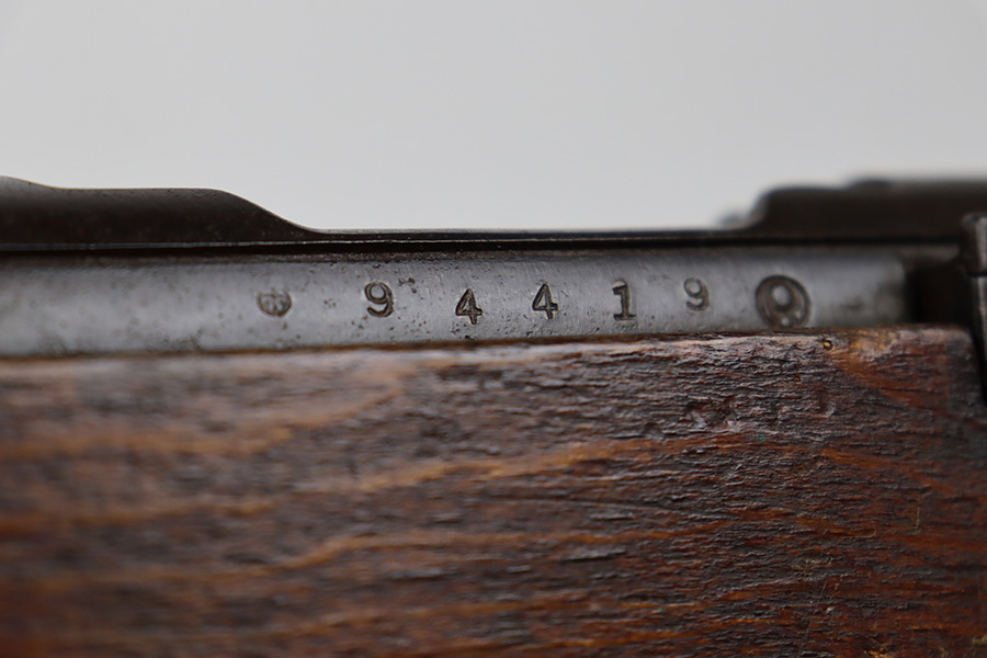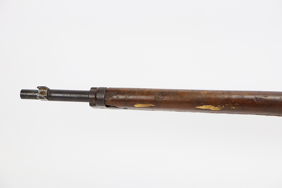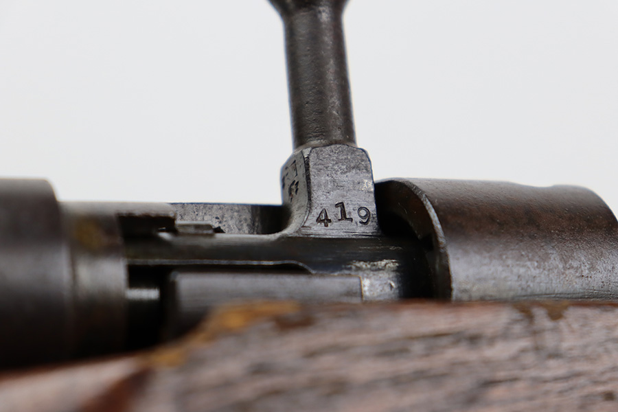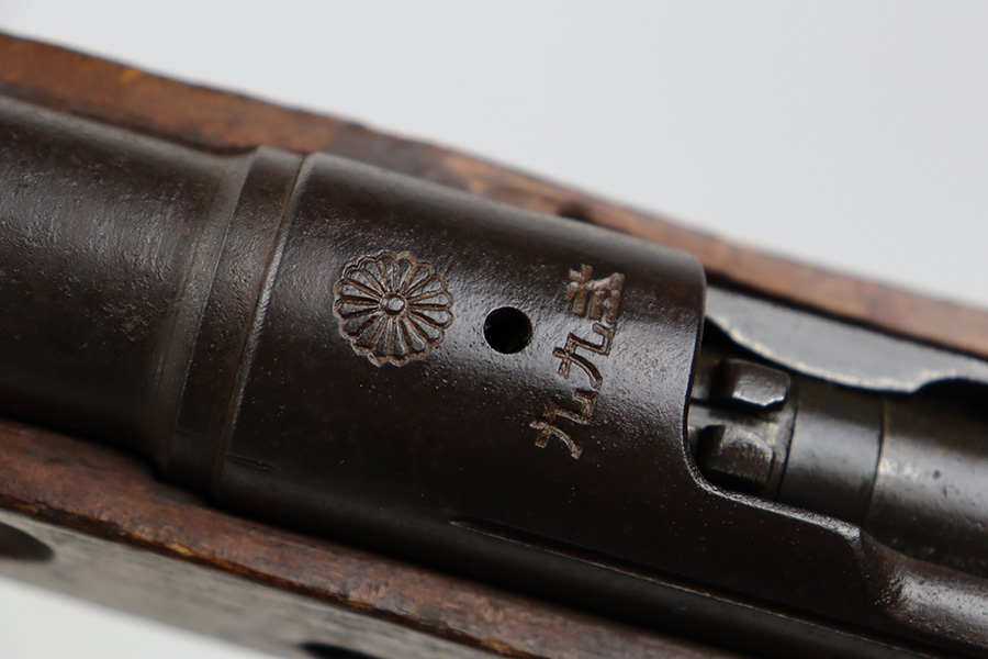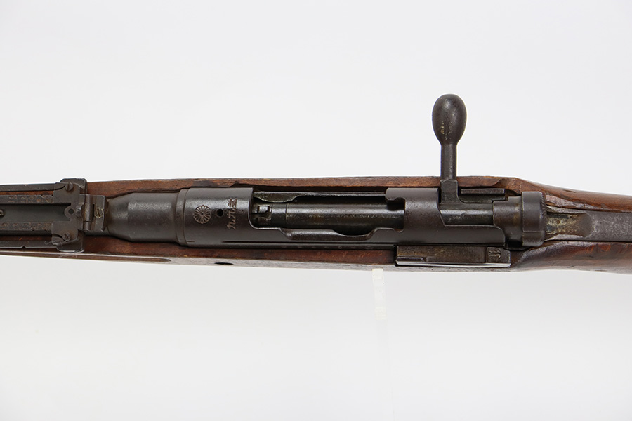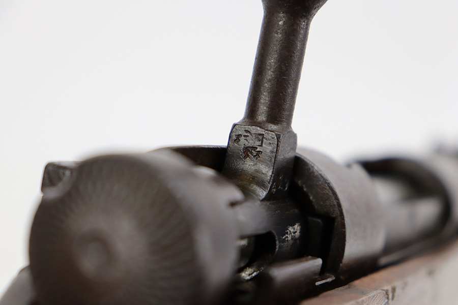 8/17/23 – This is a nice example of an Arisaka Type 99 issued to the Japanese military during WW2. It is all matching and has a completely intact Imperial mum stamp on the receiver. There is very little finish loss, but the metal parts are covered in noticeable brown patina, spotty oxidation, and pin-pricking. The back half of the stock is fine, but the front half has obvious damage, including chipping in the wood around the front barrel band. Excellent, shiny bore with strong rifling.