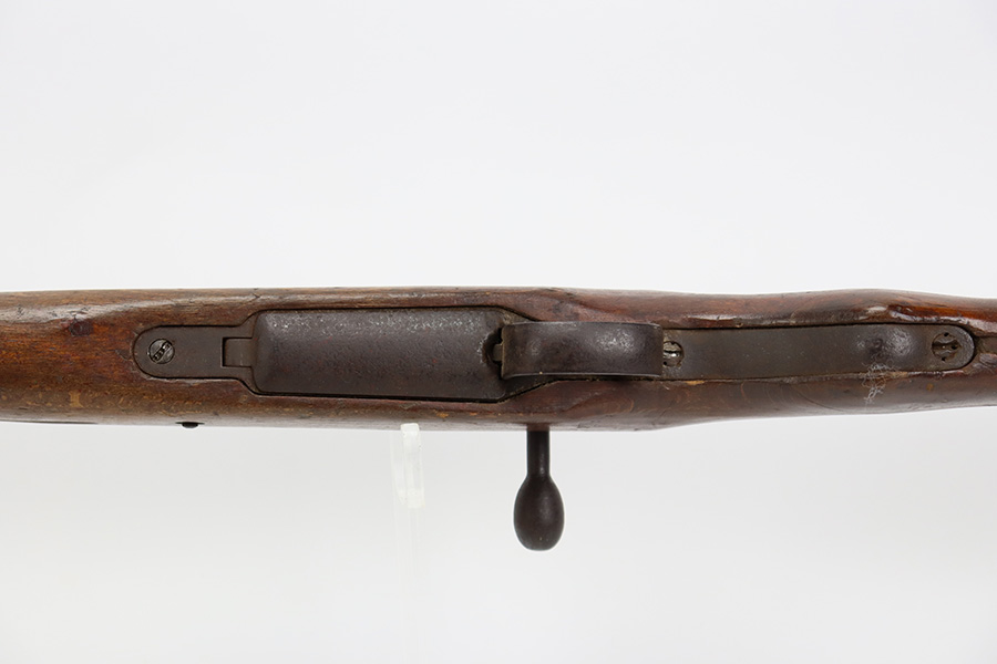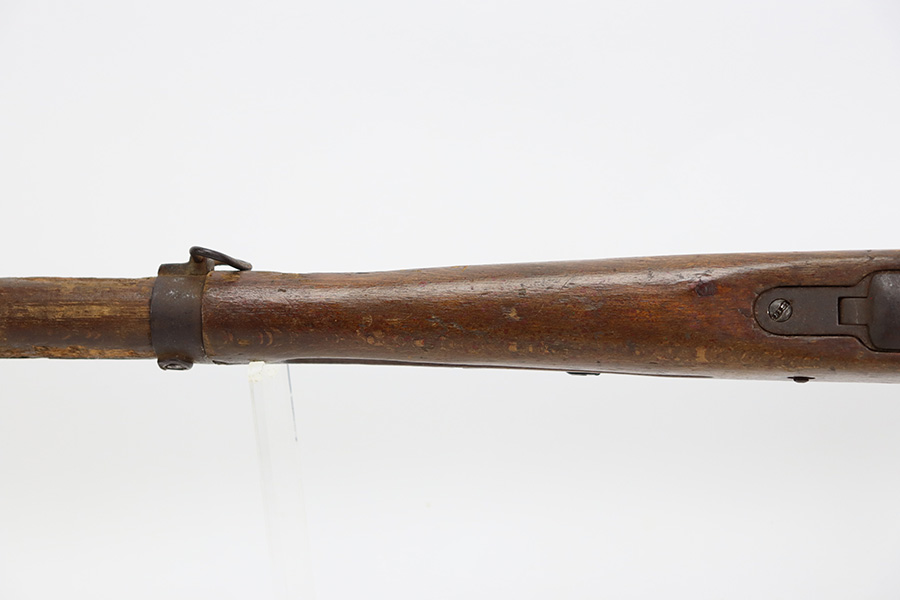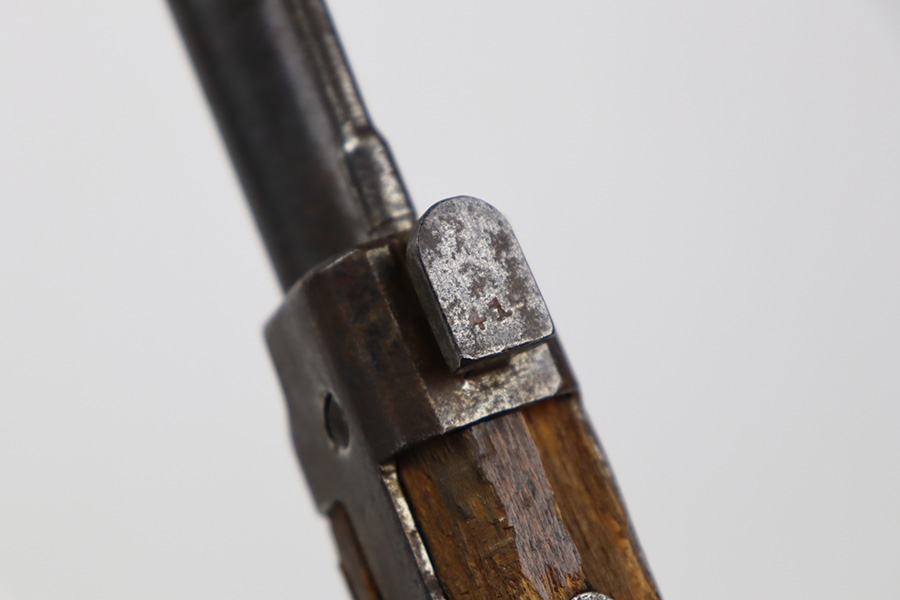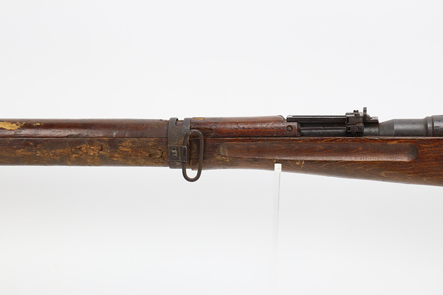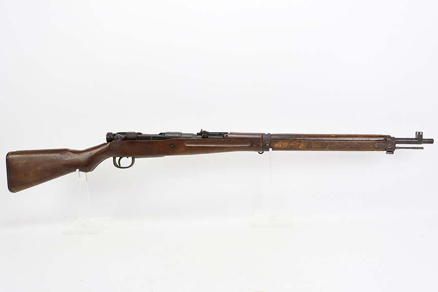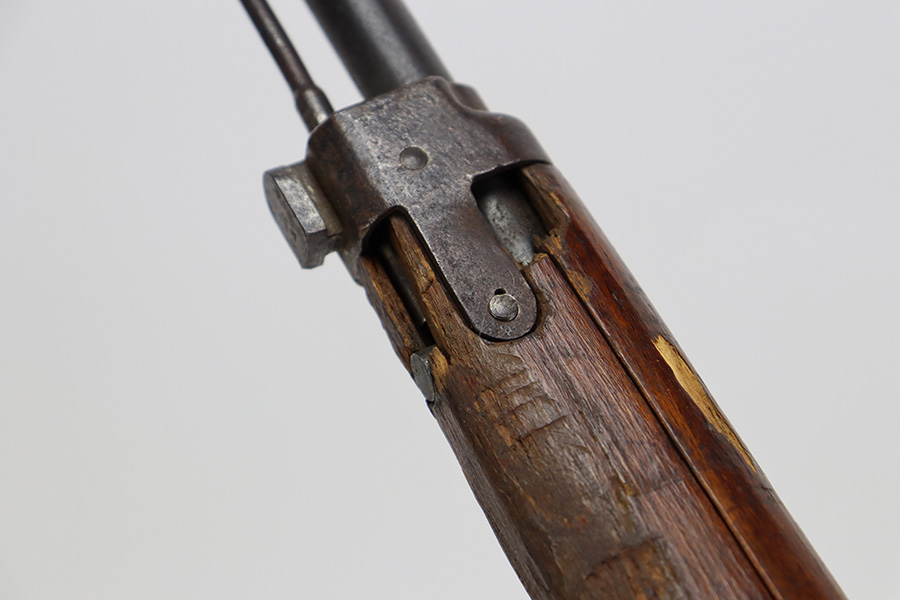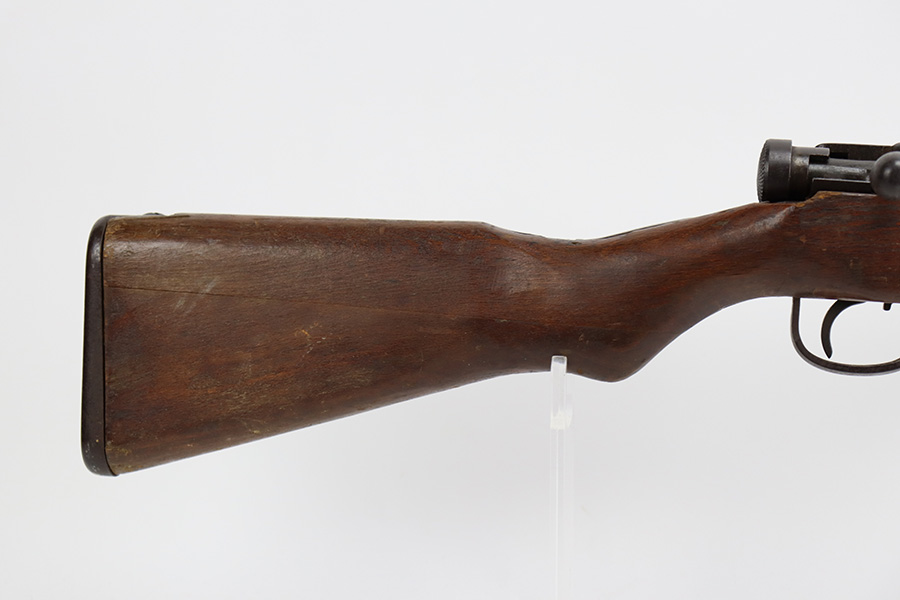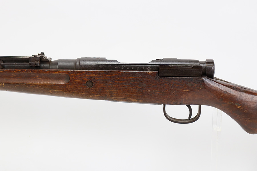 8/17/23 – This is a nice example of an Arisaka Type 99 issued to the Japanese military during WW2. It is all matching and has a completely intact Imperial mum stamp on the receiver. There is very little finish loss, but the metal parts are covered in noticeable brown patina, spotty oxidation, and pin-pricking. The back half of the stock is fine, but the front half has obvious damage, including chipping in the wood around the front barrel band. Excellent, shiny bore with strong rifling.
