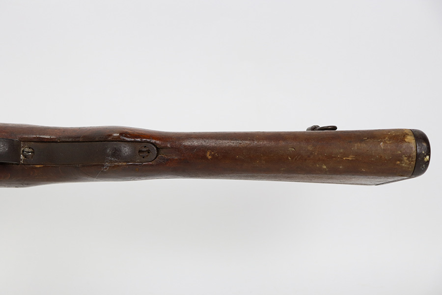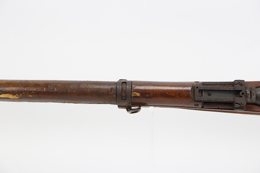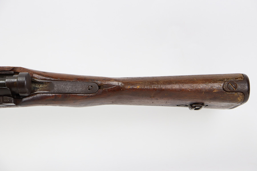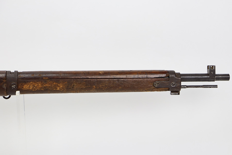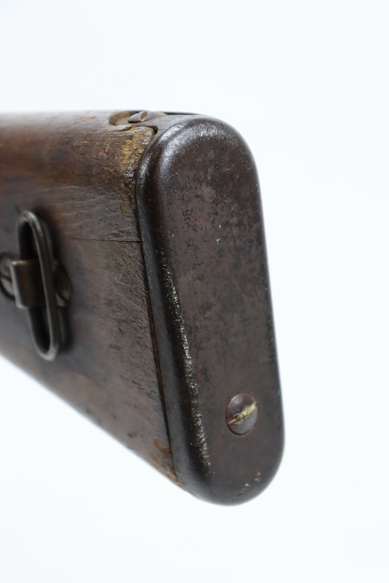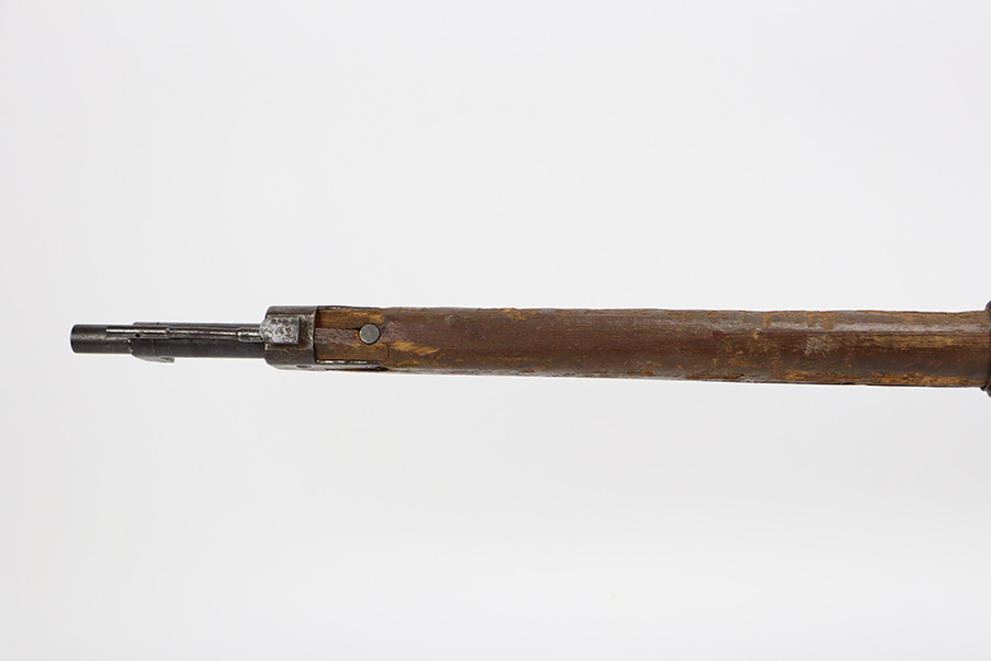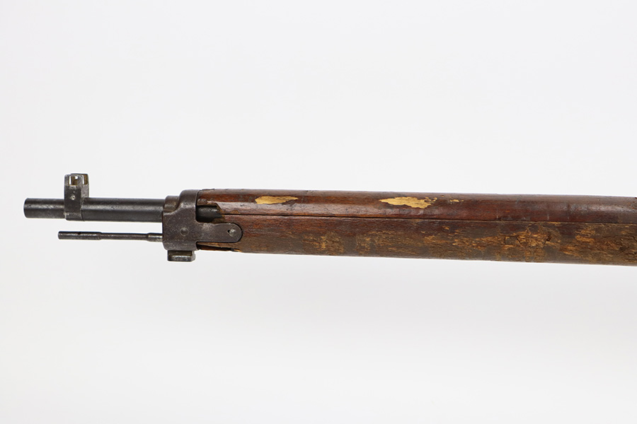 8/17/23 – This is a nice example of an Arisaka Type 99 issued to the Japanese military during WW2. It is all matching and has a completely intact Imperial mum stamp on the receiver. There is very little finish loss, but the metal parts are covered in noticeable brown patina, spotty oxidation, and pin-pricking. The back half of the stock is fine, but the front half has obvious damage, including chipping in the wood around the front barrel band. Excellent, shiny bore with strong rifling.