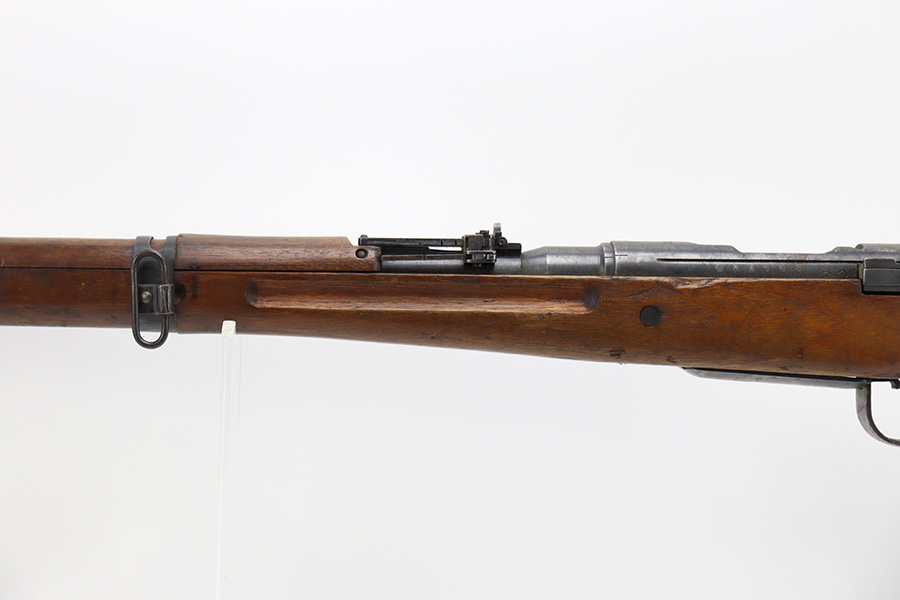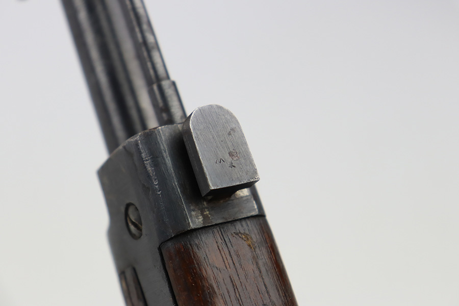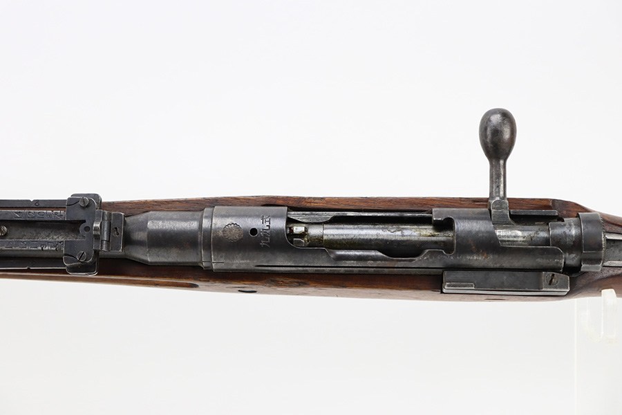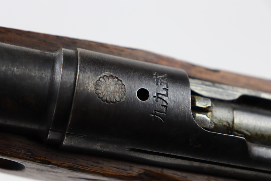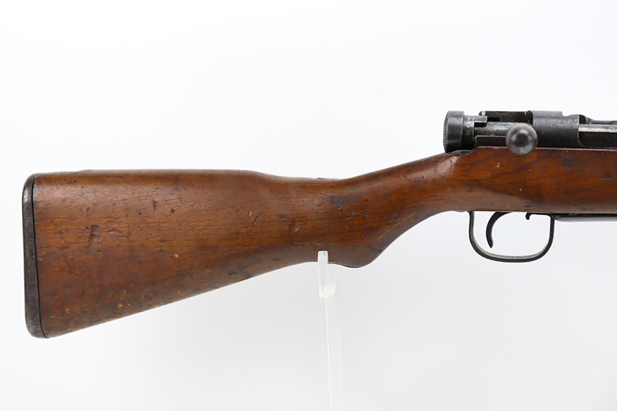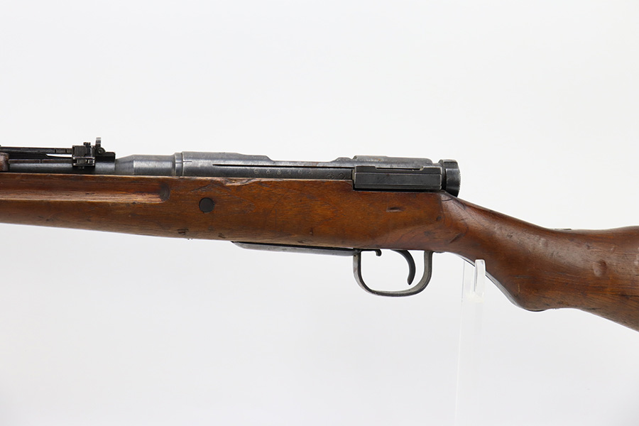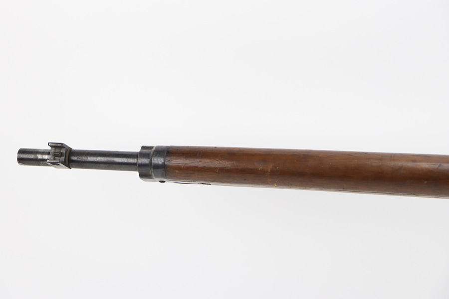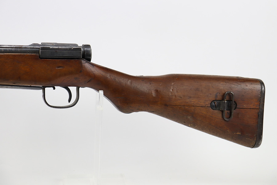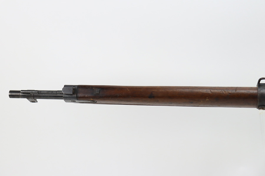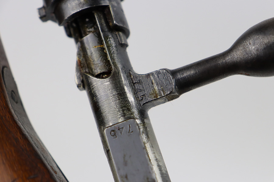 2/6/24 – This is an Arisaka Type 99 issued to the Japanese military during WW2. The bolt is mismatched. The Imperial mum stamp on the receiver is mostly visible, but it has been defaced. The finish on the metal parts rates somewhere between 85-90%. Minor thinning on the receiver and on the floor plate. Light spotty oxidation on most of the metal parts. No major damage to the wood, but it shows the typical signs of wear and use. Mint bore.