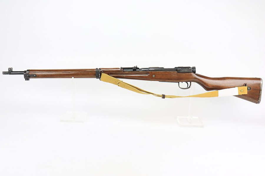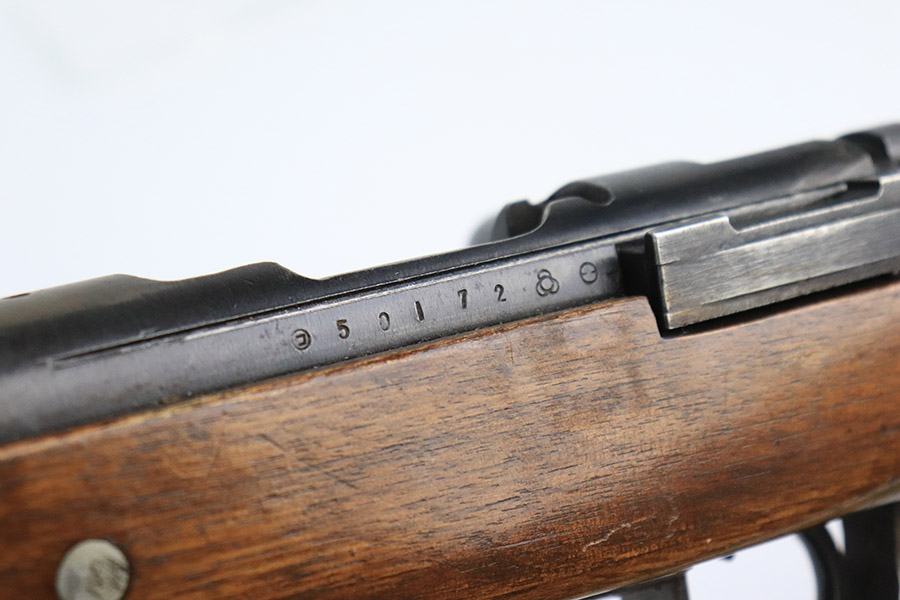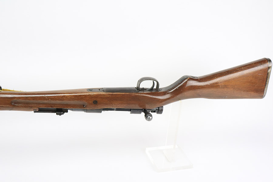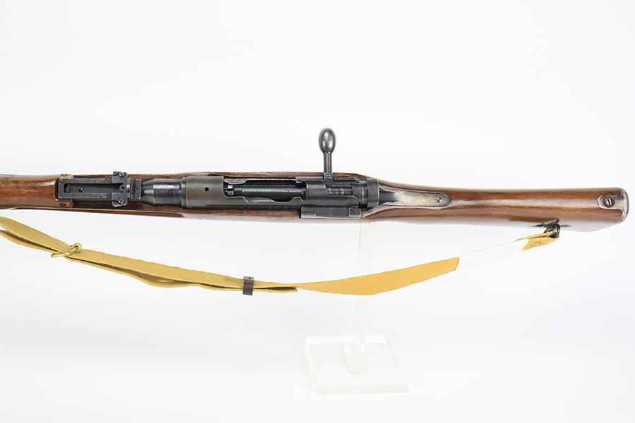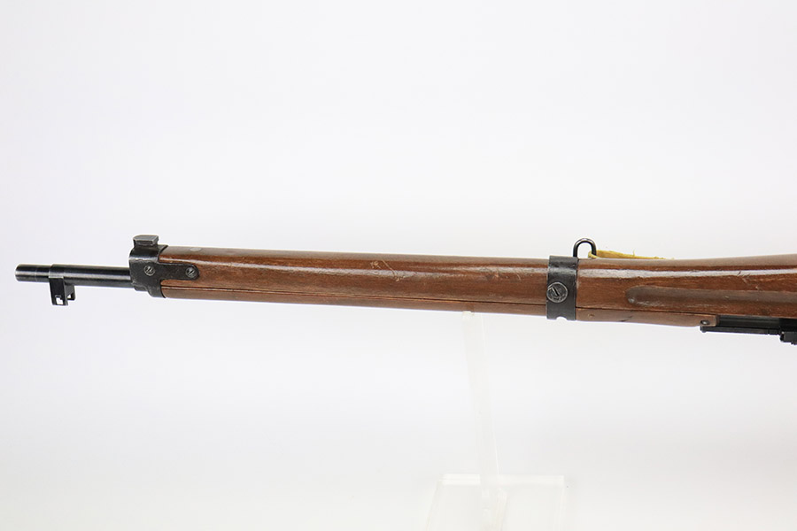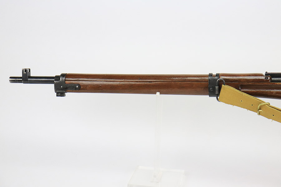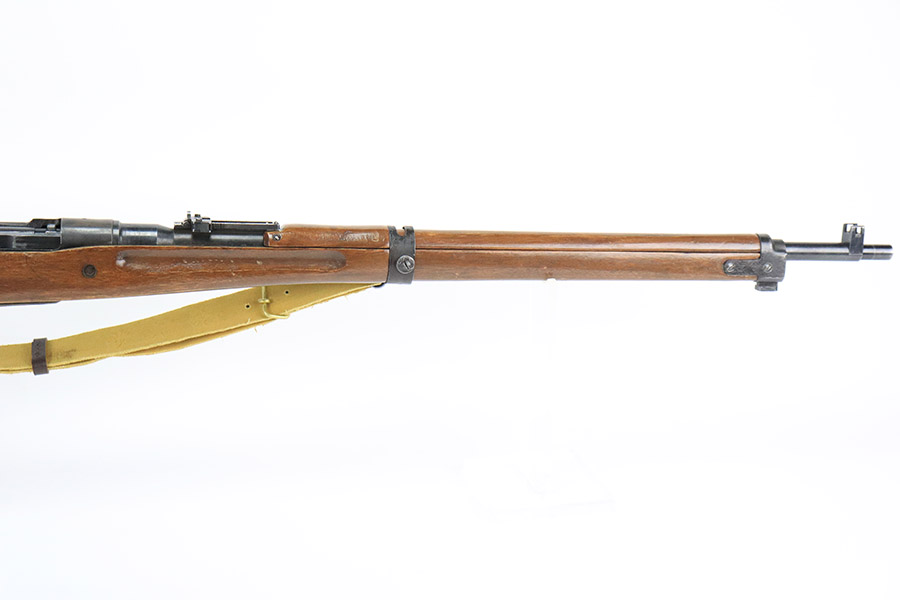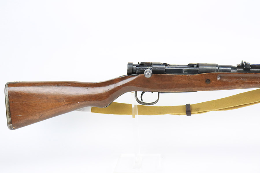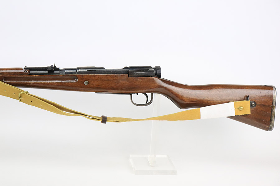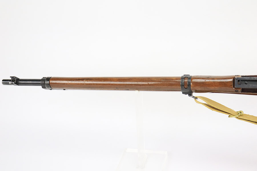 12/8/22 – This is a very nice example of an Arisaka Type 99 rifle issued to the Japanese military during WW2. It is all matching, but unfortunately the Imperial mum stamp on the receiver has been ground. The gun has retained roughly 85% of its original finish. There is minor muzzle wear and wear around the high edges in general. More noticeable finish loss on the butt plate and on the top of the receiver. Spotty oxidation on the butt plate as well. Some thinning and minor pitting on the floor plate / trigger group. The wood stock is excellent with only light scratches here and there, but it appears to have been sanded and laminated. Comes with a nice reproduction canvas sling.