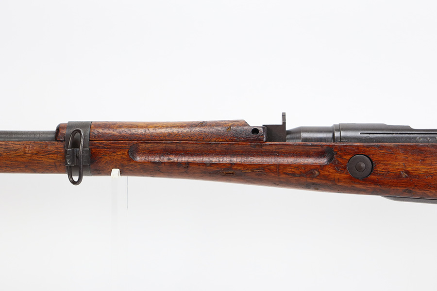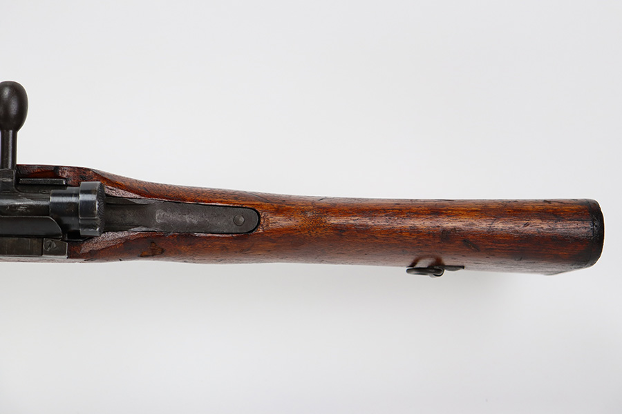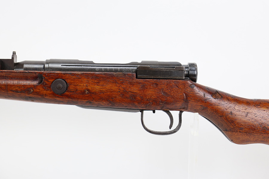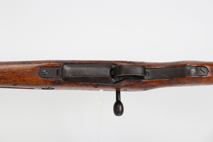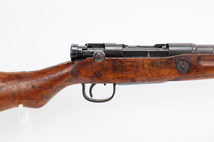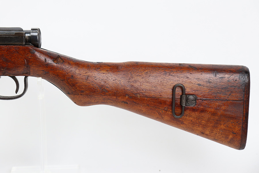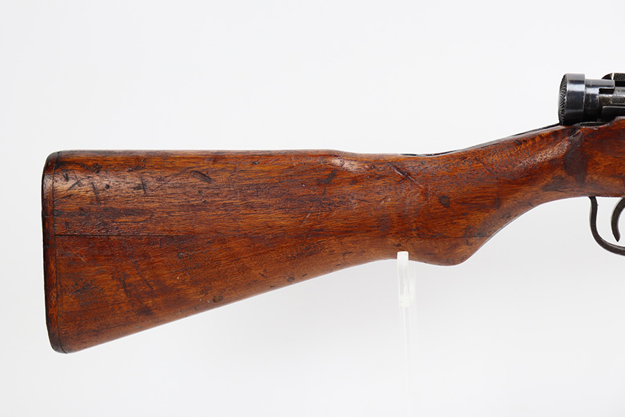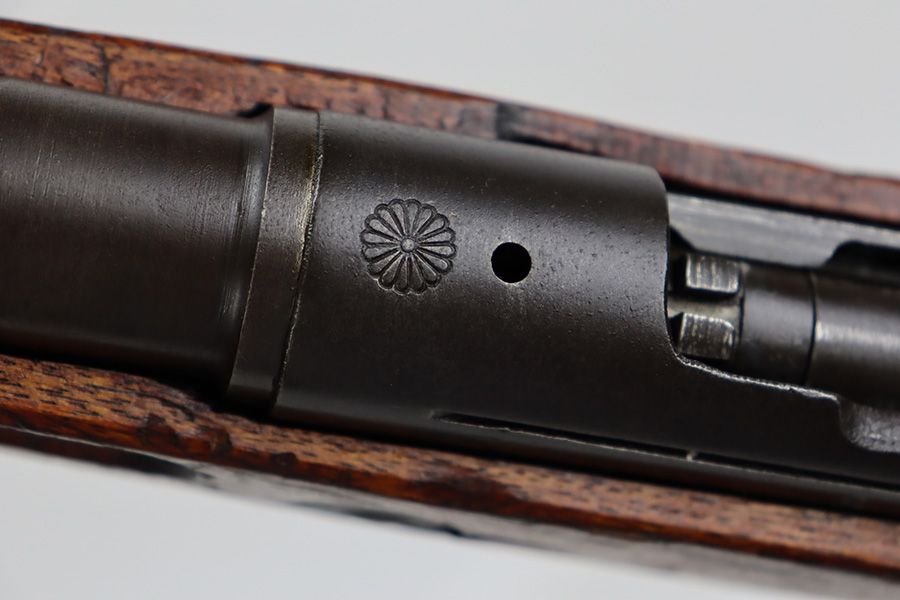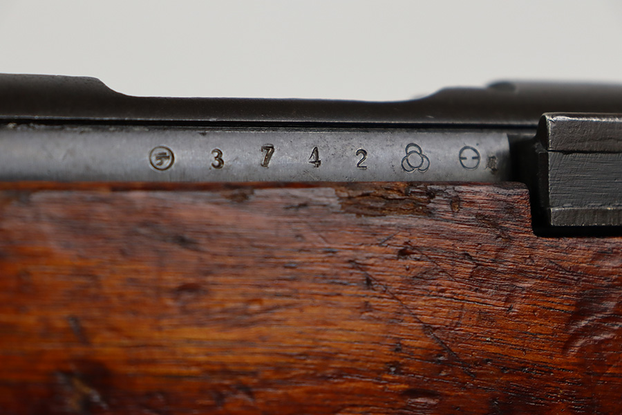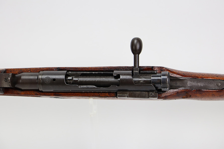 8/30/23 – This is an excellent example of an Arisaka Type 99 rifle issued to the Japanese military during WW2. It has some late-war features, such as peep-style rear sight, crude machining, and a wooden butt plate. The cocking knob and firing pin are mismatched, but it has a fully intact Imperial mum stamp on the receiver. The metal parts have retained nearly all of their finish with very minor wear on the high edges of the floor plate. The wood stock shows all of the typical signs of wear and use – there are a few more noticeable gouges here and there. Stone-mint bore.