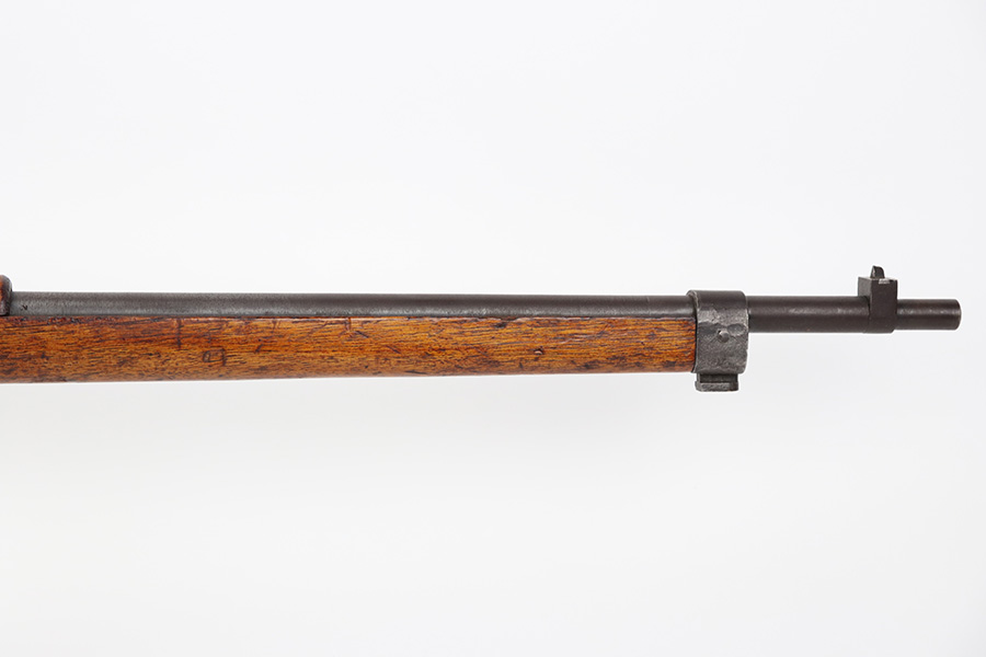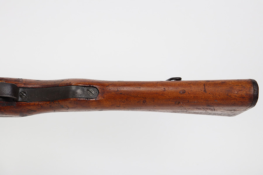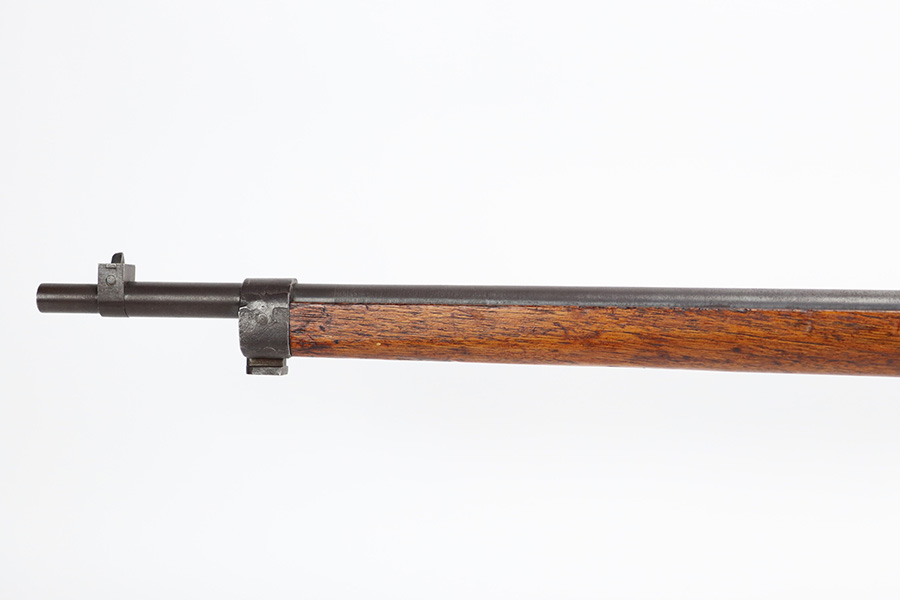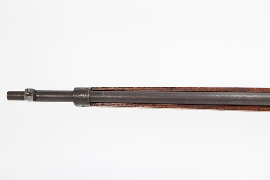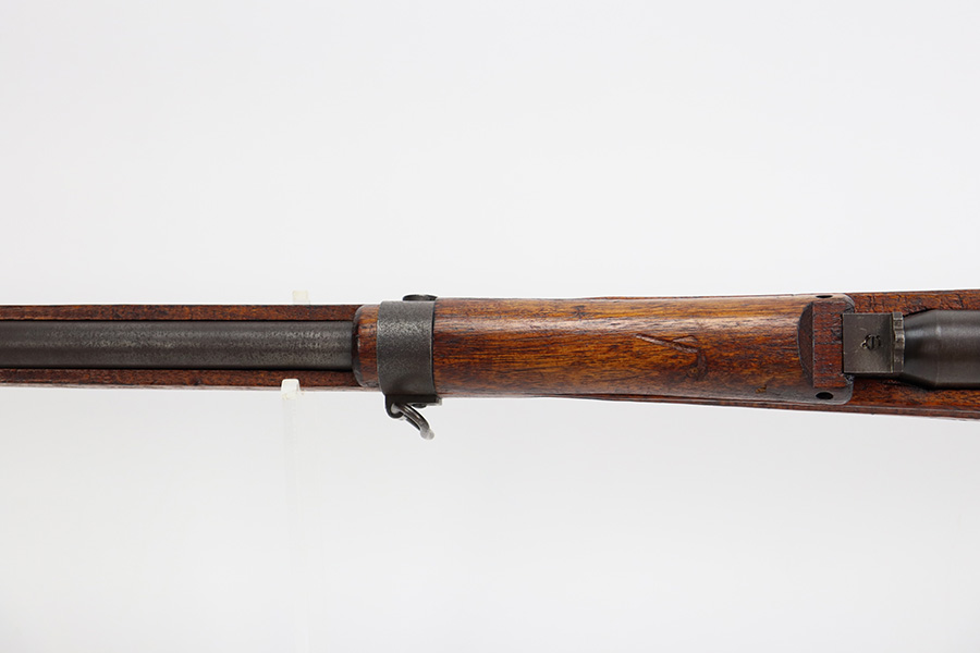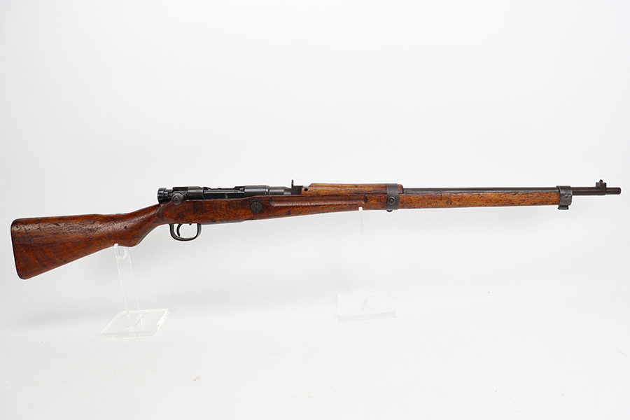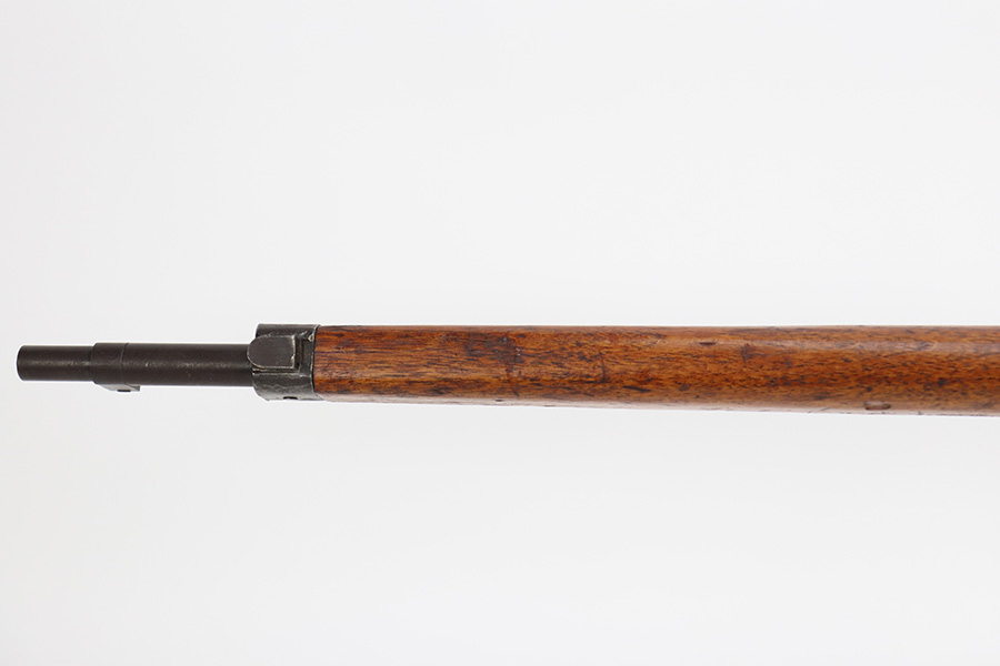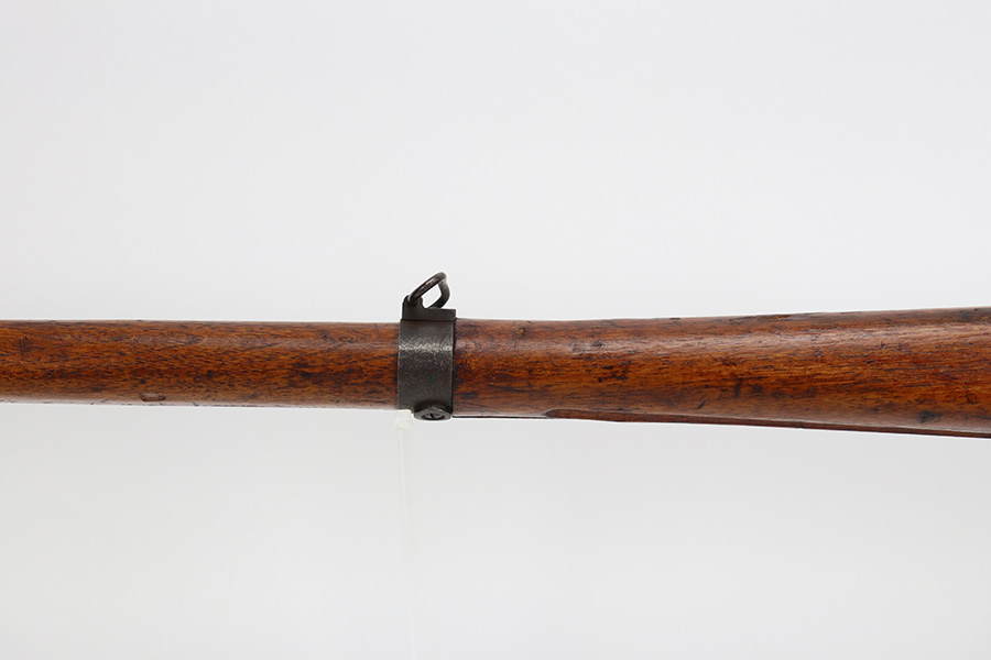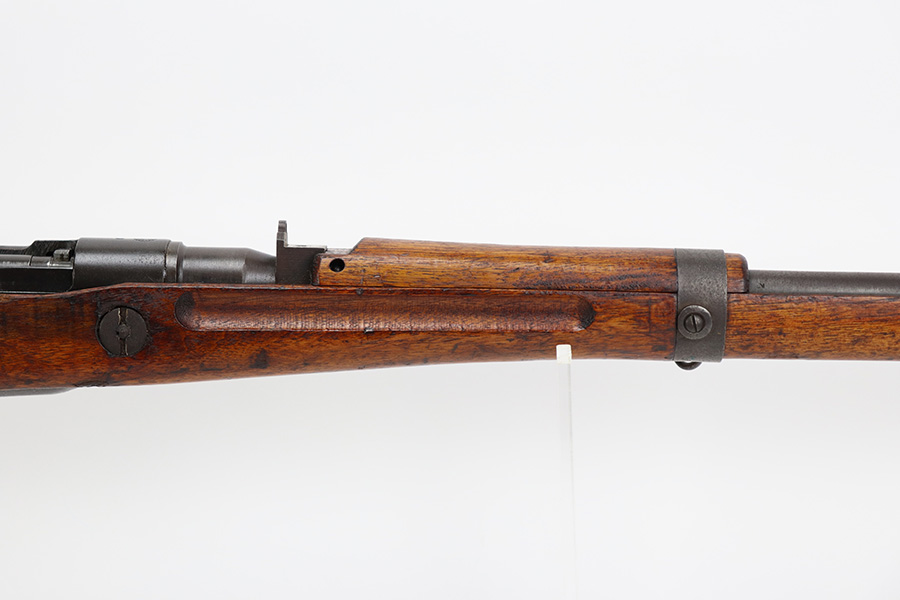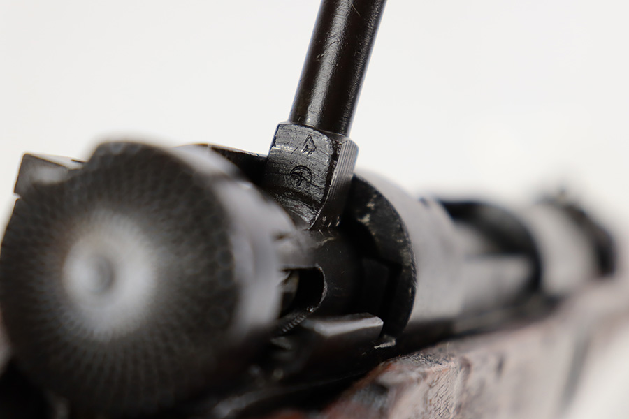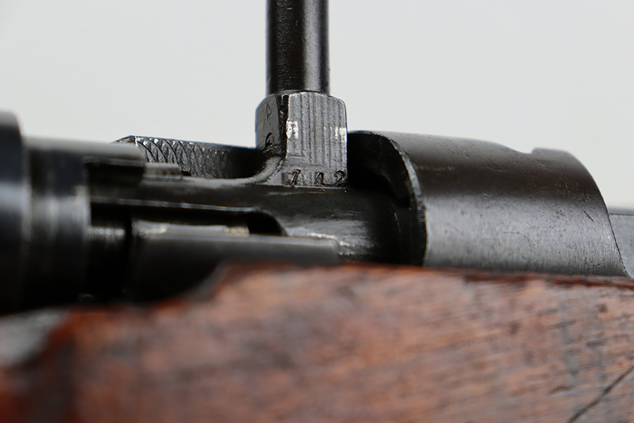 8/30/23 – This is an excellent example of an Arisaka Type 99 rifle issued to the Japanese military during WW2. It has some late-war features, such as peep-style rear sight, crude machining, and a wooden butt plate. The cocking knob and firing pin are mismatched, but it has a fully intact Imperial mum stamp on the receiver. The metal parts have retained nearly all of their finish with very minor wear on the high edges of the floor plate. The wood stock shows all of the typical signs of wear and use – there are a few more noticeable gouges here and there. Stone-mint bore.