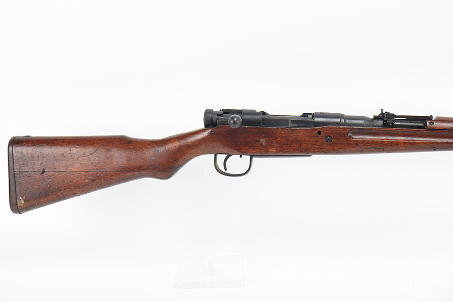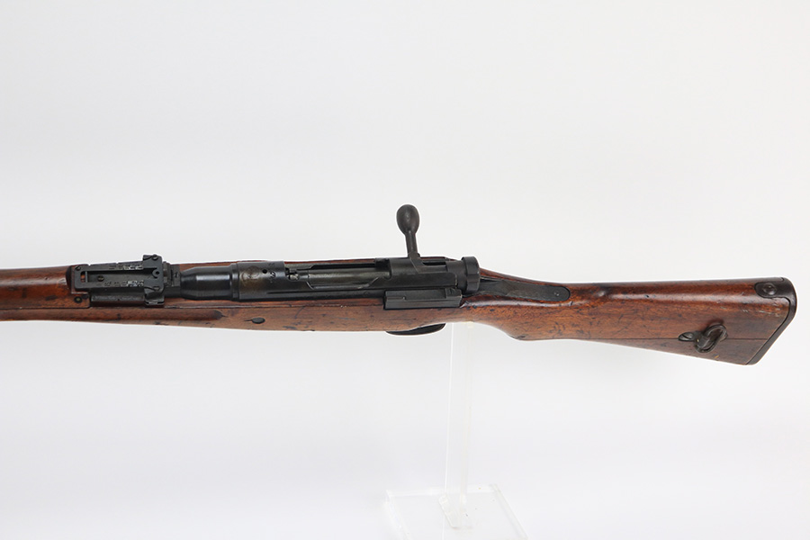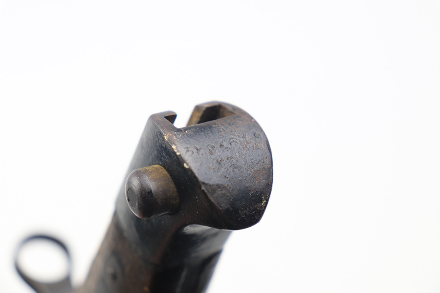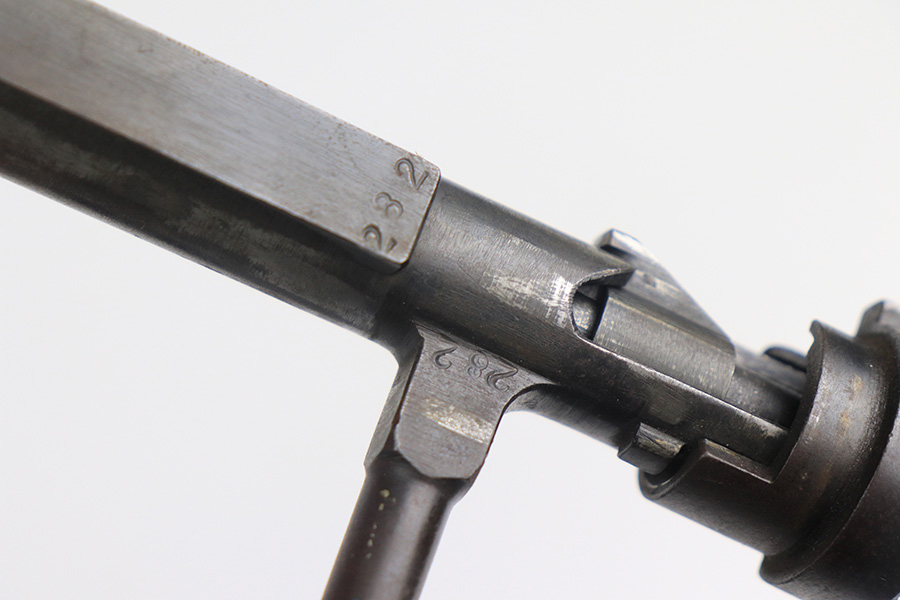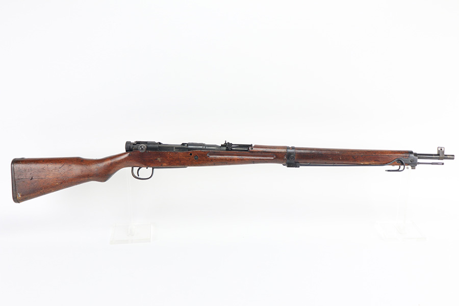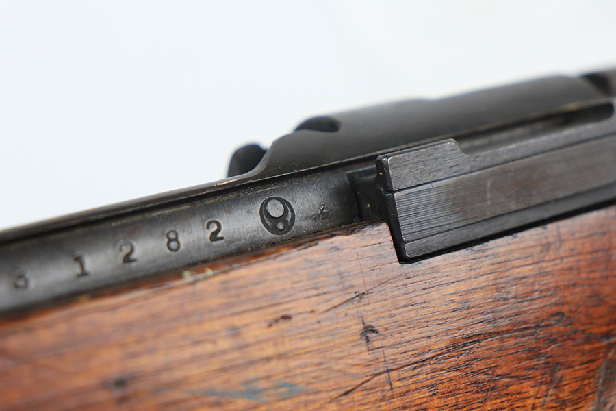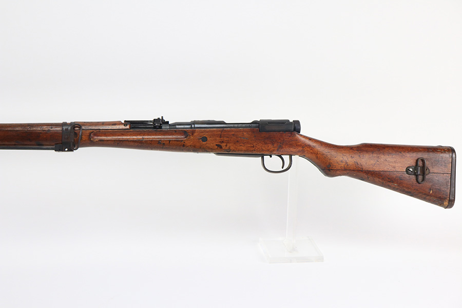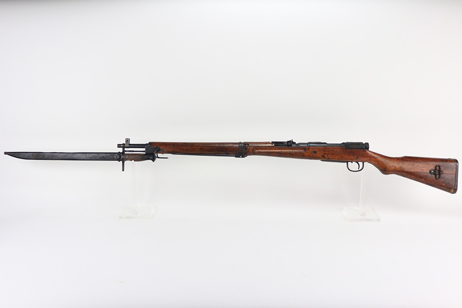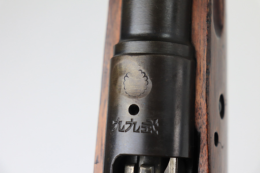 12/16/21 – This is a very nice example of an Arisaka Type 99 Rifle issued to the Japanese military during WW2. The mum stamp on the receiver is only partially visible (mostly ground off), but all of the parts are matching. This one comes with an original bayonet, scabbard, cleaning rod, and monopod. Overall, the gun is in very nice condition. There is very little actual finish loss, but there is spotty oxidation throughout, especially on the barrel bands and floor plate. There is scratchy wear around the muzzle. The stock is in nice condition with minor dings, dents, and scratches throughout. The bore is near-mint – shiny with very strong rifling.