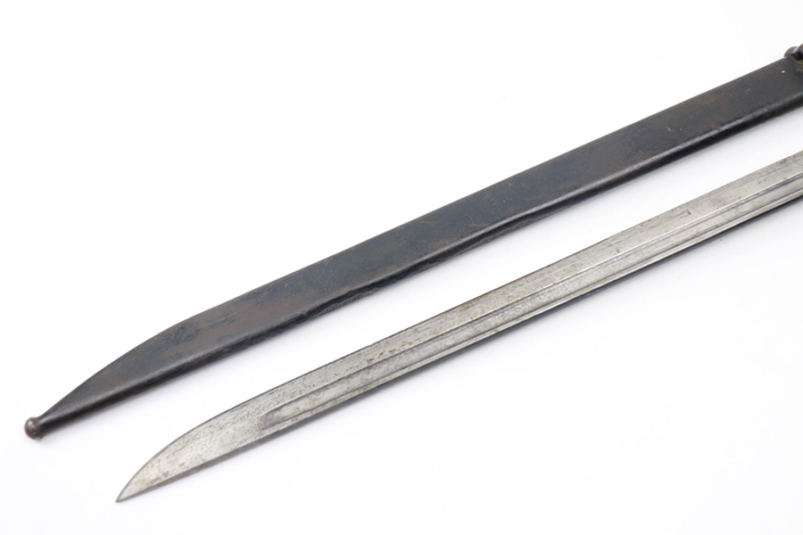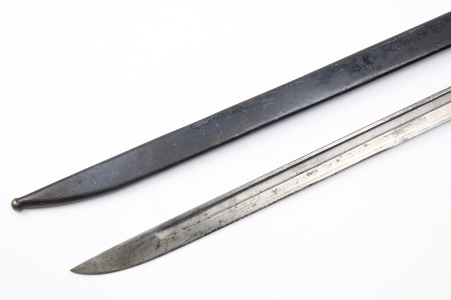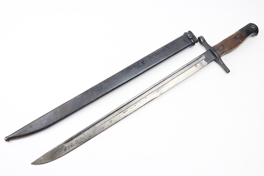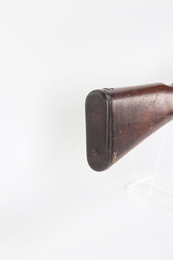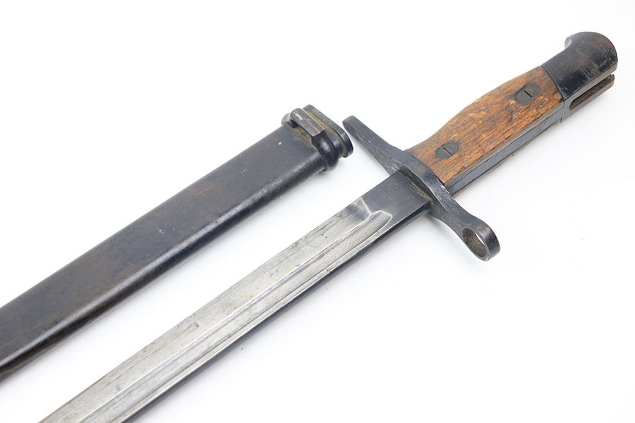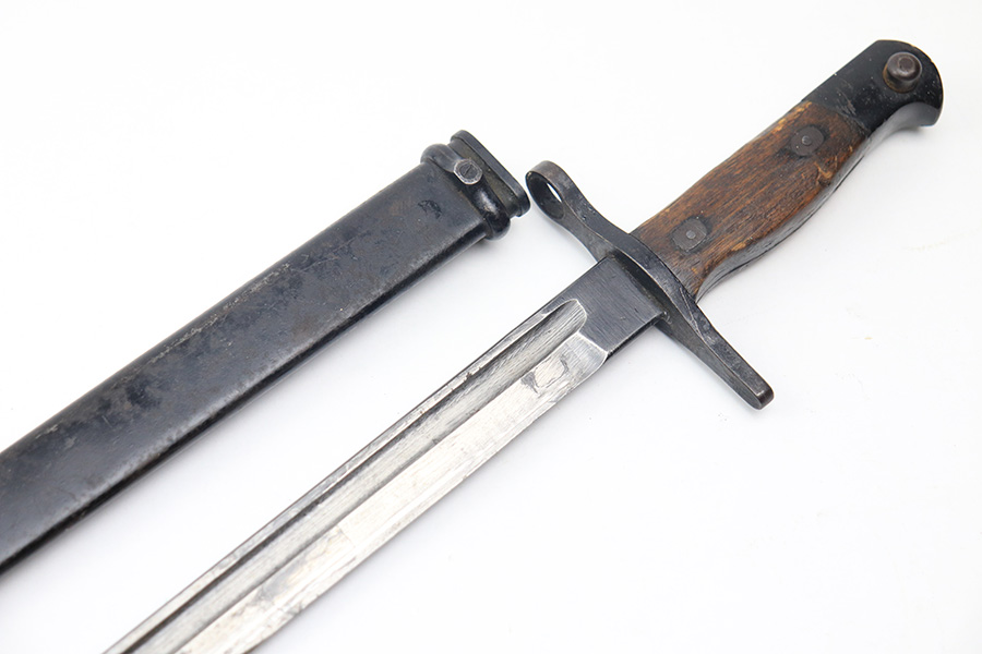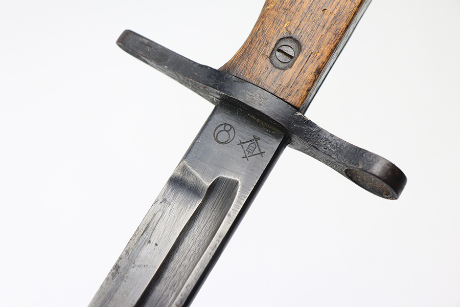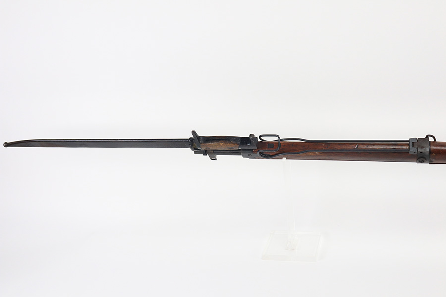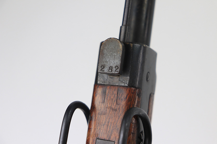 12/16/21 – This is a very nice example of an Arisaka Type 99 Rifle issued to the Japanese military during WW2. The mum stamp on the receiver is only partially visible (mostly ground off), but all of the parts are matching. This one comes with an original bayonet, scabbard, cleaning rod, and monopod. Overall, the gun is in very nice condition. There is very little actual finish loss, but there is spotty oxidation throughout, especially on the barrel bands and floor plate. There is scratchy wear around the muzzle. The stock is in nice condition with minor dings, dents, and scratches throughout. The bore is near-mint – shiny with very strong rifling.