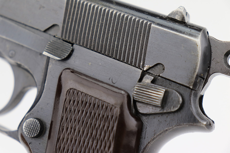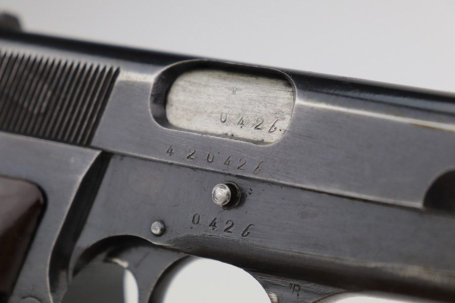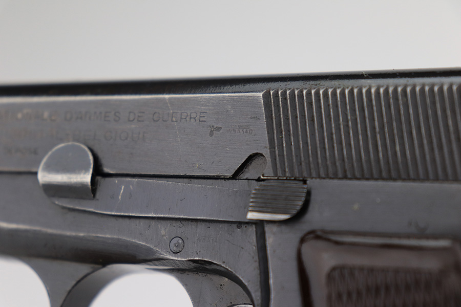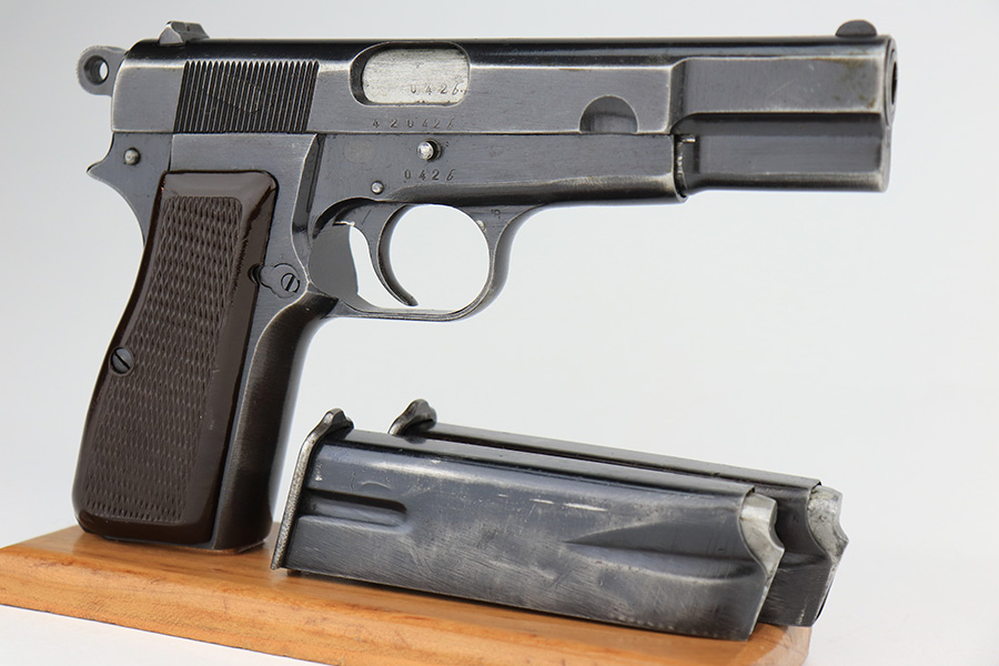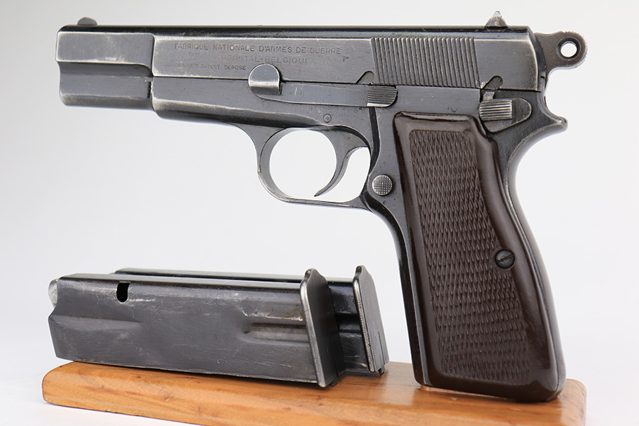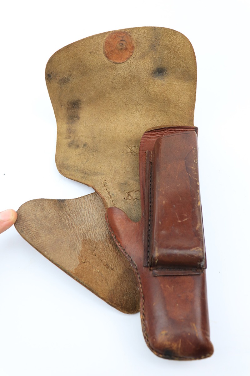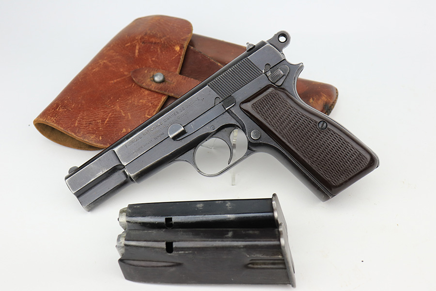 1/20/23 – This is a complete and original Nazi FN Browning High Power rig from ~1944. The pistol is matching throughout with 85-90% blue remaining. Holster wear on most of the high edges, and some finish loss on the straps. Excellent bore. Very nice grips with no cracks or chips. Two period original but unmarked mags. The rig is completed by a ‘dld’ maker-marked holster with sharp waffenamt and ’44 date. It shows some age and softening of the leather but no major issues.