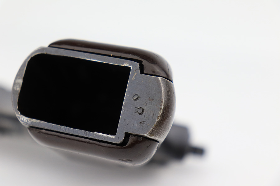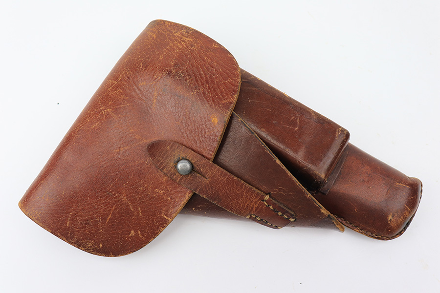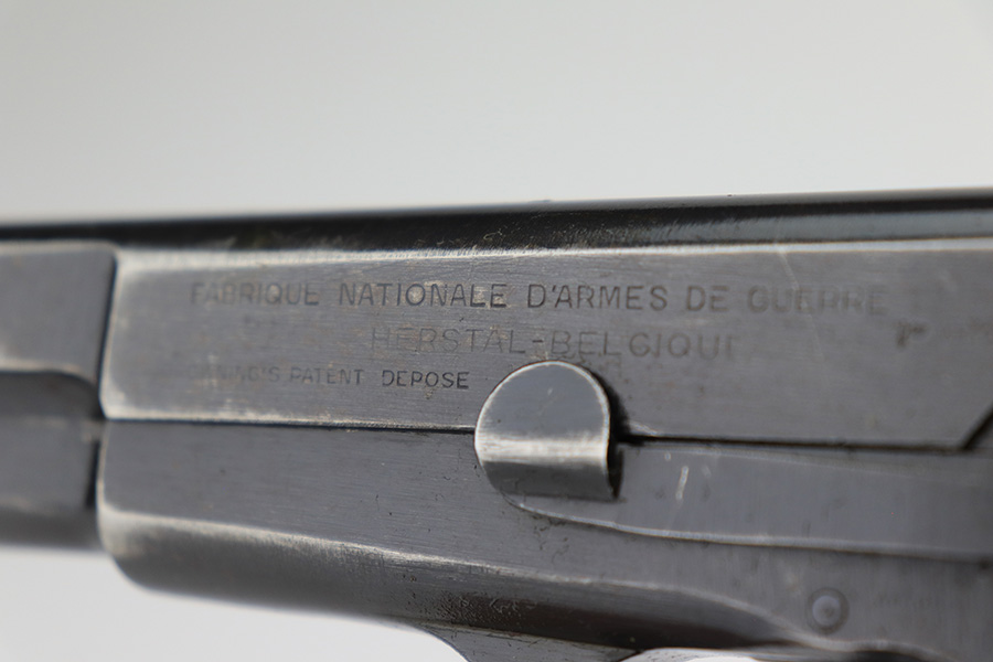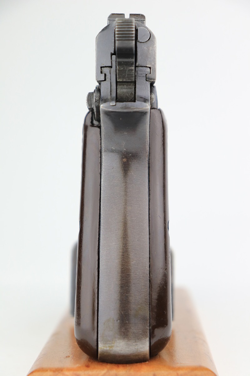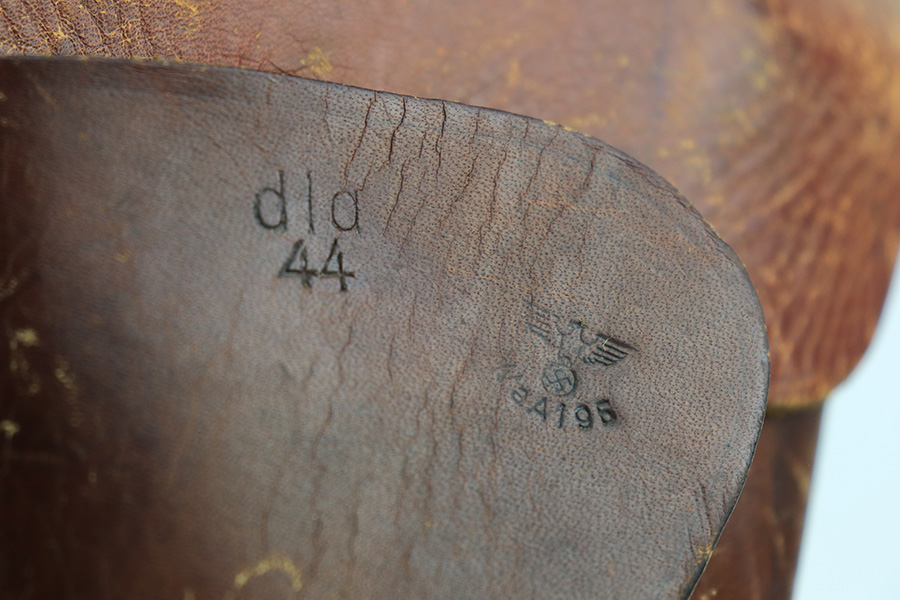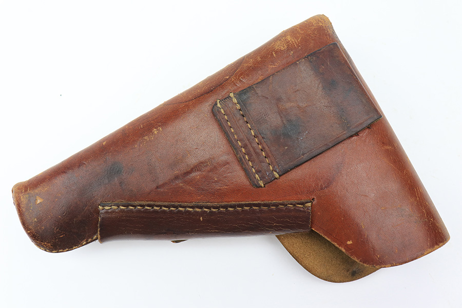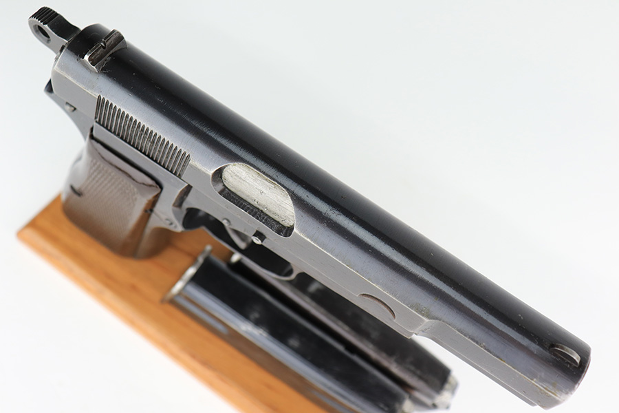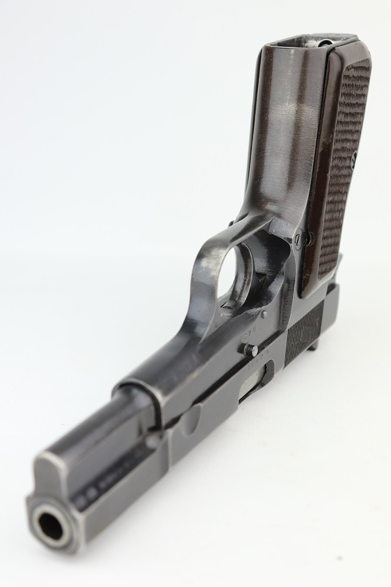 1/20/23 – This is a complete and original Nazi FN Browning High Power rig from ~1944. The pistol is matching throughout with 85-90% blue remaining. Holster wear on most of the high edges, and some finish loss on the straps. Excellent bore. Very nice grips with no cracks or chips. Two period original but unmarked mags. The rig is completed by a ‘dld’ maker-marked holster with sharp waffenamt and ’44 date. It shows some age and softening of the leather but no major issues.