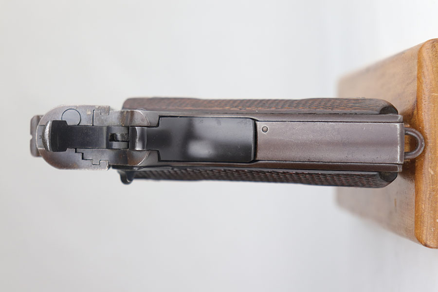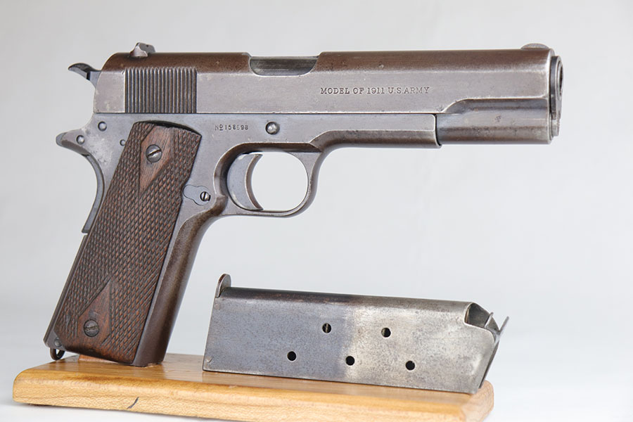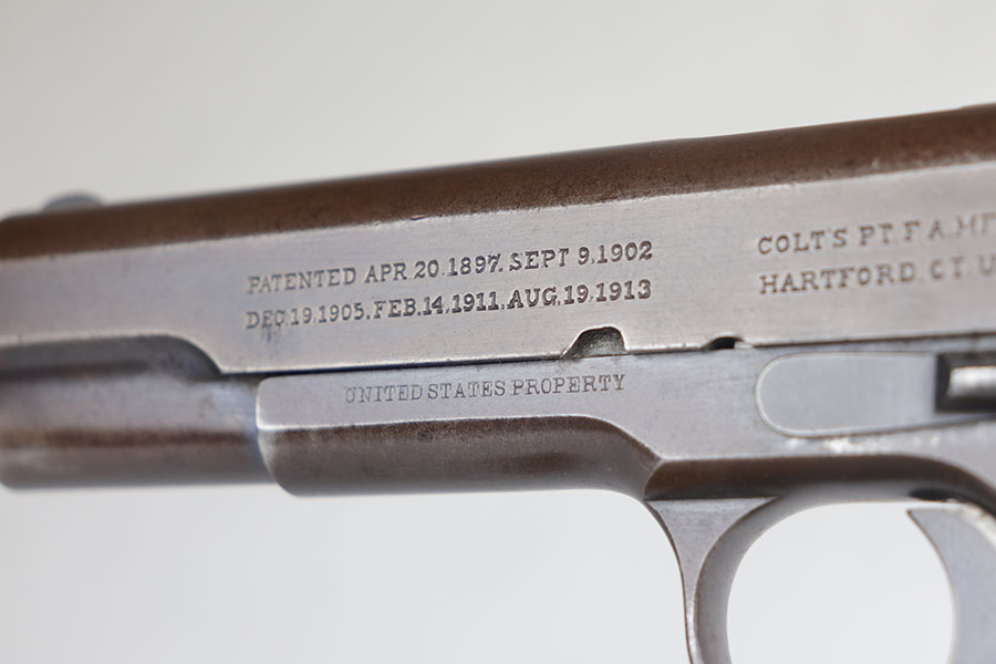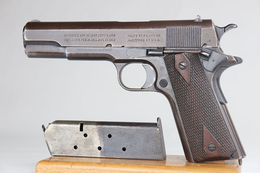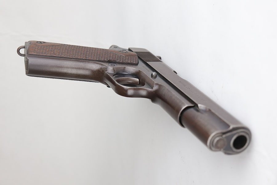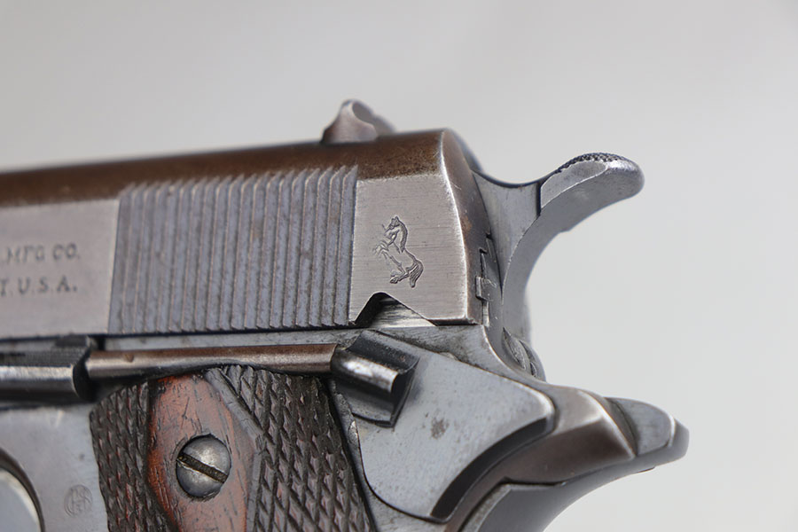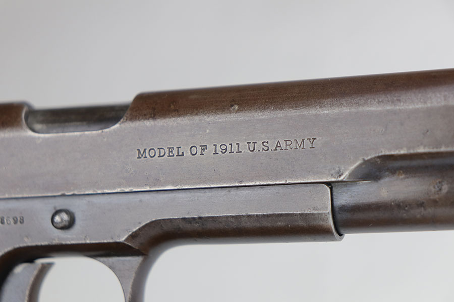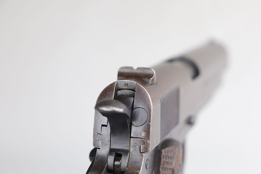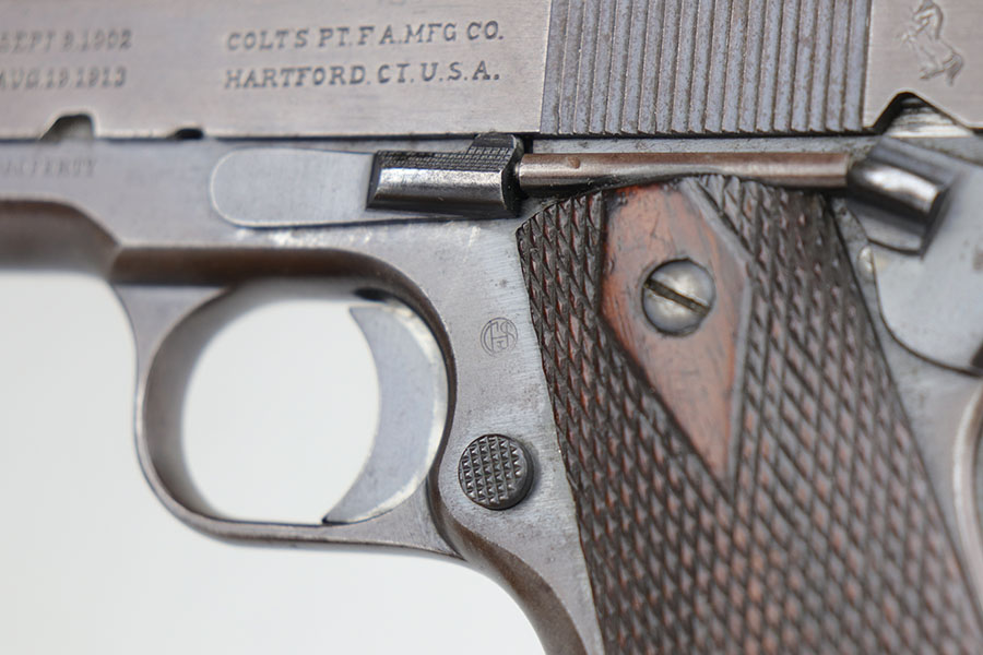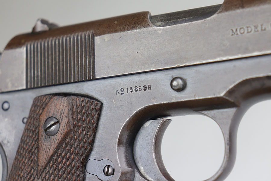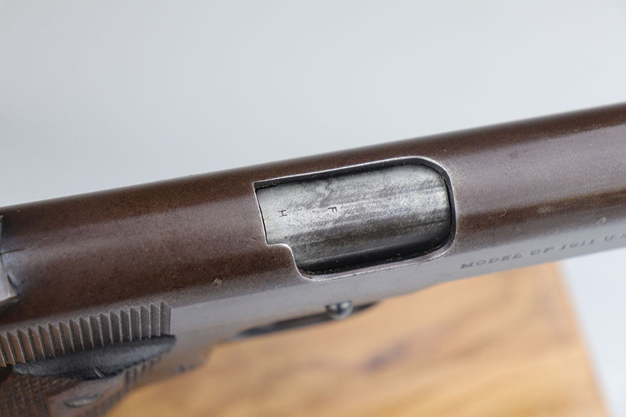 7/30/20 – This is an original Colt M1911 from 1918. The pistol shows patina and thinning throughout, but no major defects otherwise, just a little freckling on the right side of the slide. Correctly marked barrel and slide. Proper inspectors mark on frame. Barrel has pronounced rifling but some frost and freckling throughout. Grips have some smoothing but no cracks. Proper two-tone magazine.