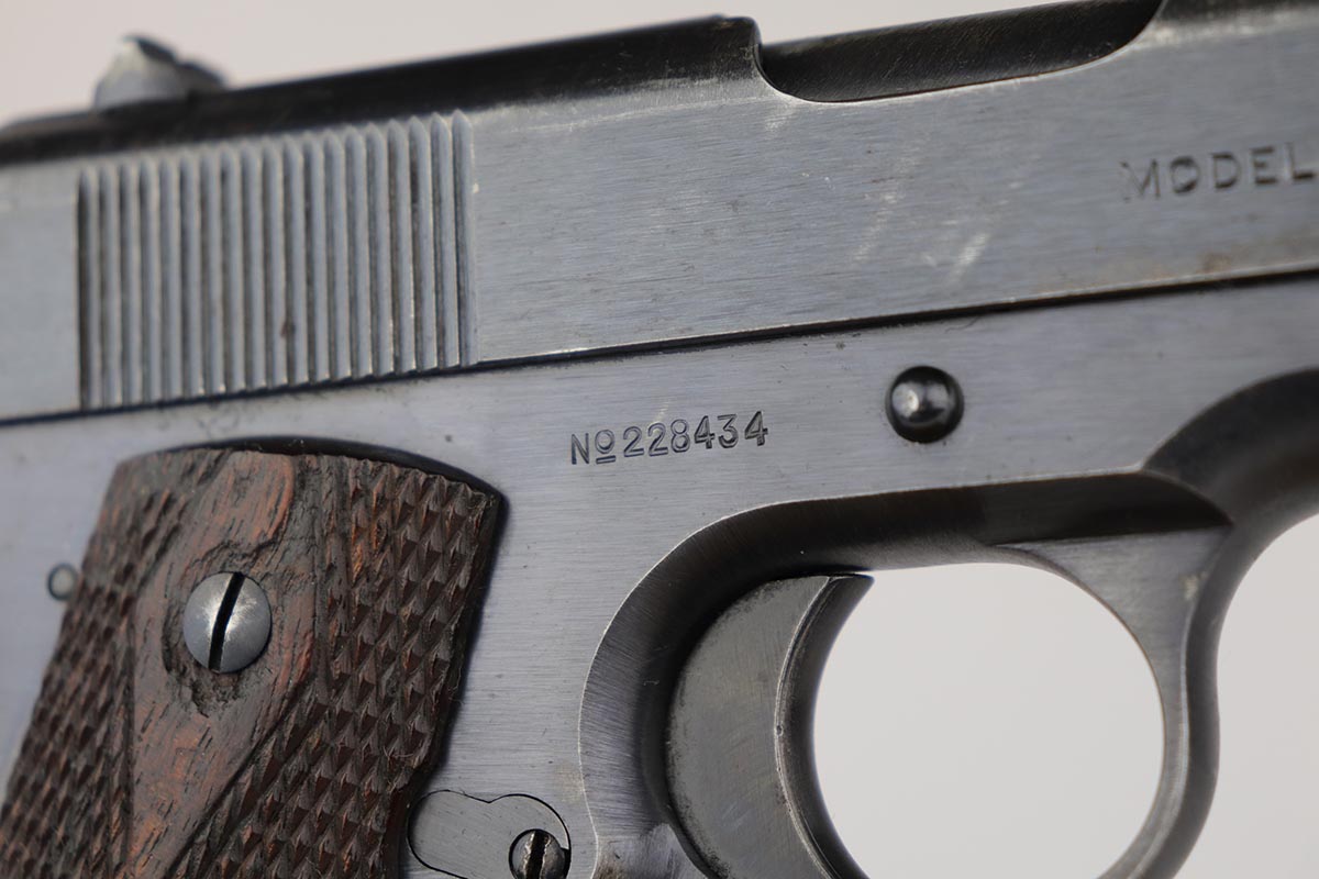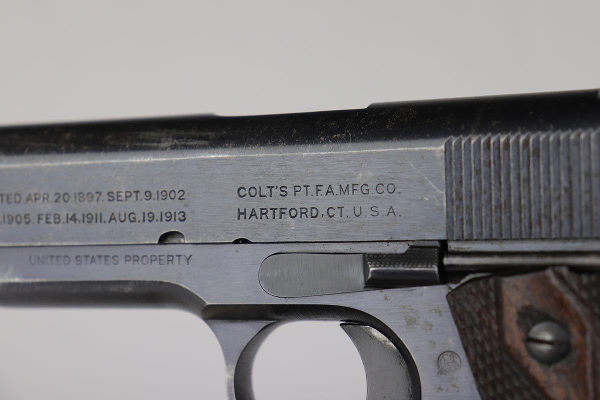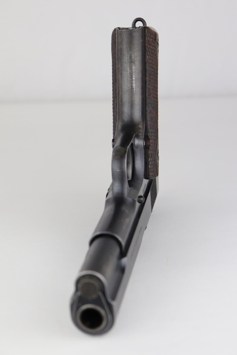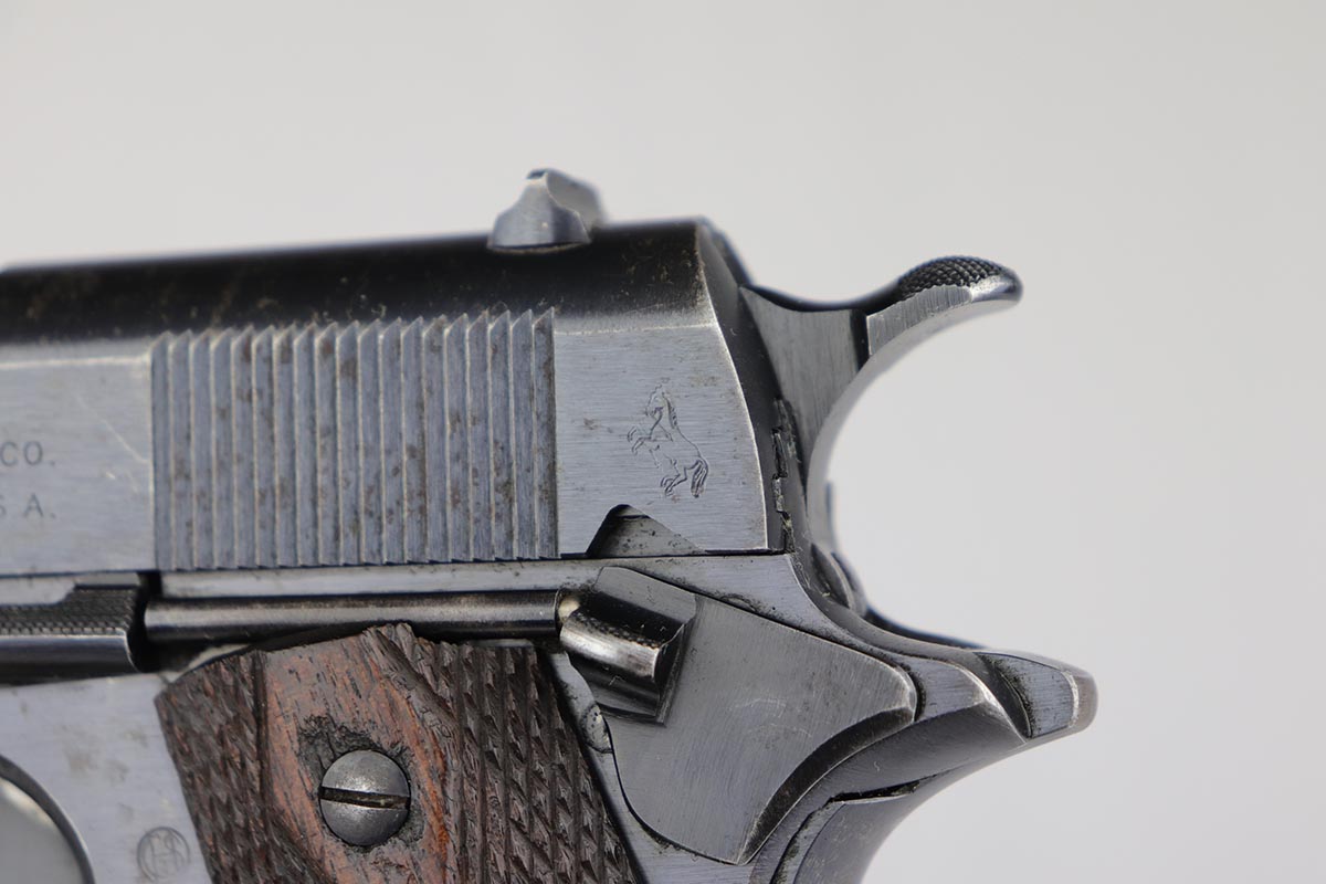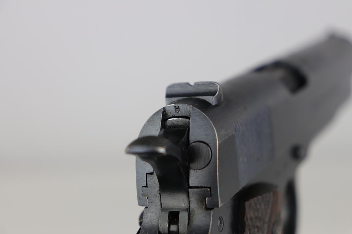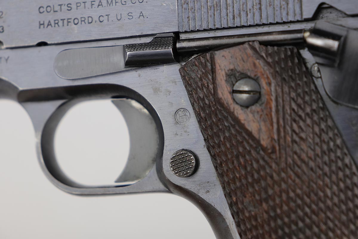 6/3/19 – This is an original Army issued Colt 1911 from the tail end of the Great War. Manufactured in 1918, the pistol retains about 80% blue with the most notable areas of finish loss being the straps and the top of the slide. The grips show age but no major cracks or chips. Bore is strong with good rifling. Barrel is P H marked. Back of slide is also ‘H’ marked.