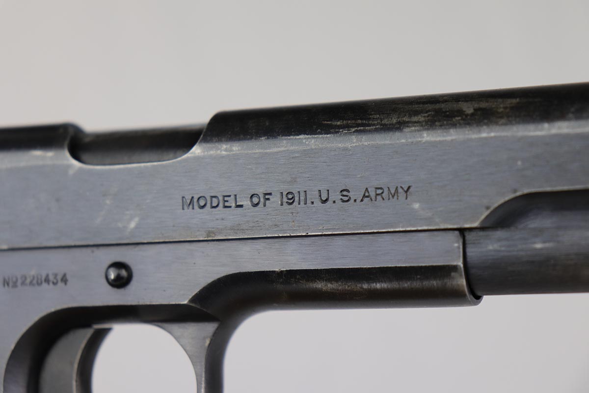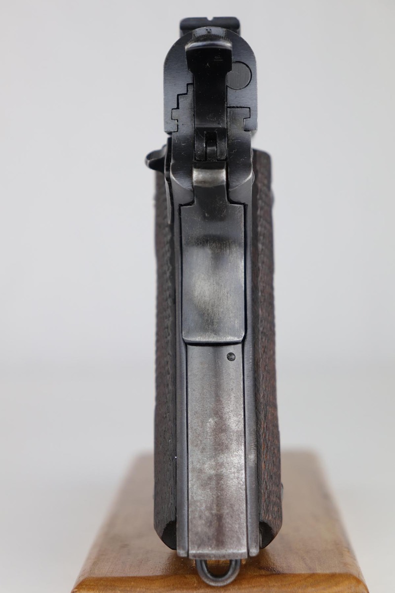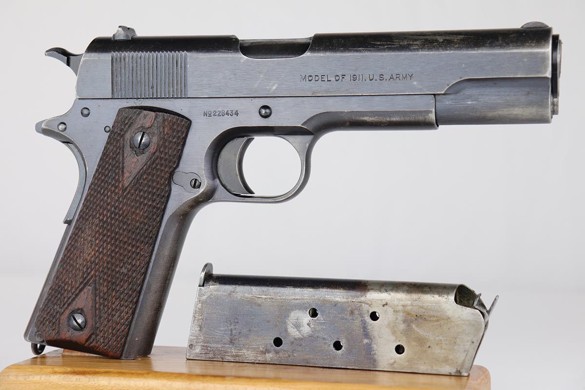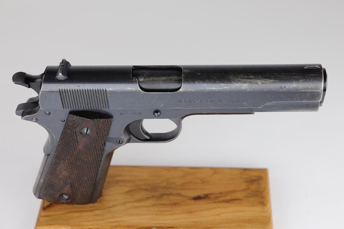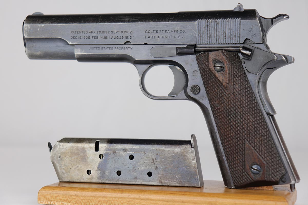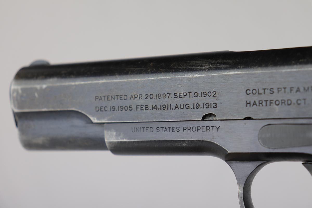 6/3/19 – This is an original Army issued Colt 1911 from the tail end of the Great War. Manufactured in 1918, the pistol retains about 80% blue with the most notable areas of finish loss being the straps and the top of the slide. The grips show age but no major cracks or chips. Bore is strong with good rifling. Barrel is P H marked. Back of slide is also ‘H’ marked.