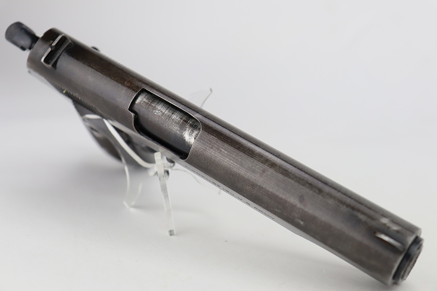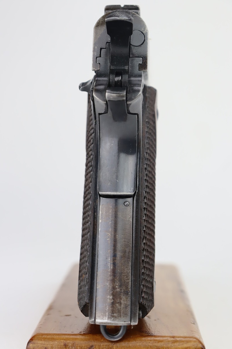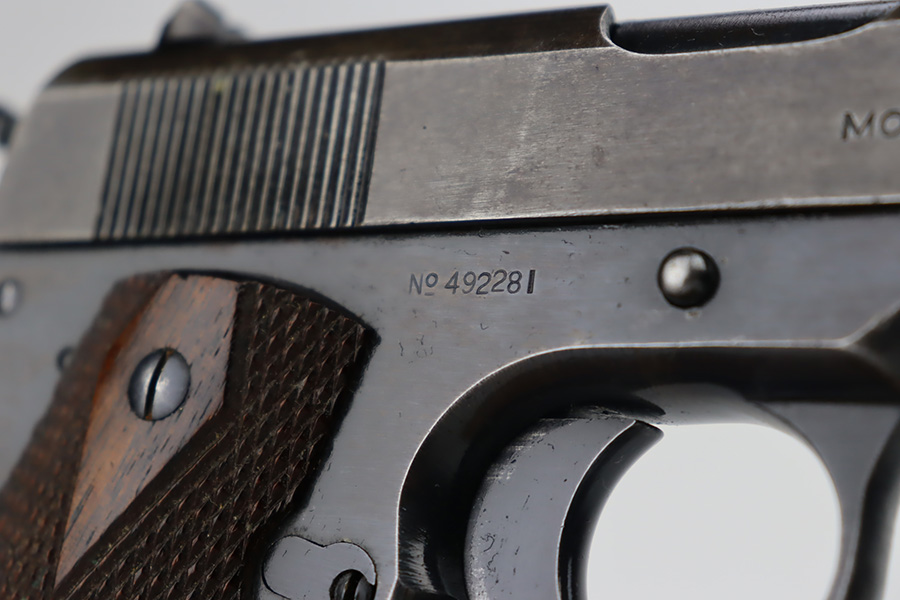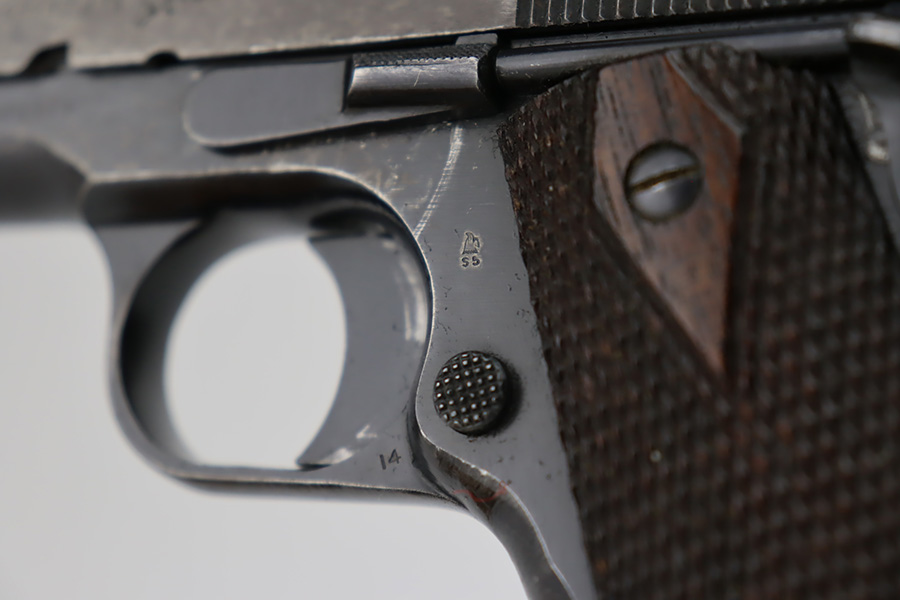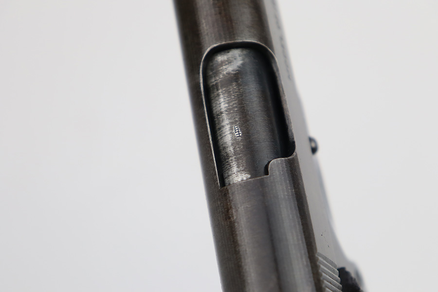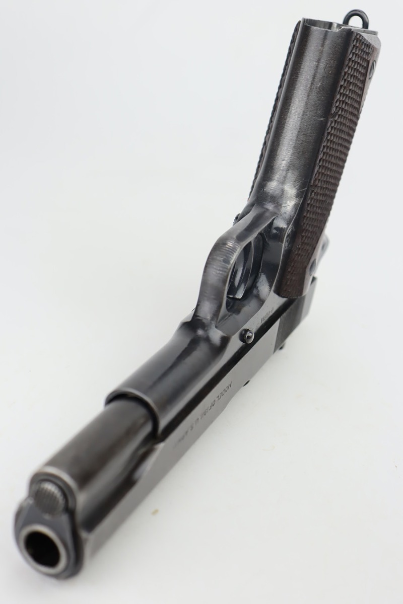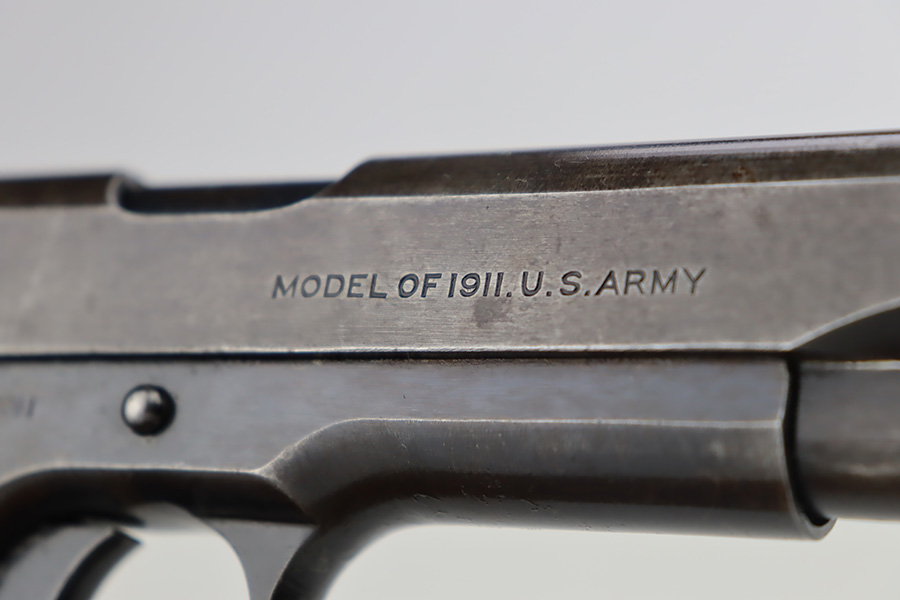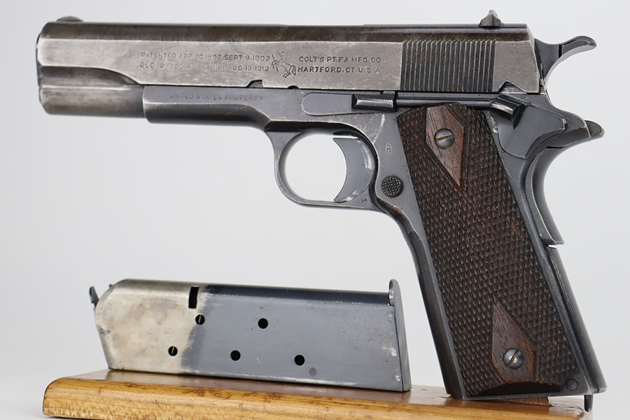 9/27/23 – This is an all original Colt Model 1911 that was issued to the U.S. military in 1918. It has the look of one that’s “been there, done that” as the finish is thin all along the slide and there is thinning on the front strap and mainspring housing. Proper barrel with intertwined HP marking and it has a strong, shiny bore. Excellent wood grips with no cracks. Proper two-tone mag.