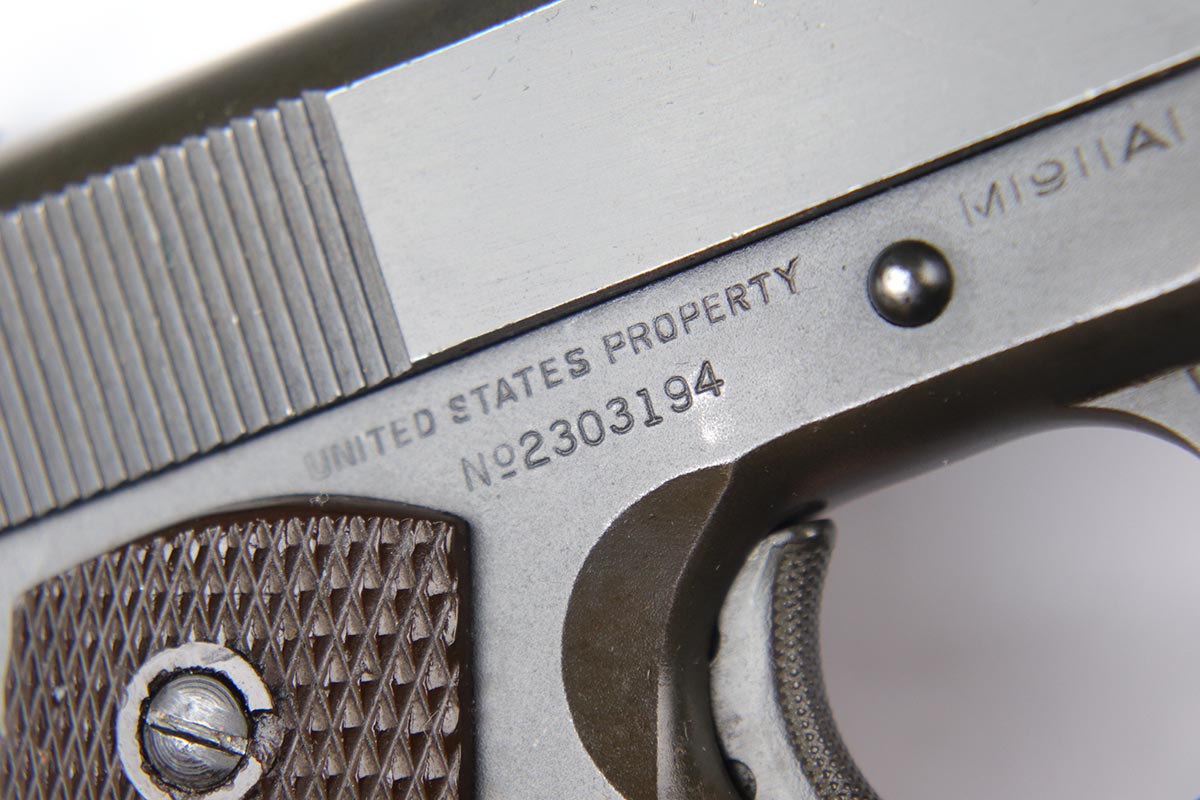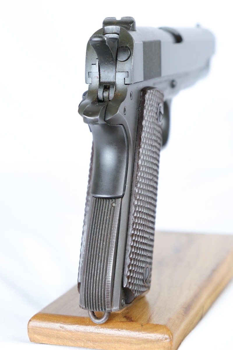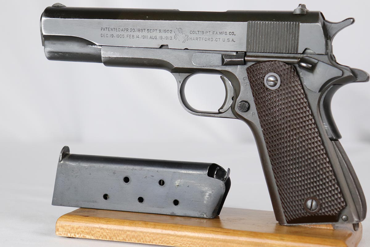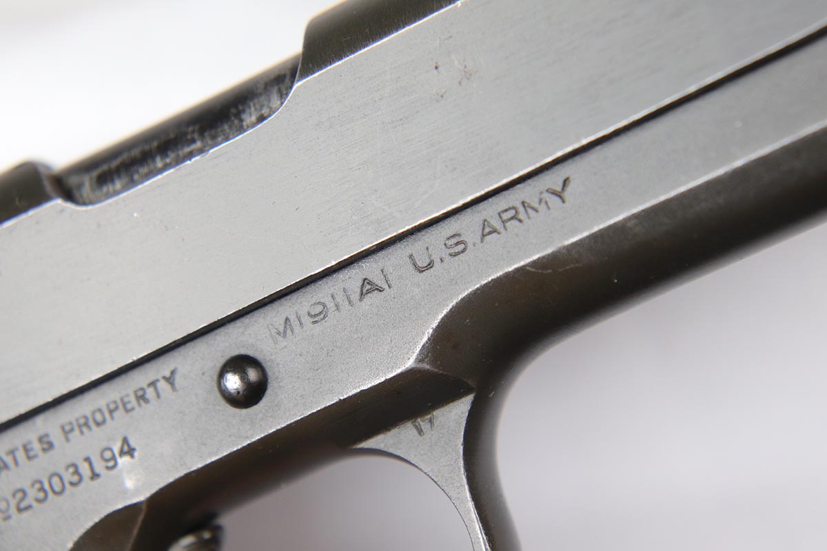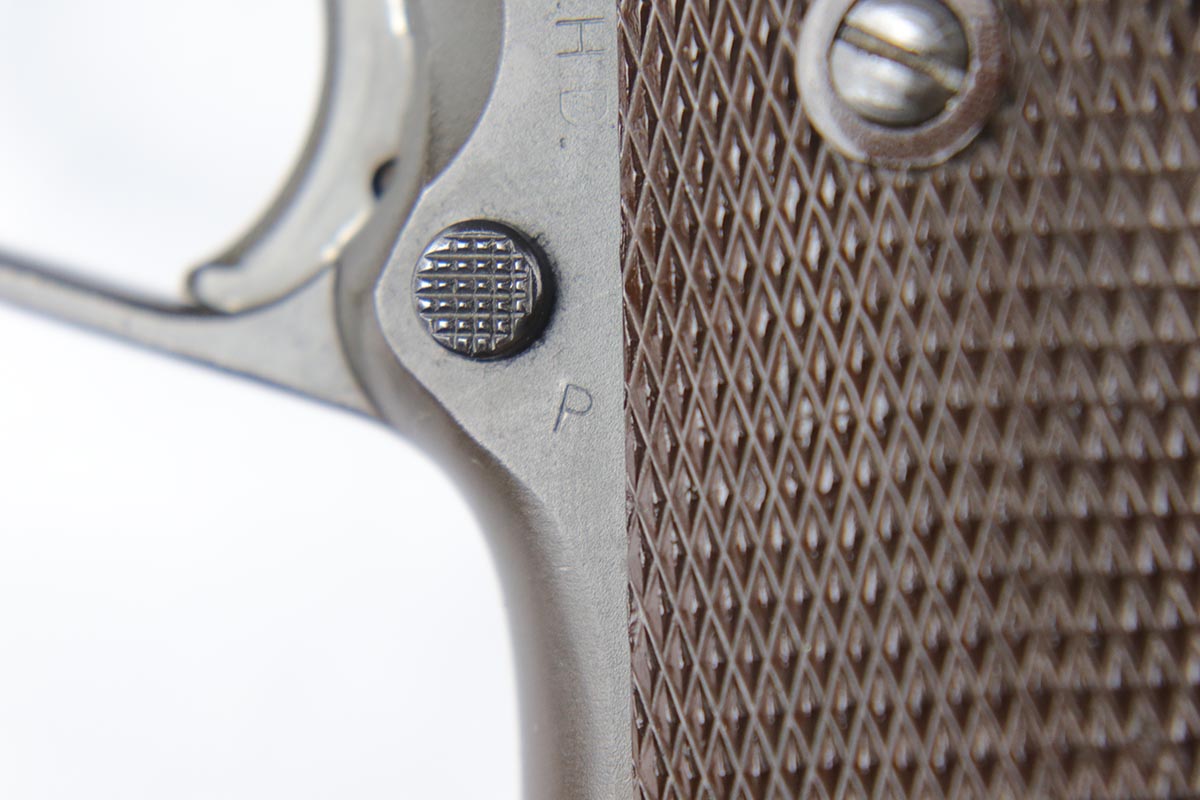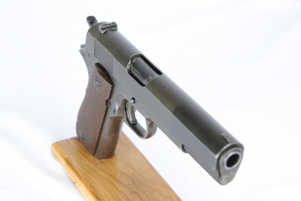 6/22/18 – This is an end-of-war Colt 1911A1, manufactured in 1945, in fully original condition.  There isn’t much bluing loss, just minor edge wear, but the finish has dulled throughout.  Proper GHD inspectors mark on frame and P proofs on frame and slide.  Excellent bore, and barrel is marked with P and C in square, which is correct for Colt’s this late.