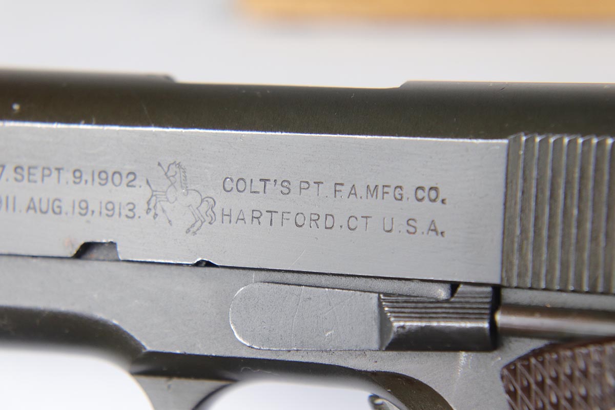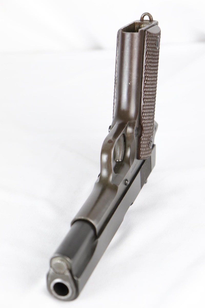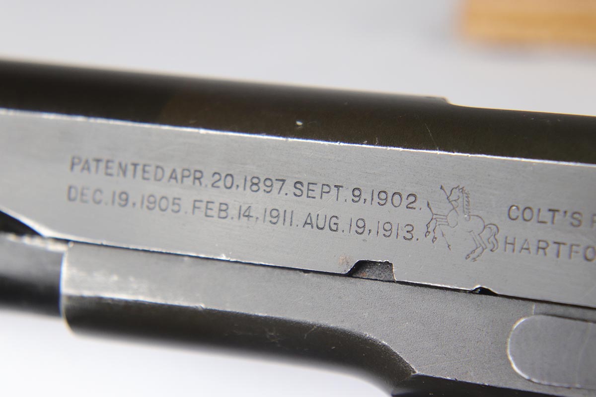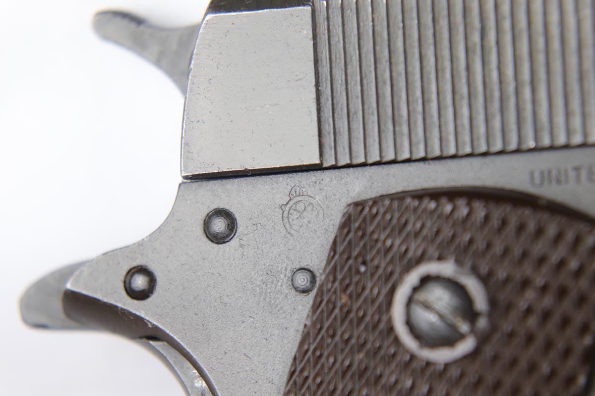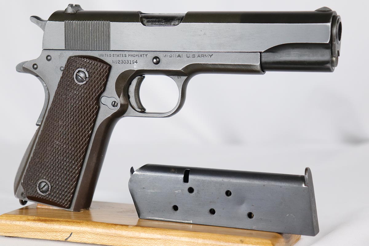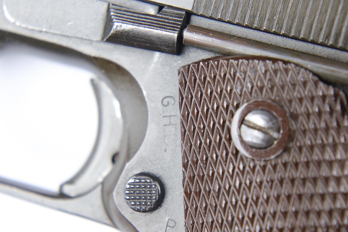 6/22/18 – This is an end-of-war Colt 1911A1, manufactured in 1945, in fully original condition.  There isn’t much bluing loss, just minor edge wear, but the finish has dulled throughout.  Proper GHD inspectors mark on frame and P proofs on frame and slide.  Excellent bore, and barrel is marked with P and C in square, which is correct for Colt’s this late.