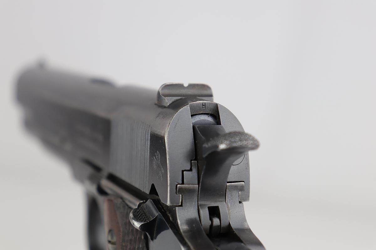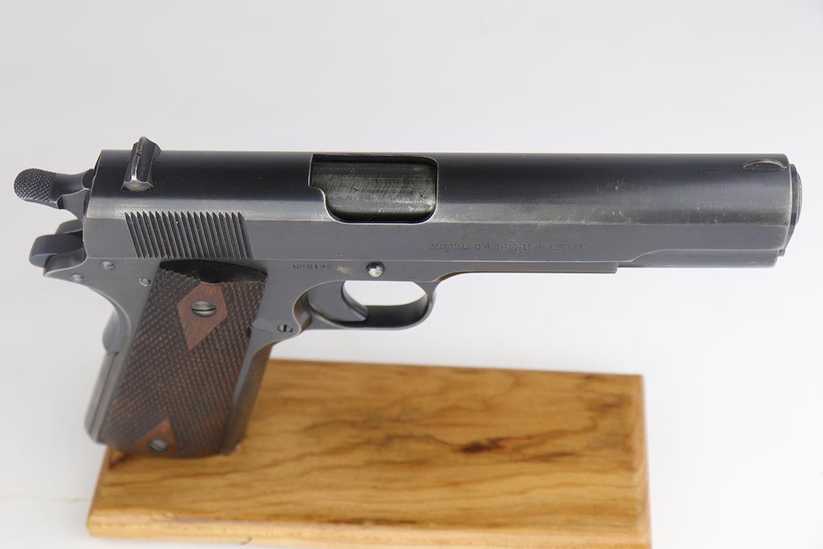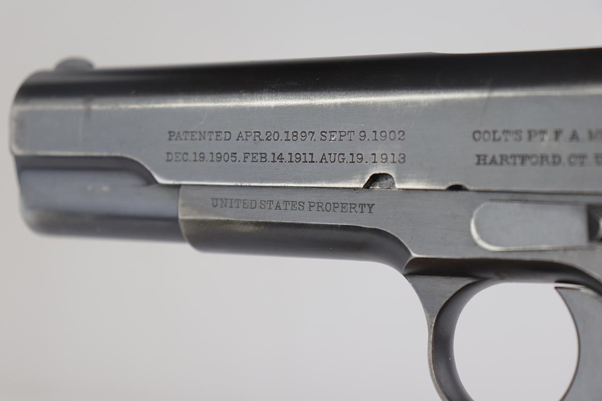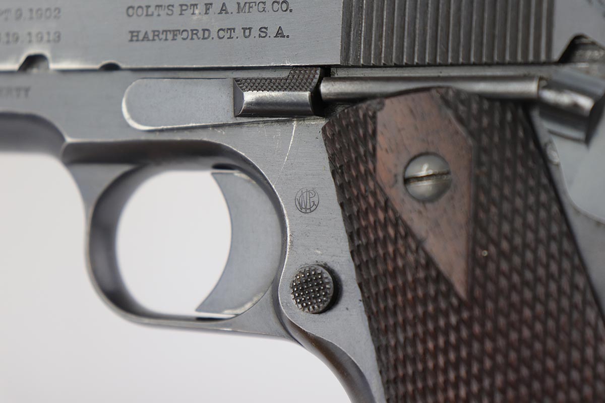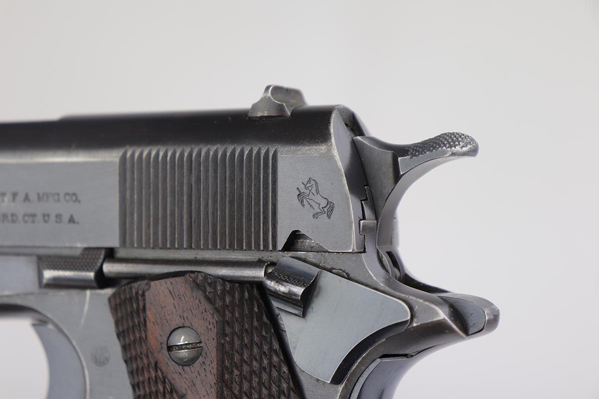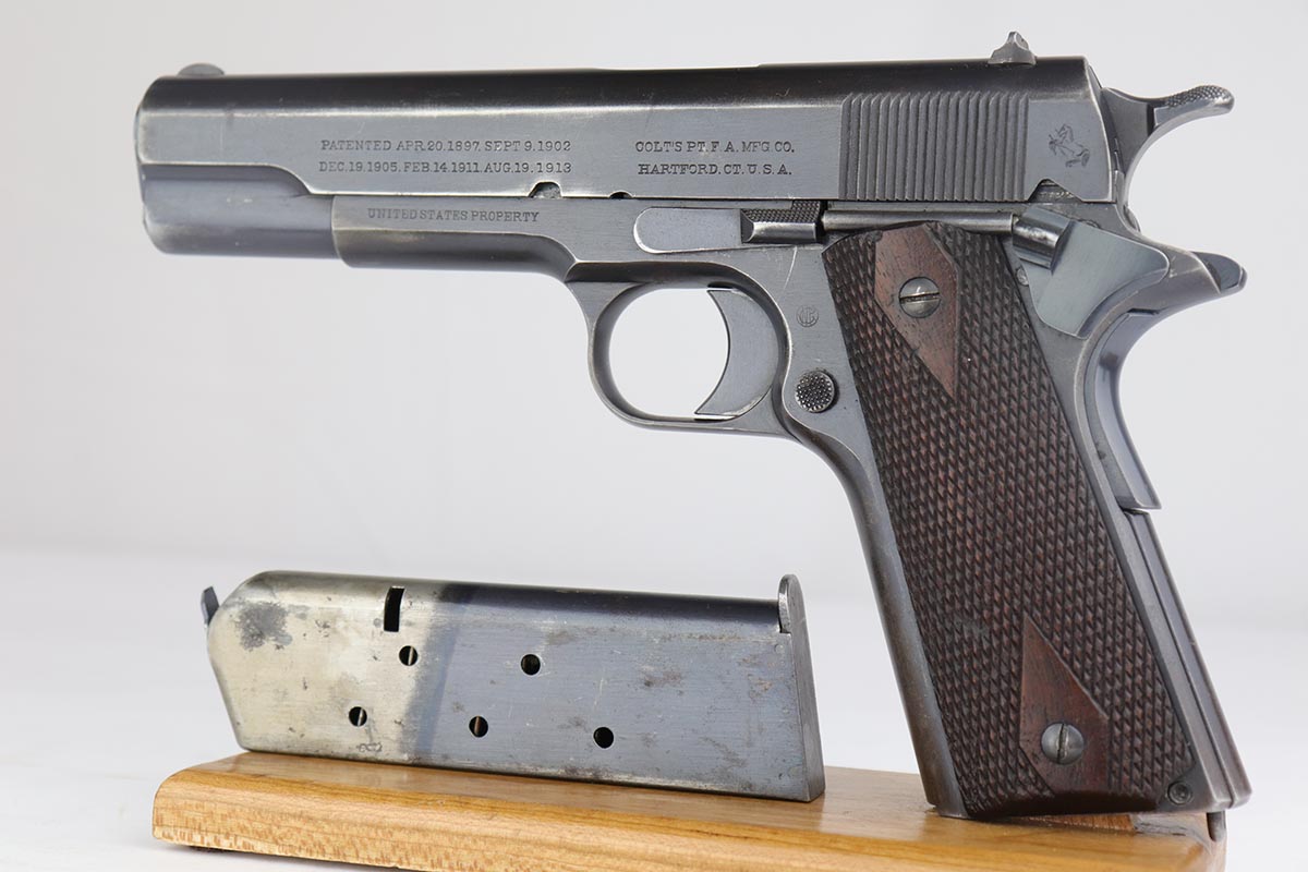 4/12/19 – This is an all original and correct Colt M1911 from 1914. The original brushed blue rates at about 80%, with a nice profile but the majority of the finish loss on the straps. Slide is properly ‘H’ marked and barrel is correct “P H”. Very nice grips with only minor handling wear. Strong barrel with minor frost. Two-tone magazine.