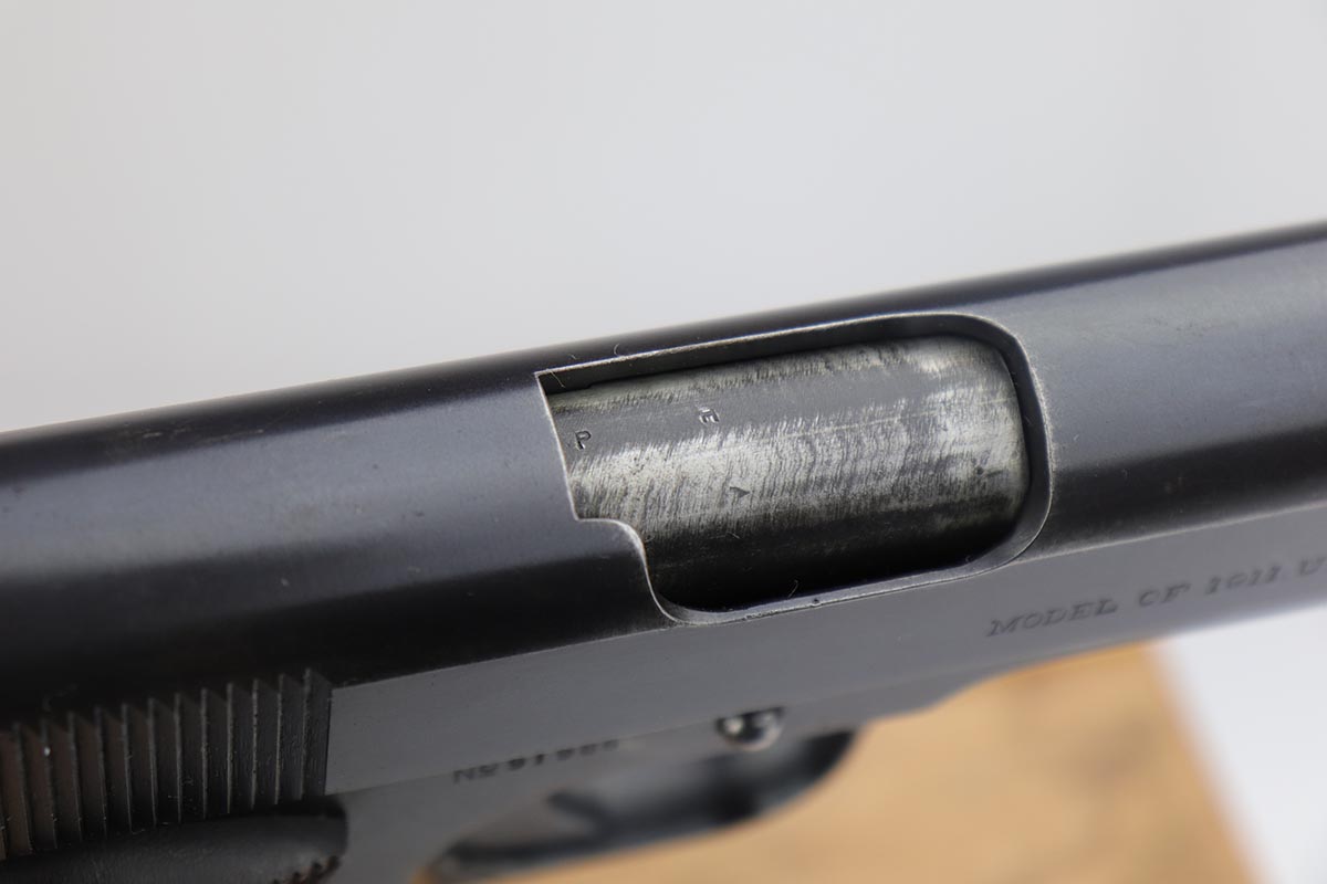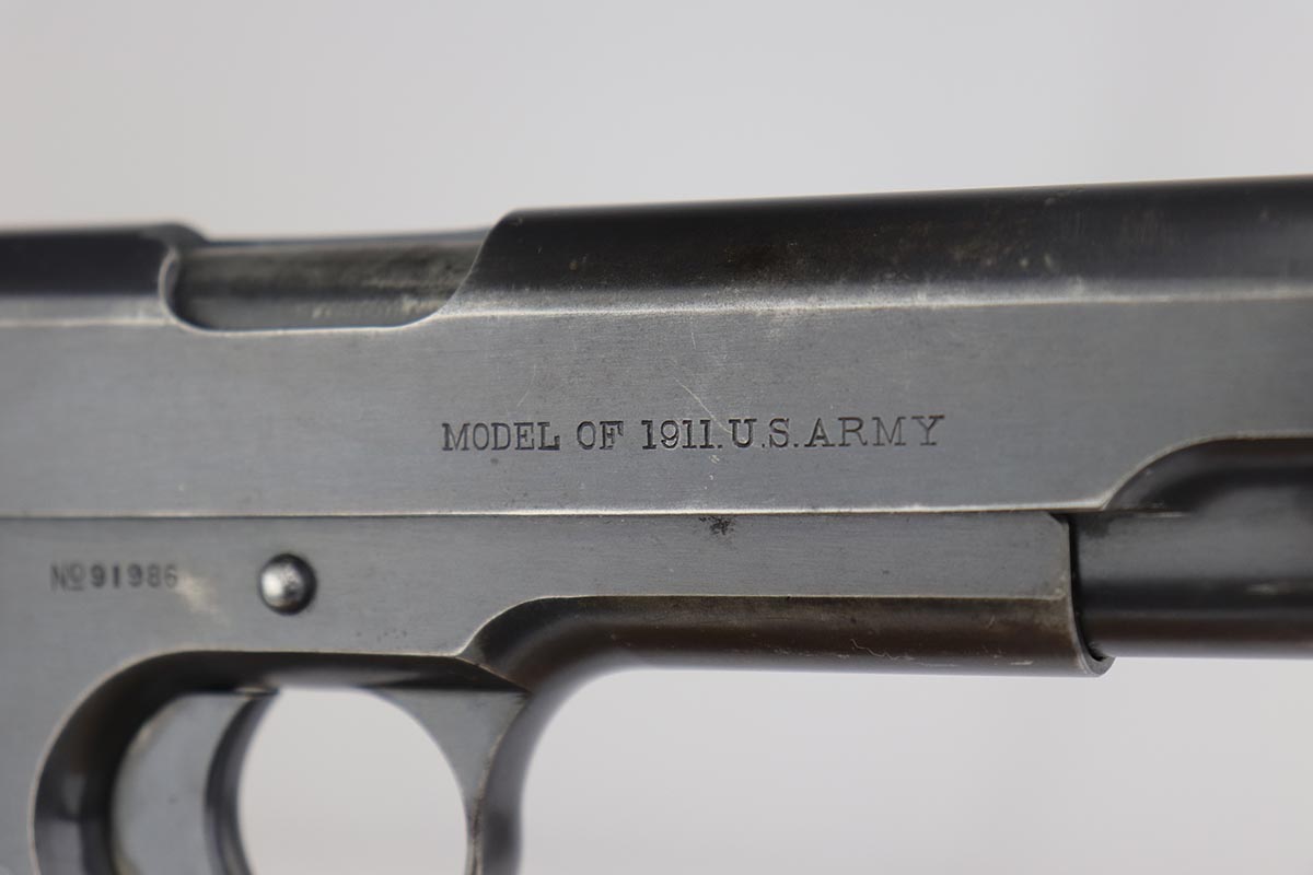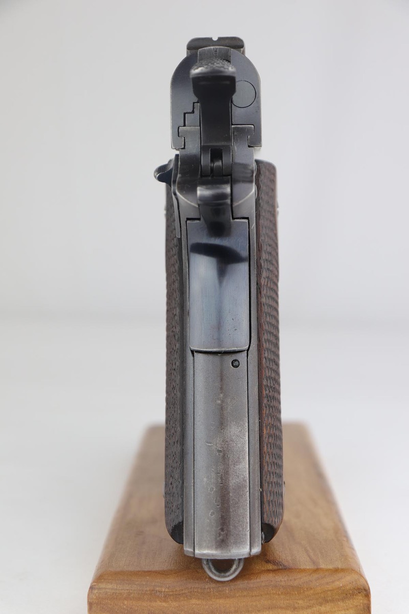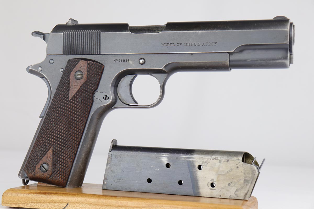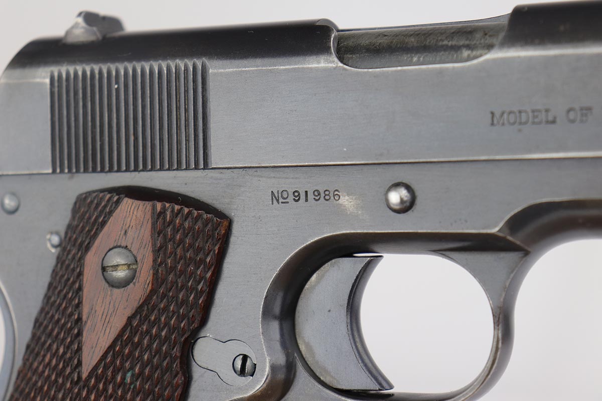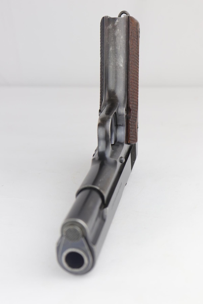 4/12/19 – This is an all original and correct Colt M1911 from 1914. The original brushed blue rates at about 80%, with a nice profile but the majority of the finish loss on the straps. Slide is properly ‘H’ marked and barrel is correct “P H”. Very nice grips with only minor handling wear. Strong barrel with minor frost. Two-tone magazine.