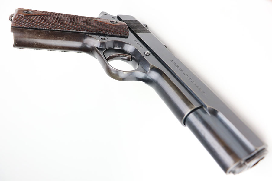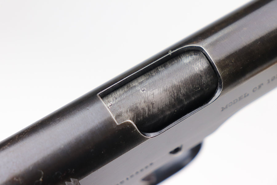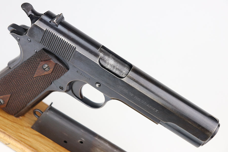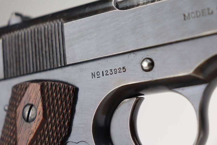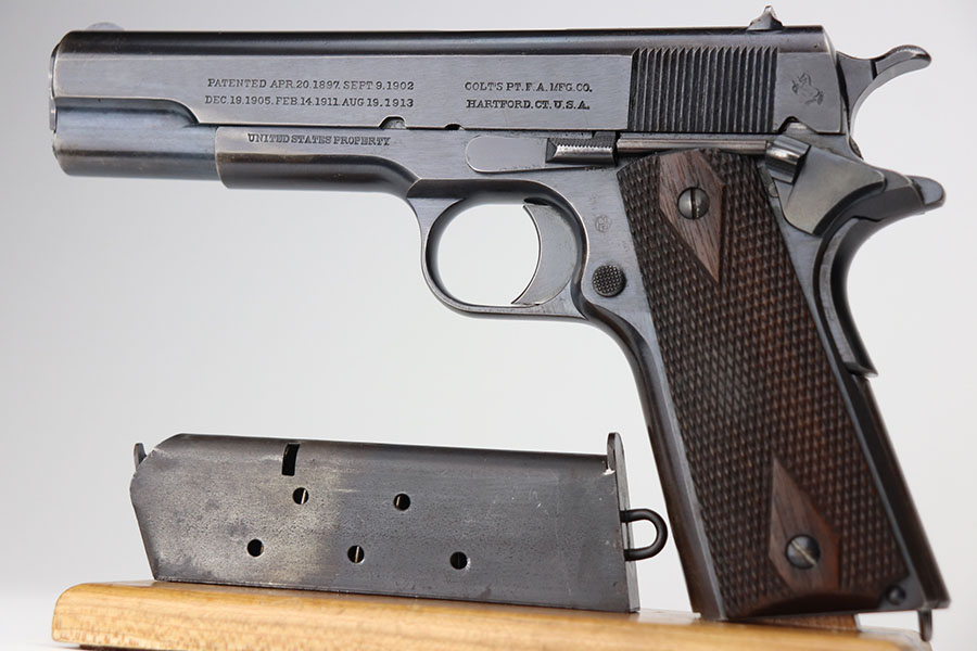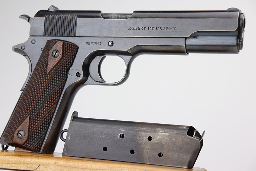 1/26/21 – This is an original Colt 1911 from 1915 that was issued to the US Army. Only about 11,000 Colt 1911s were produced in 1915, which is the lowest military production total for any year other than 1916. It has about 85% of the original blue remaining, with an excellent profile but most of the finish loss and patina on the front strap and mainspring housing. ‘H’ marked slide with disconnected ‘P H’ marked barrel. Terrific bore and excellent grips. Two-tone magazine with lanyard ring.