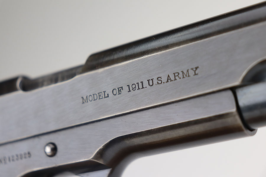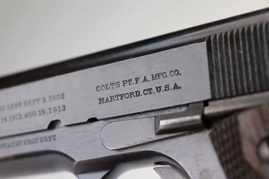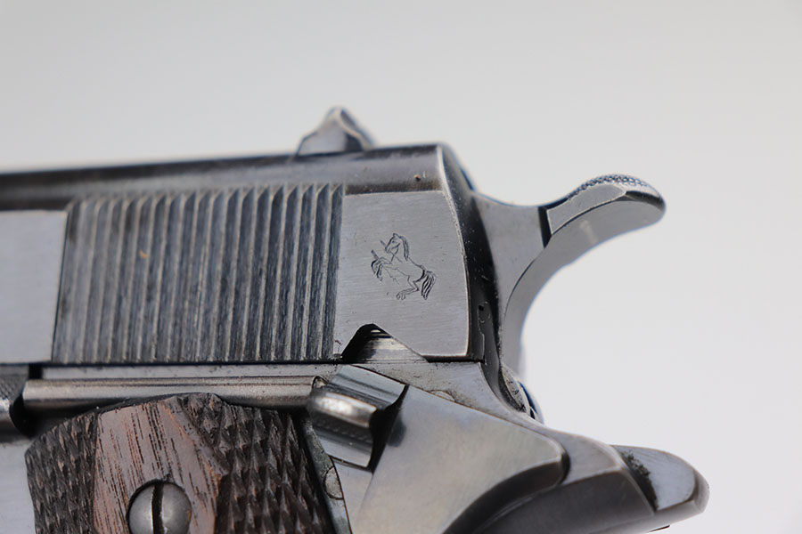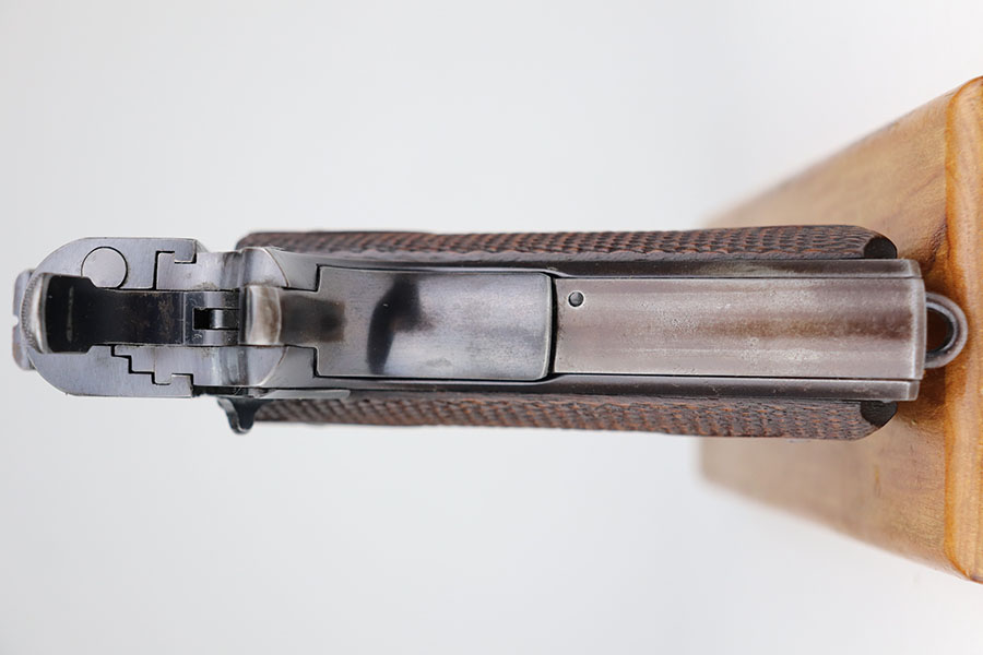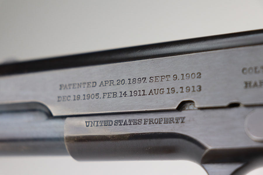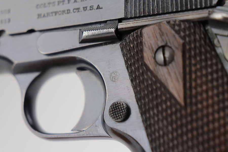 1/26/21 – This is an original Colt 1911 from 1915 that was issued to the US Army. Only about 11,000 Colt 1911s were produced in 1915, which is the lowest military production total for any year other than 1916. It has about 85% of the original blue remaining, with an excellent profile but most of the finish loss and patina on the front strap and mainspring housing. ‘H’ marked slide with disconnected ‘P H’ marked barrel. Terrific bore and excellent grips. Two-tone magazine with lanyard ring.