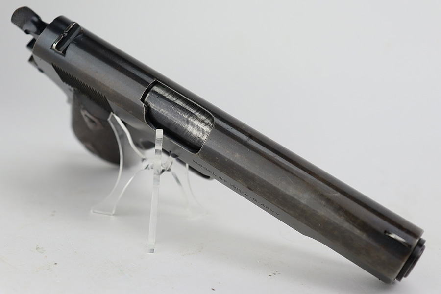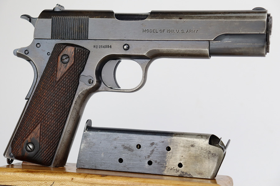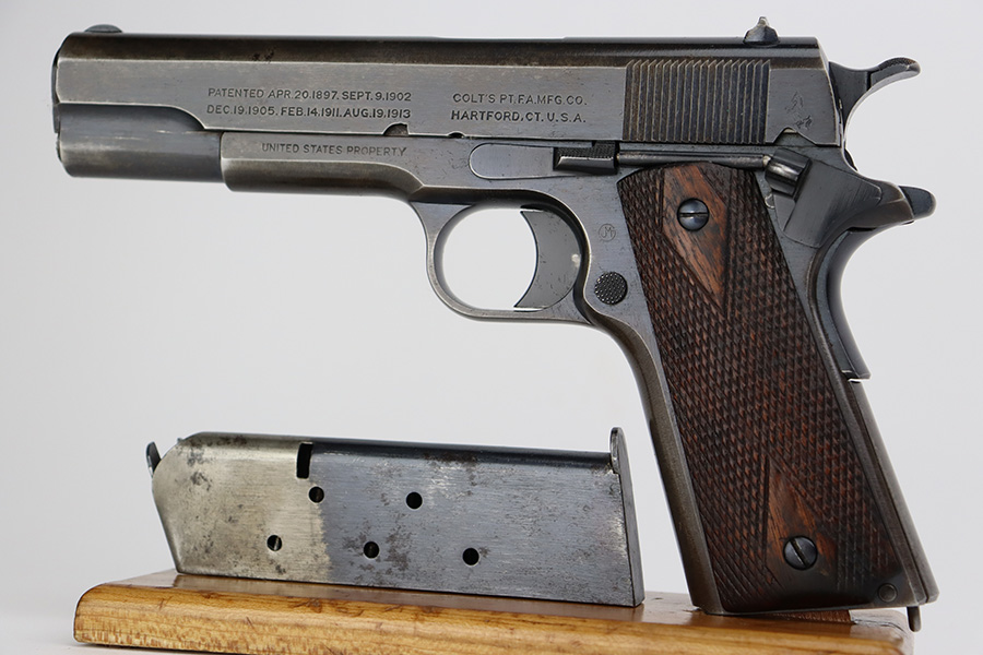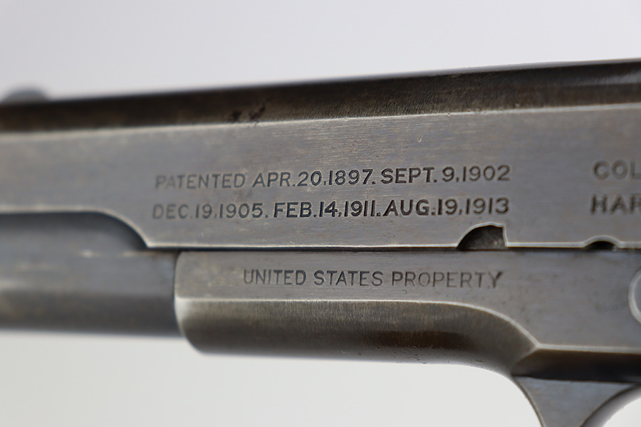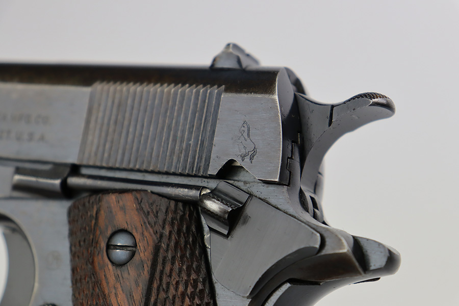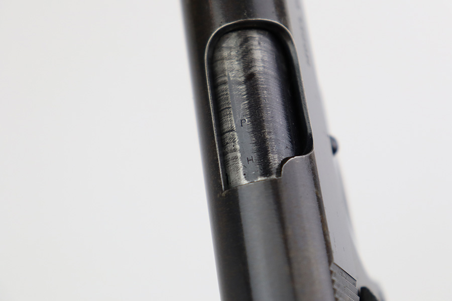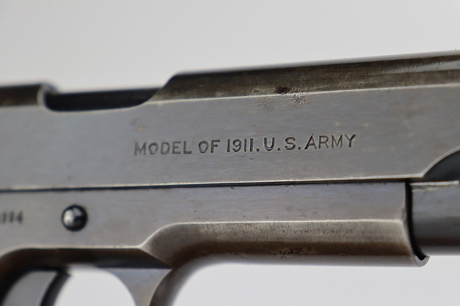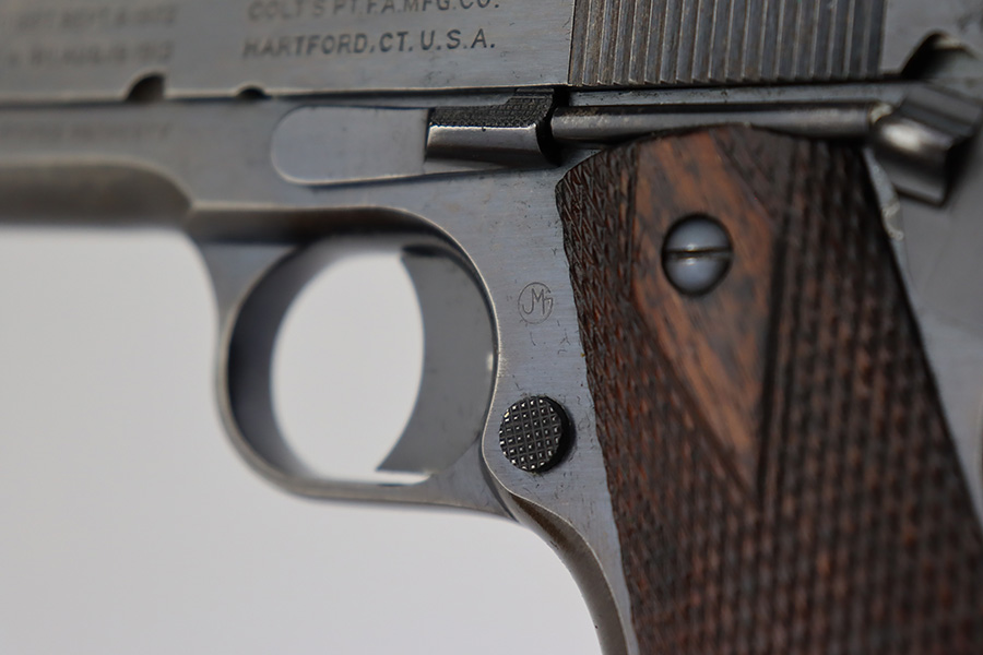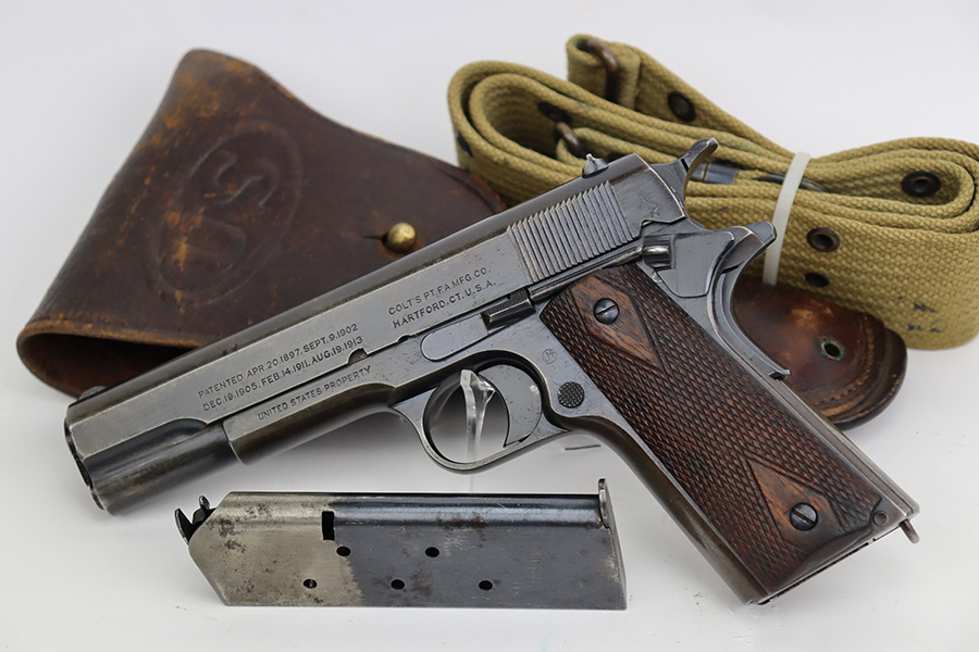 7/7/23 – This is an original Army-issued Colt M1911 from early in 1918. All original finish and parts with proper disconnected ‘P H’ barrel. The pistol shows obvious finish loss throughout, most notably on the front strap and mainspring housing. Excellent, shiny bore. Nice, original wood grips with no cracks or chips. Smooth mechanical function. Proper two-tone magazine. Comes with canvas belt that has a faded inkstamp, and a 1918-dated Boyt holster that is also marked ‘J.C.Y.’