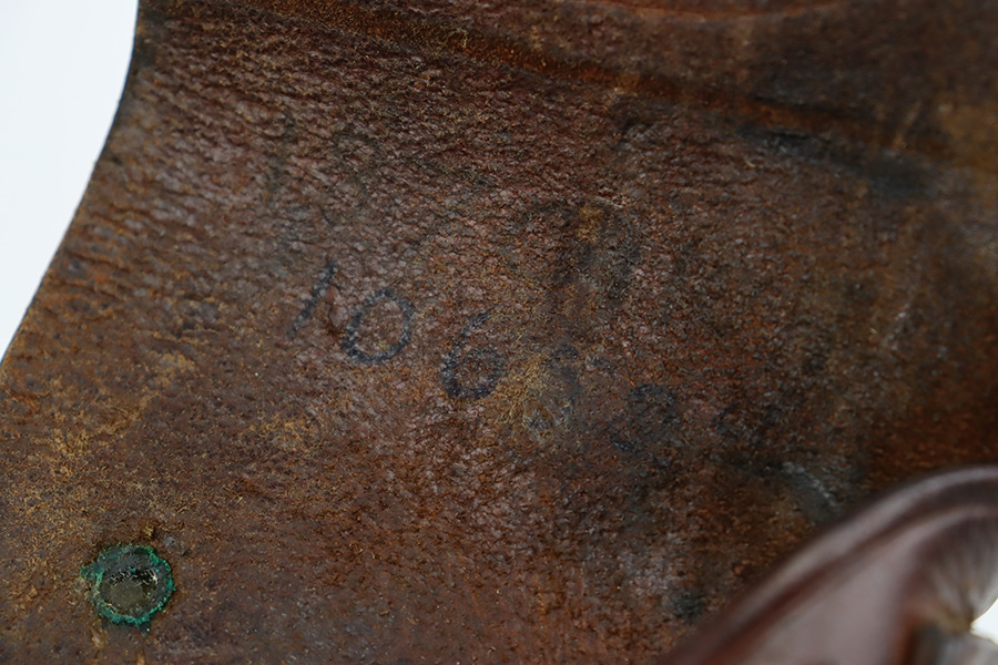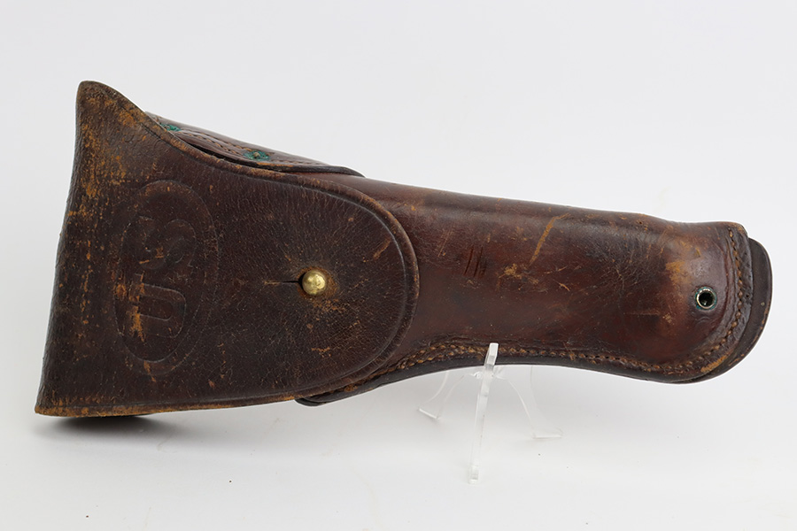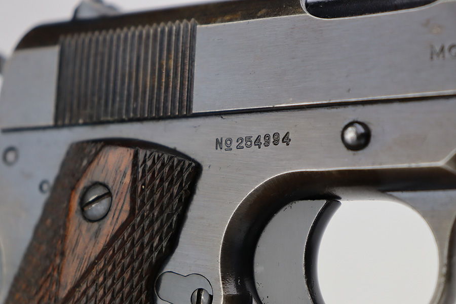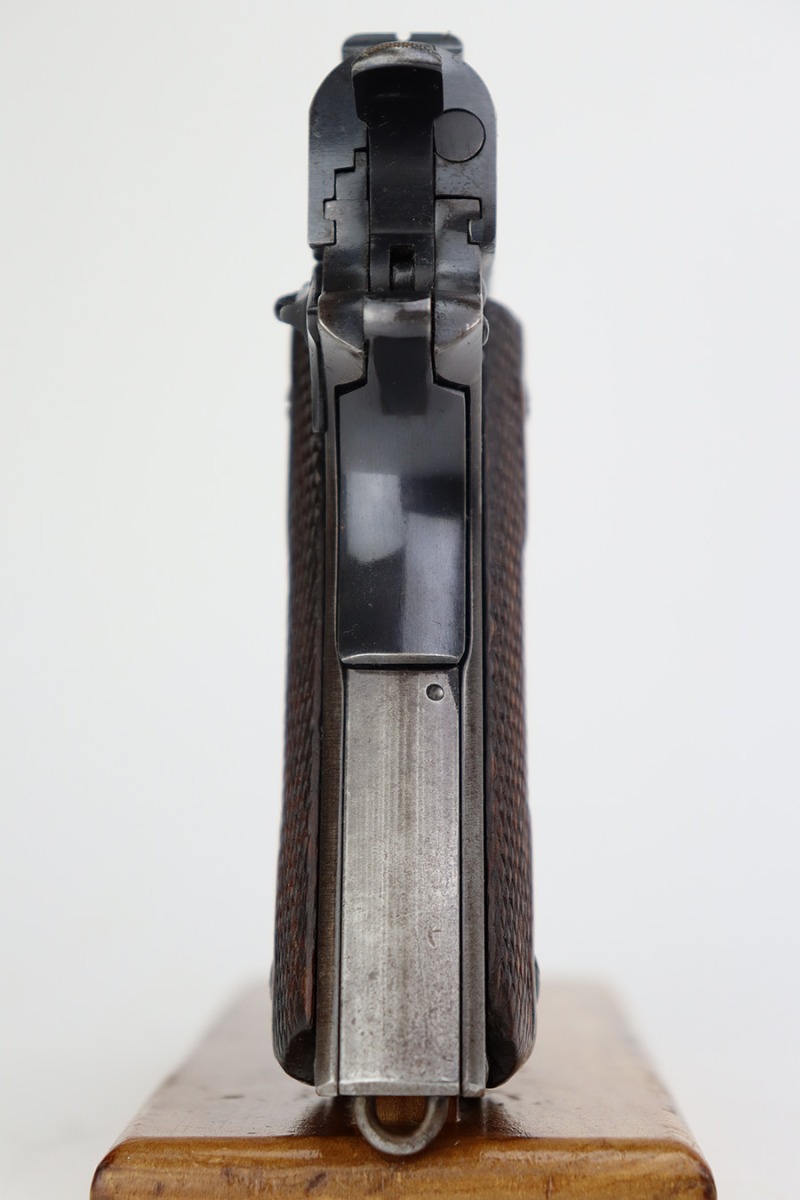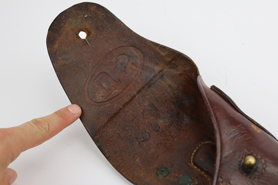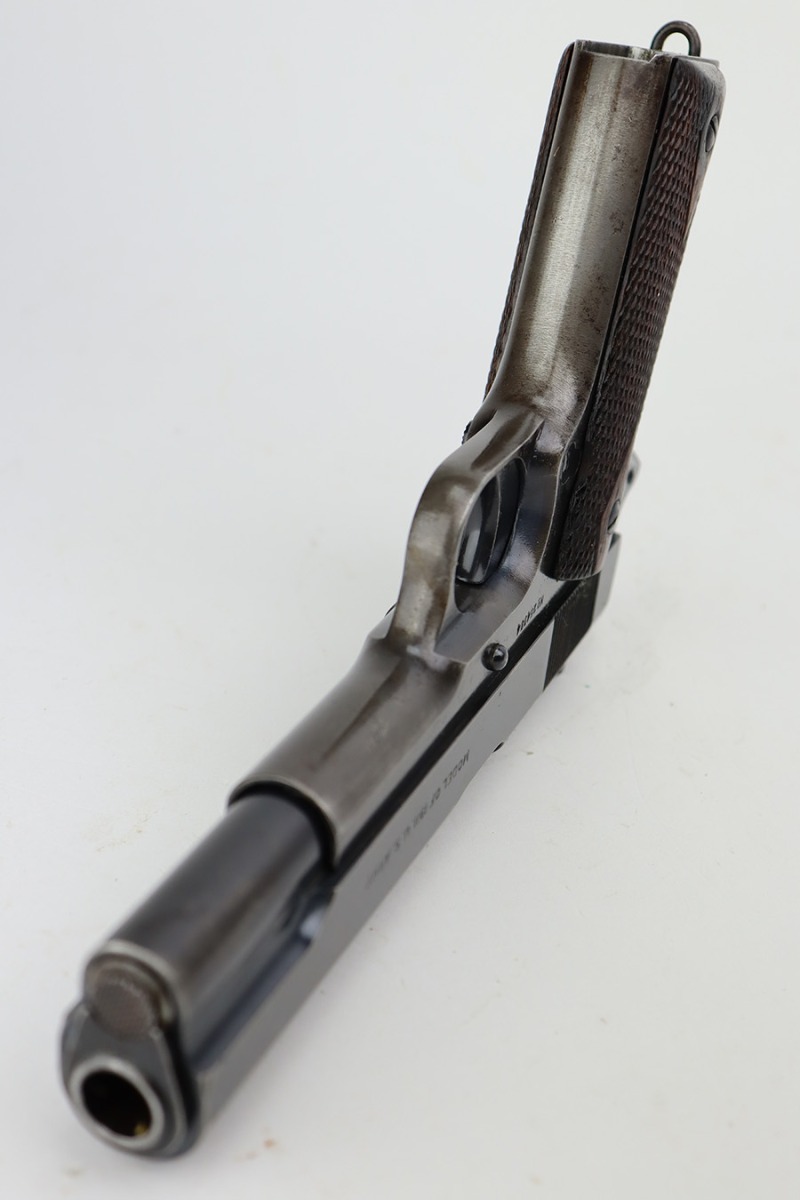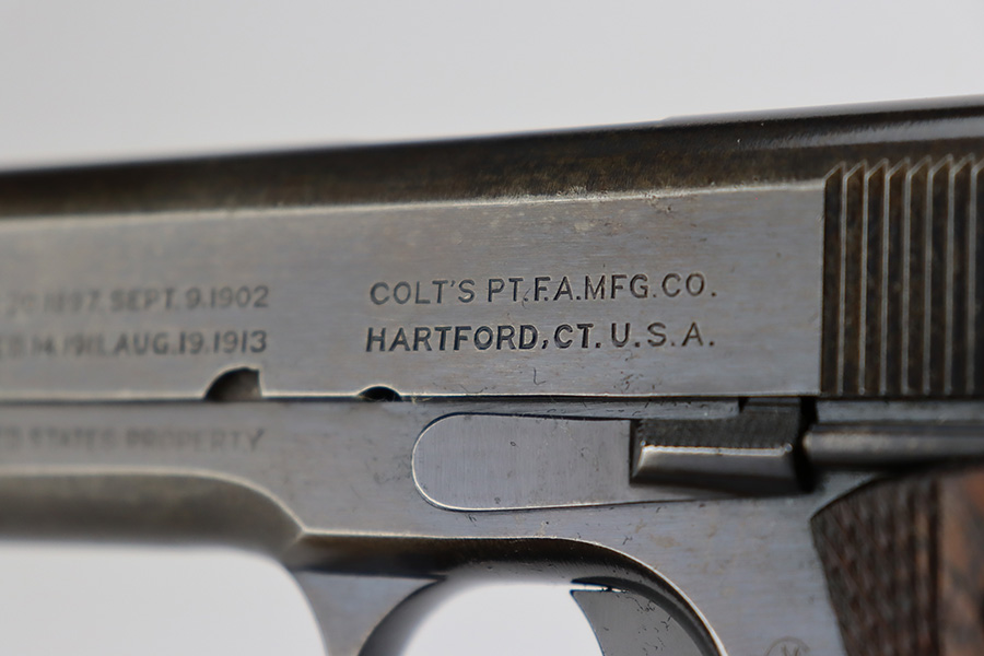 7/7/23 – This is an original Army-issued Colt M1911 from early in 1918. All original finish and parts with proper disconnected ‘P H’ barrel. The pistol shows obvious finish loss throughout, most notably on the front strap and mainspring housing. Excellent, shiny bore. Nice, original wood grips with no cracks or chips. Smooth mechanical function. Proper two-tone magazine. Comes with canvas belt that has a faded inkstamp, and a 1918-dated Boyt holster that is also marked ‘J.C.Y.’