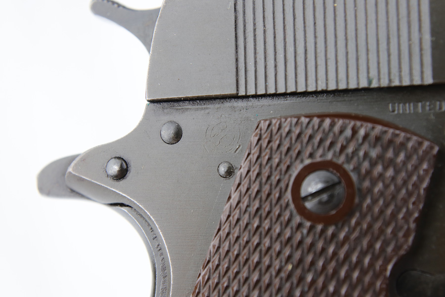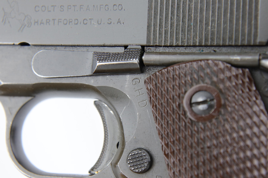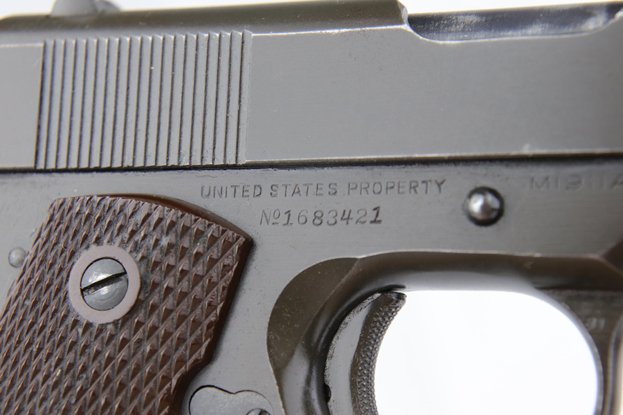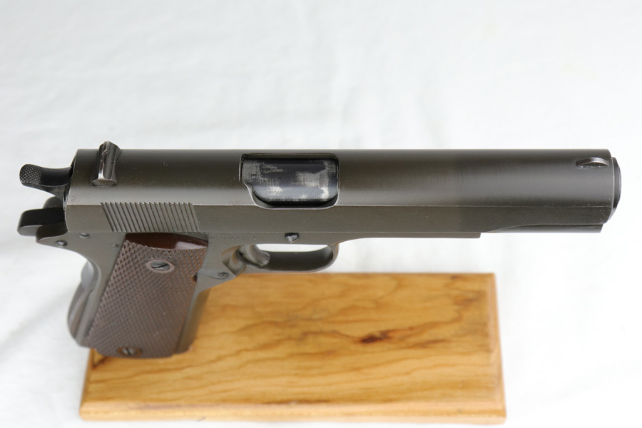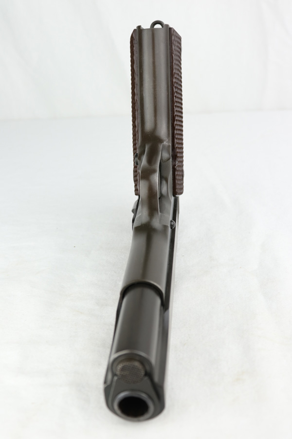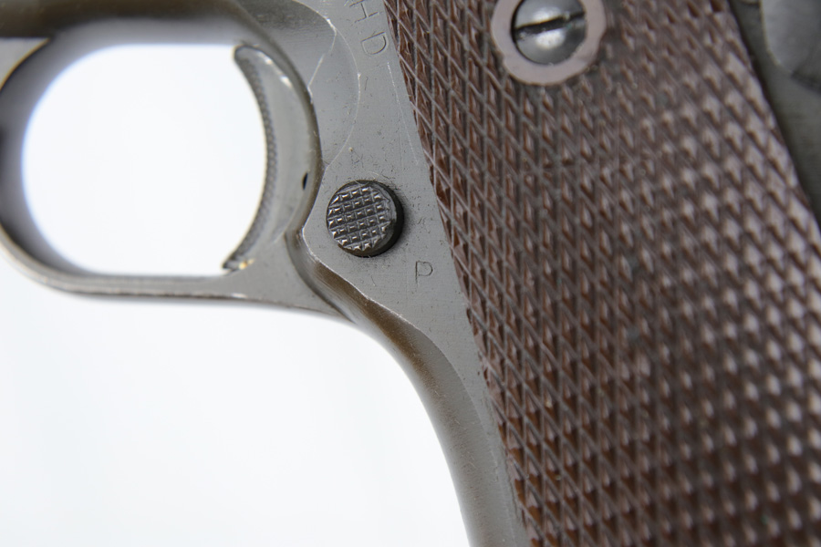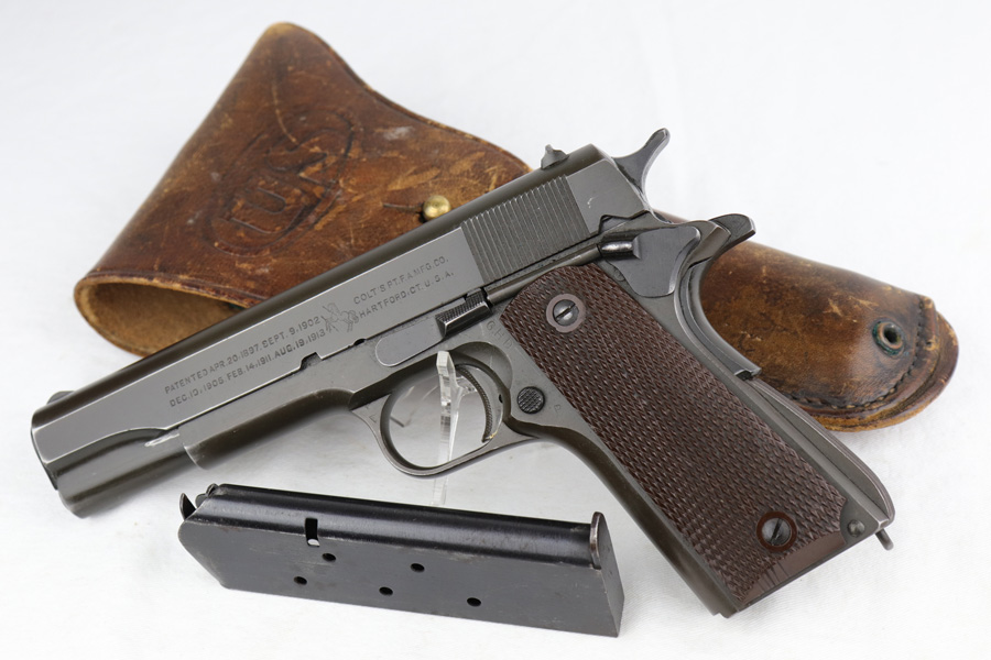 1/7/19 – This is a M1911A1 Colt from World War II. The original parkerized finish is about 95%, with normal holster wear. It was manufactured in 1944 and has all original parts. It is G.H.D. (Guy H. Drewry) inspector marked. Correct Colt .45 marked barrel. The bore has strong rifling, but is lightly frosted in the grooves. Correct grips and magazine. Comes with WWII original Boyt holster.